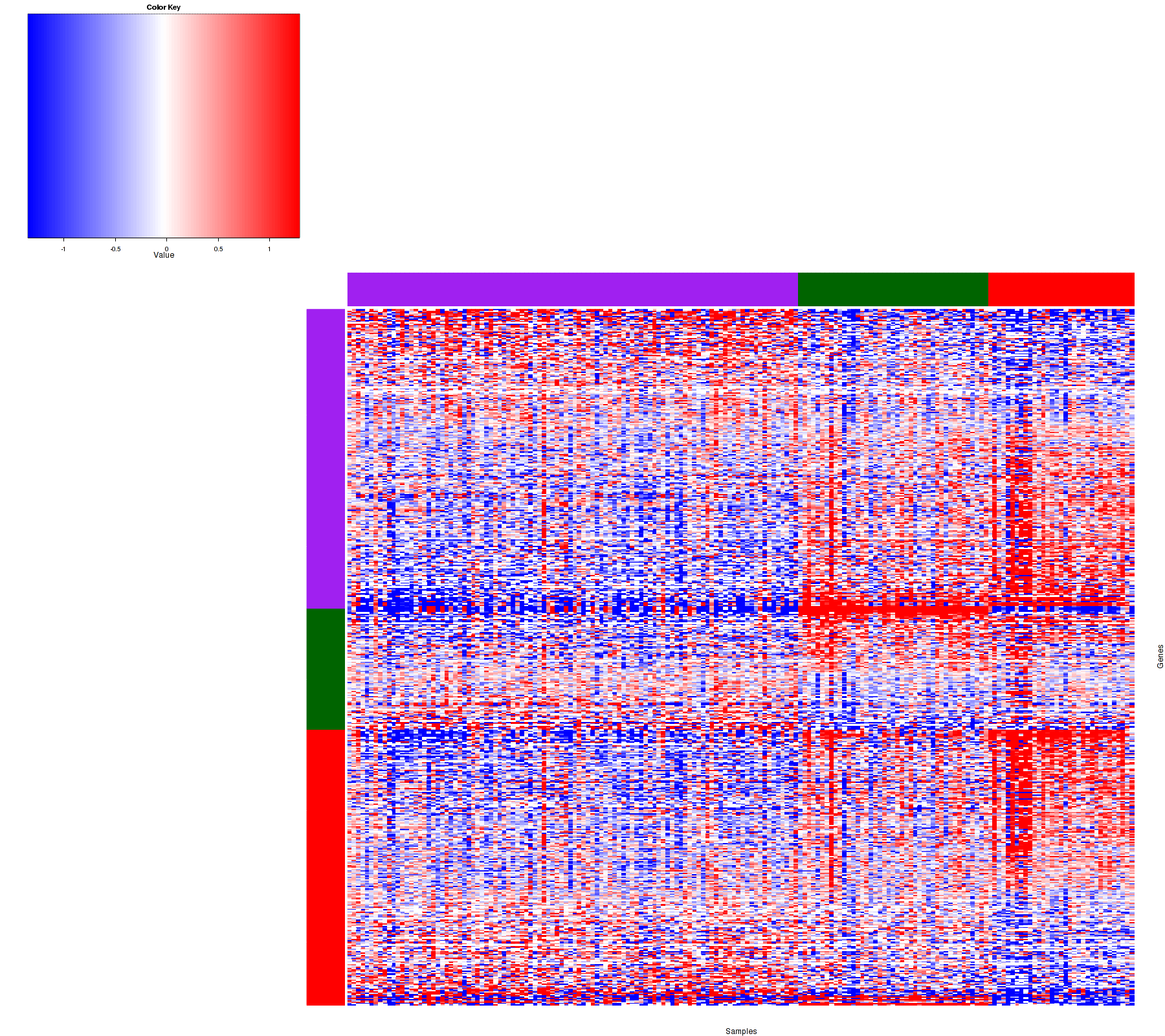 Figure 1. Get High-res Image Samples were separated into 3 clusters. Shown are 178 samples and 535 marker miRs. The color bar of the row indicates the marker miRs for the corresponding cluster.