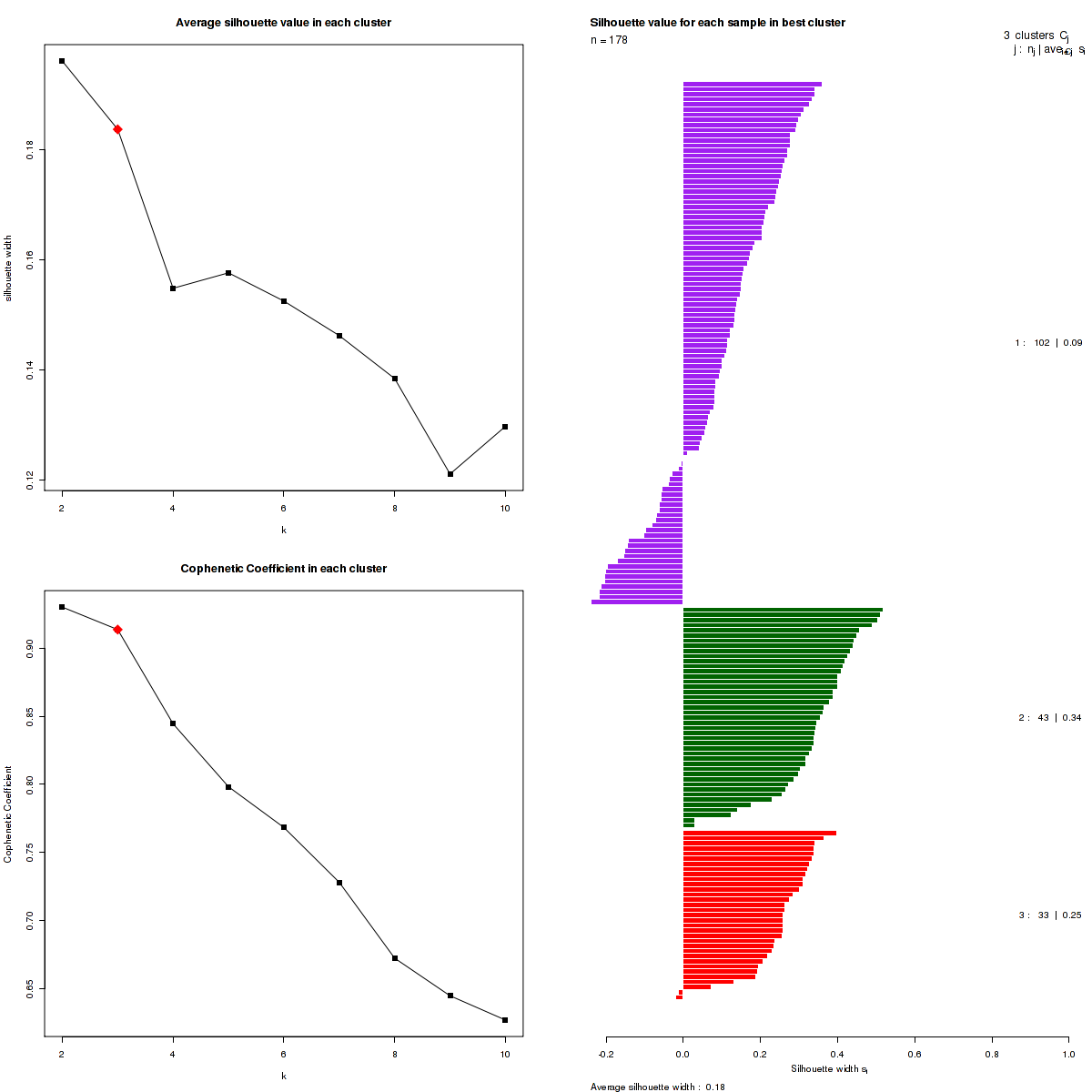 The cophenetic correlation coefficients and average silhouette values are used to determine the k with the most robust clusterings. From the plot of cophenetic correlation versus k, we select modes and the the point preceding the greatest decrease in cophenetic correlation coefficient, and from these choose the k with the highest average silhouette value.