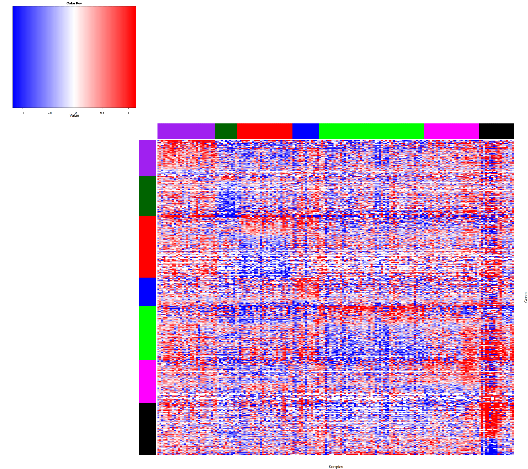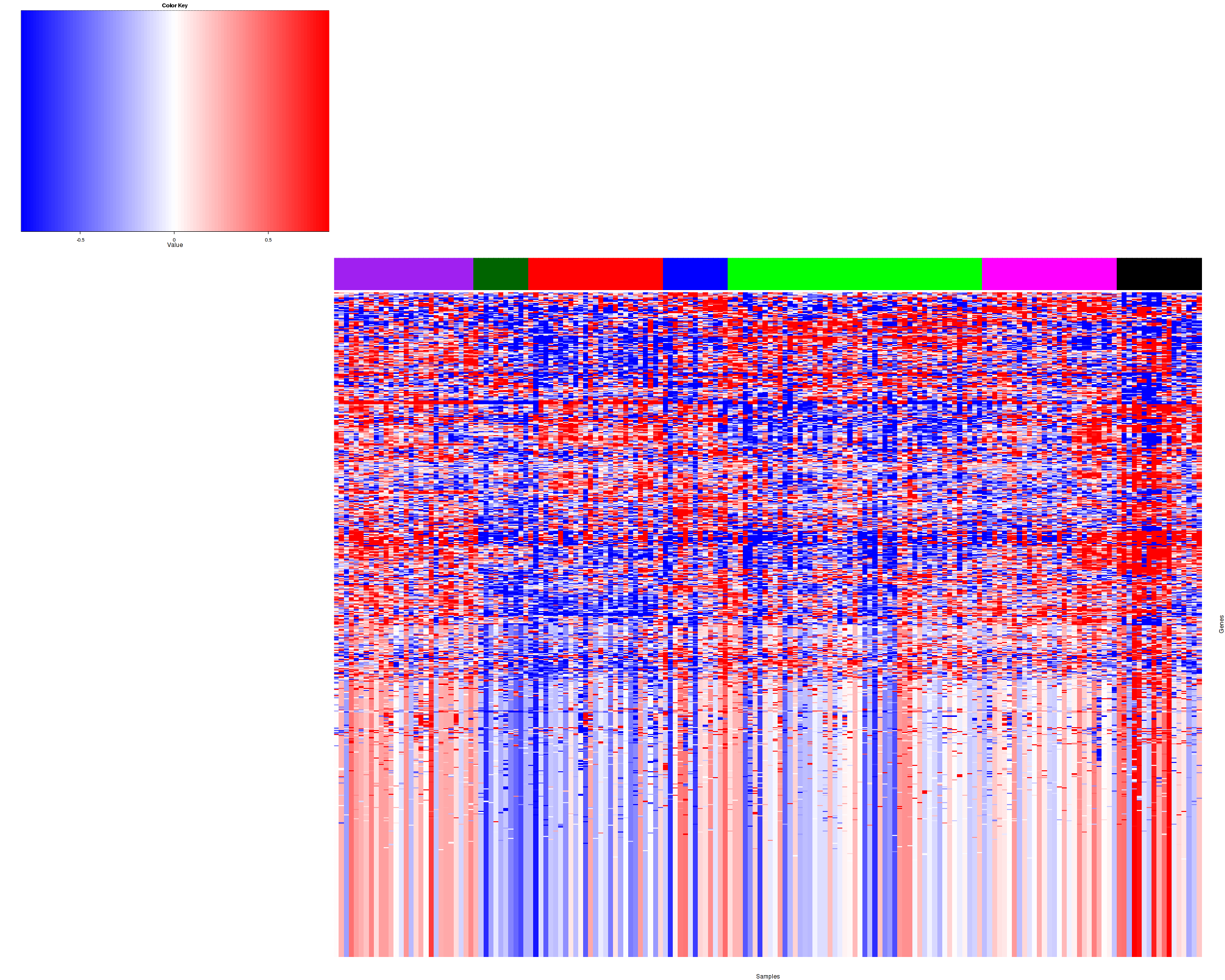 Figure 1. Get High-res Image Samples were separated into 7 clusters. Shown are 174 samples and 1284 marker miRs. The color bar of the row indicates the marker miRs for the corresponding cluster.