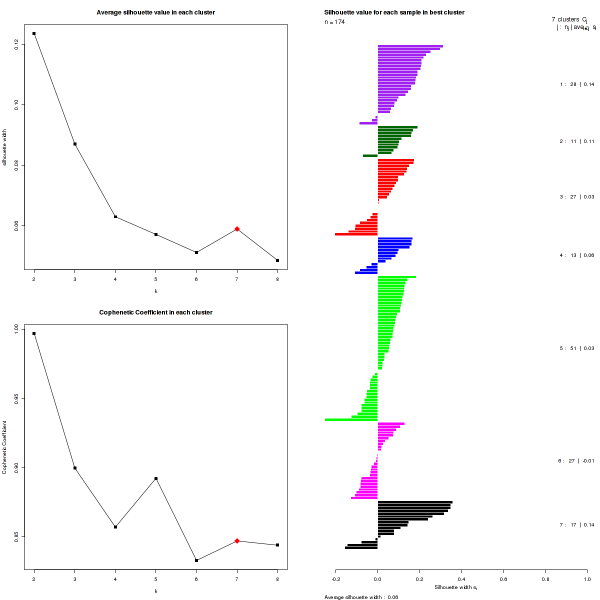 The most robust consensus NMF clustering of 174 samples using the 647 most variable miRs was identified for k = 7 clusters. We computed the clustering for k = 2 to k = 10 and uused the cophenetic correlation coefficient and the average silhouette width calculation to determine the robust clusters.