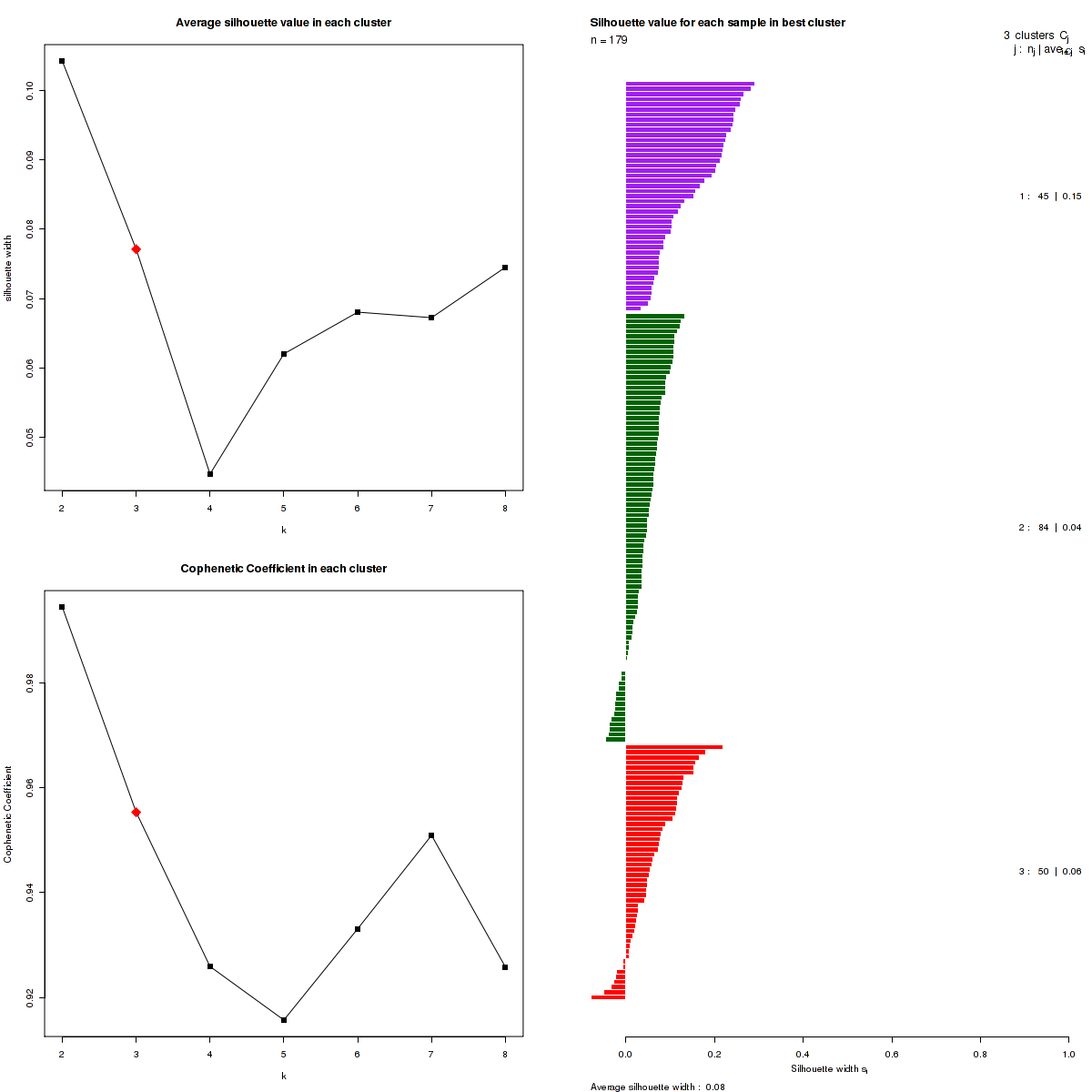 Figure 3. Get High-res Image The silhouette width was calculated for each sample and each value of k. The left upper panel shows the average silhouette width across all samples for each tested k (left upper panel). The left lower panel shows the Cophenetic Correlation Coefficients for each tested k. The right panel shows assignments of clusters to samples and the silhouette width of each sample for the most robust clustering.