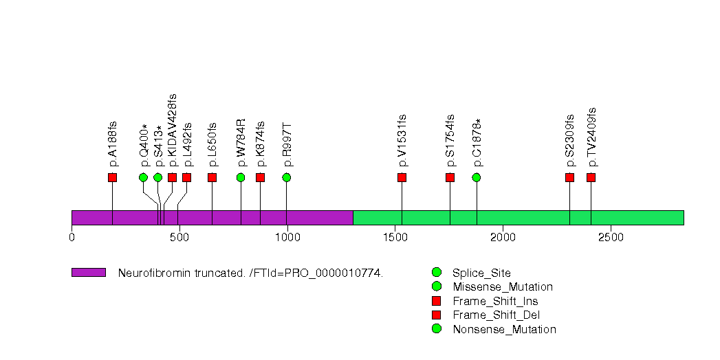 Figure S4. This figure depicts the distribution of mutations and mutation types across the NF1 significant gene.