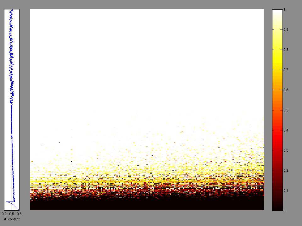 The x axis represents the samples. The y axis represents the exons, one row per exon, and they are sorted by average coverage across samples. For exons with exactly the same average coverage, they are sorted next by the %GC of the exon. (The secondary sort is especially useful for the zero-coverage exons at the bottom). If the figure is unpopulated, then full coverage is assumed (e.g. MutSig CV doesn't use WIGs and assumes full coverage).