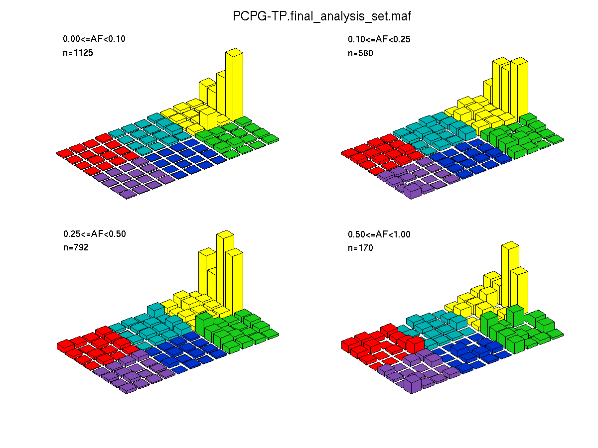 The mutation spectrum is depicted in the lego plots below in which the 96 possible mutation types are subdivided into six large blocks, color-coded to reflect the base substitution type. Each large block is further subdivided into the 16 possible pairs of 5' and 3' neighbors, as listed in the 4x4 trinucleotide context legend. The height of each block corresponds to the mutation frequency for that kind of mutation (counts of mutations normalized by the base coverage in a given bin). The shape of the spectrum is a signature for dominant mutational mechanisms in different tumor types.