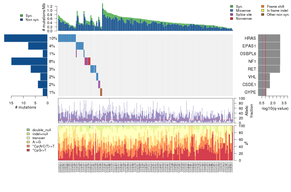 Figure 5. Get High-res Image The matrix in the center of the figure represents individual mutations in patient samples, color-coded by type of mutation, for the significantly mutated genes. The rate of synonymous and non-synonymous mutations is displayed at the top of the matrix. The barplot on the left of the matrix shows the number of mutations in each gene. The percentages represent the fraction of tumors with at least one mutation in the specified gene. The barplot to the right of the matrix displays the q-values for the most significantly mutated genes. The purple boxplots below the matrix (only displayed if required columns are present in the provided MAF) represent the distributions of allelic fractions observed in each sample. The plot at the bottom represents the base substitution distribution of individual samples, using the same categories that were used to calculate significance.