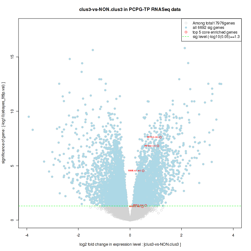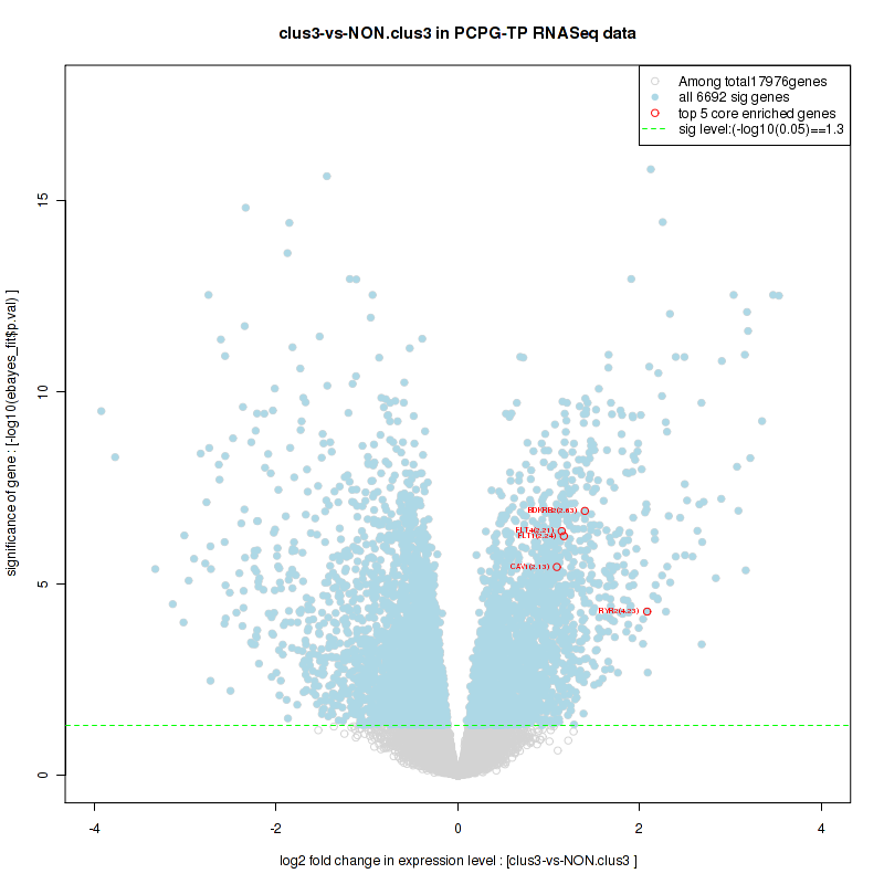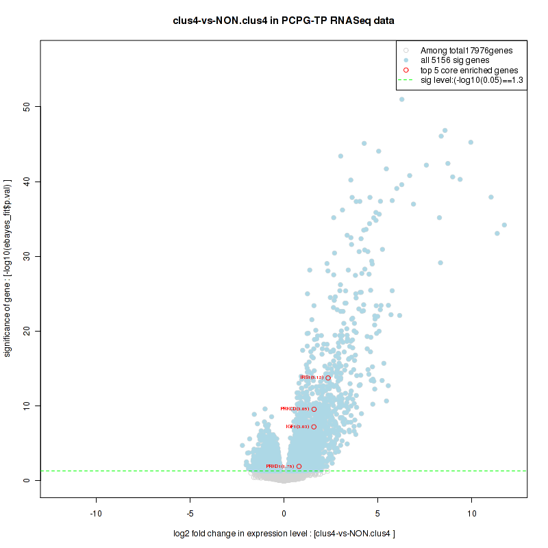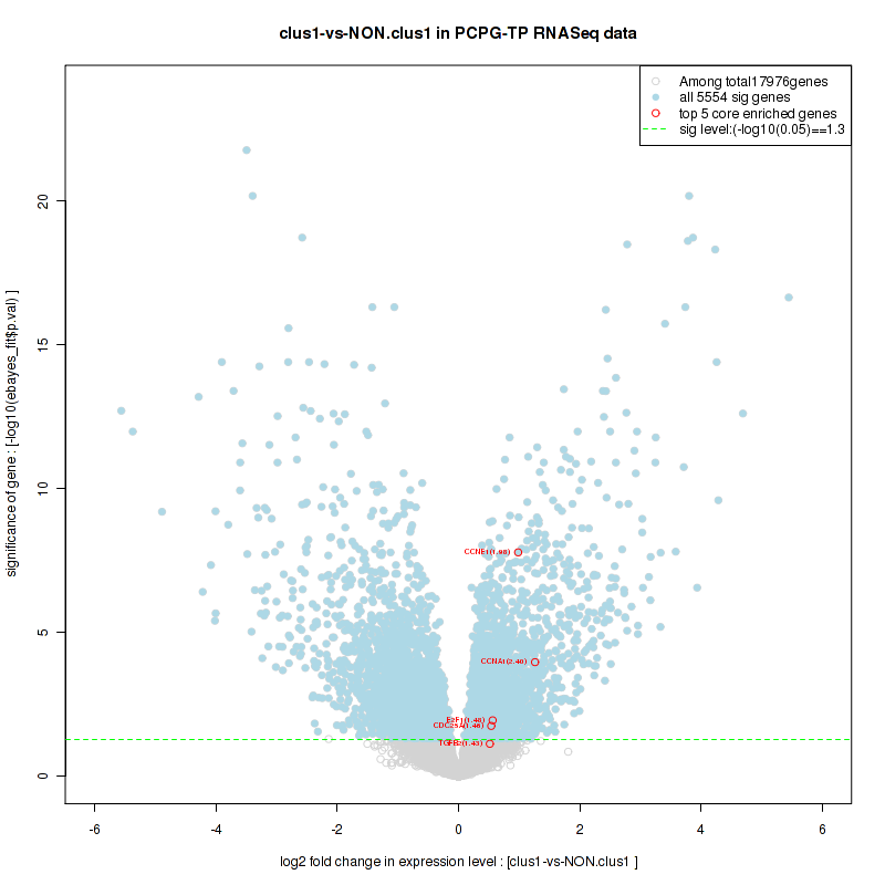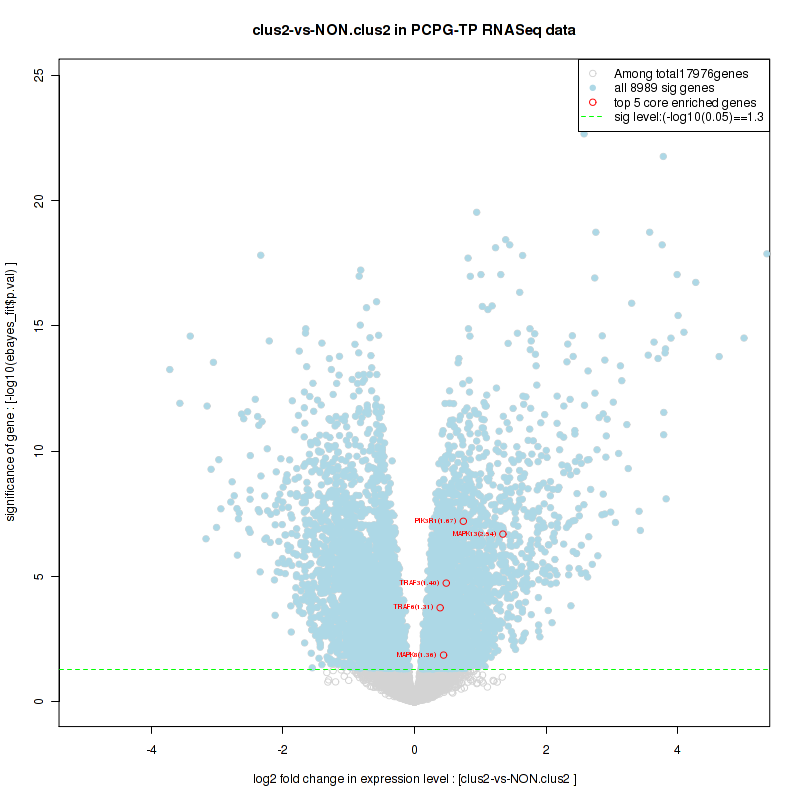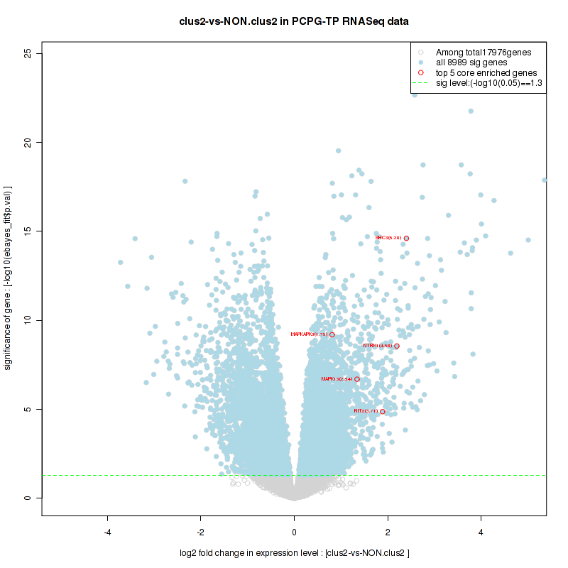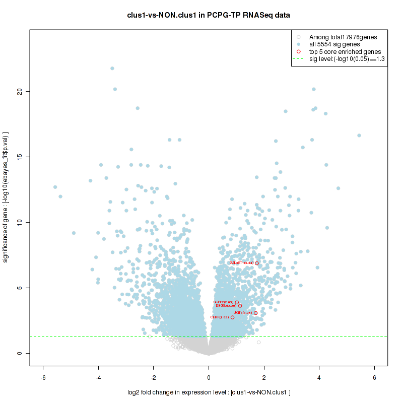 Figure S2. Get High-res Image For the top 5 core enriched genes in the pathway: KEGG SPHINGOLIPID METABOLISM, this volcano plot shows how much they are up/down-regulated and significant. The significance was calculated by empirical bayesian fit
