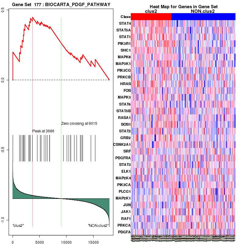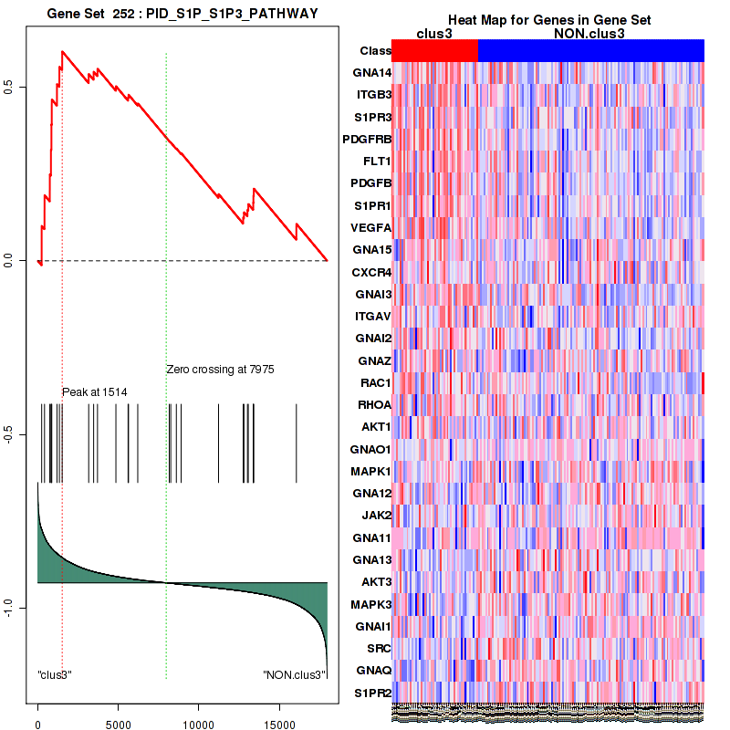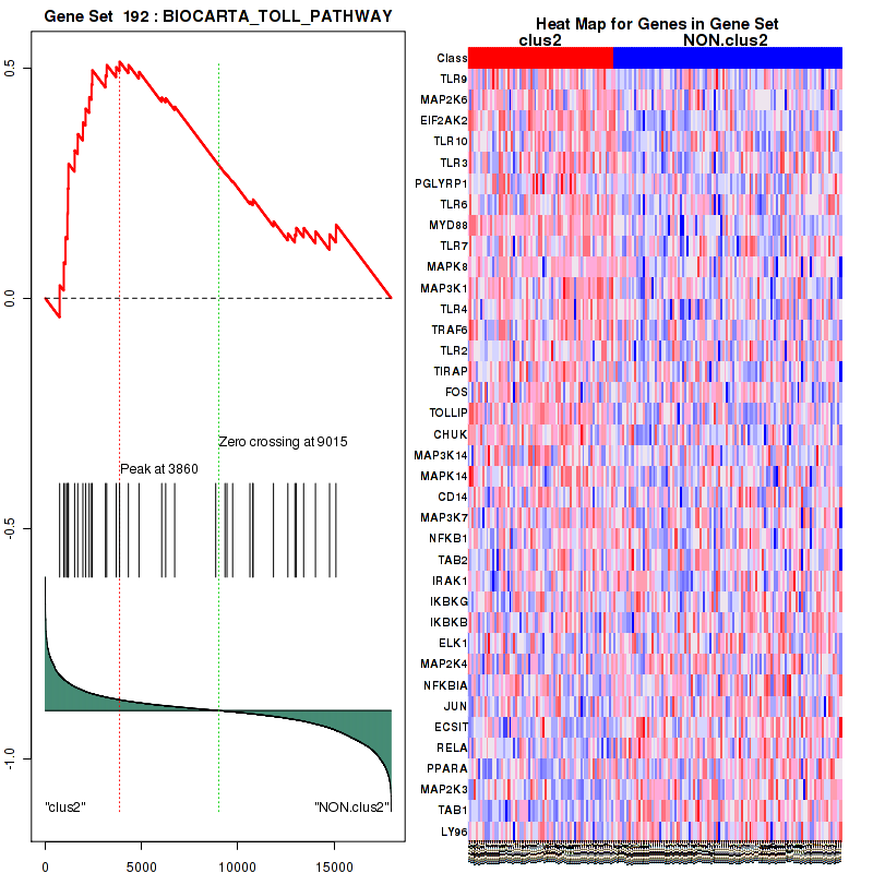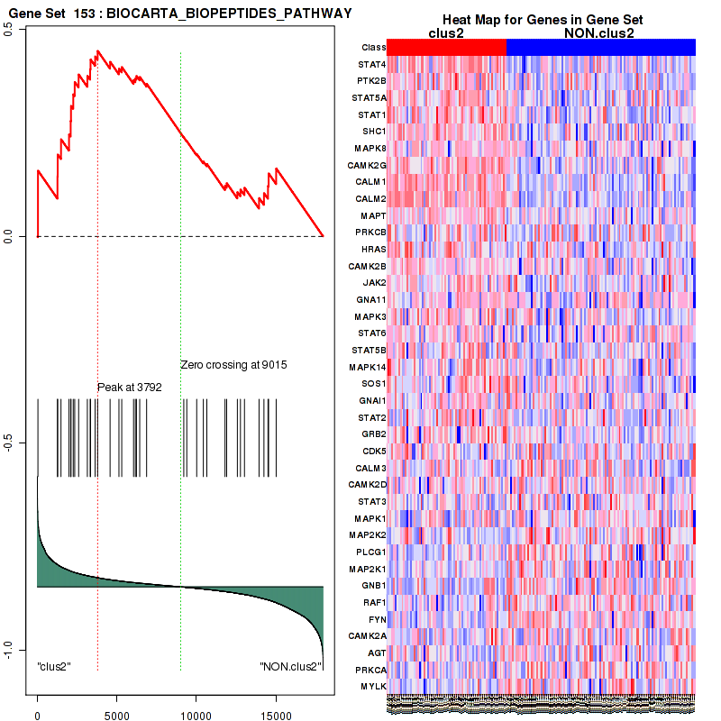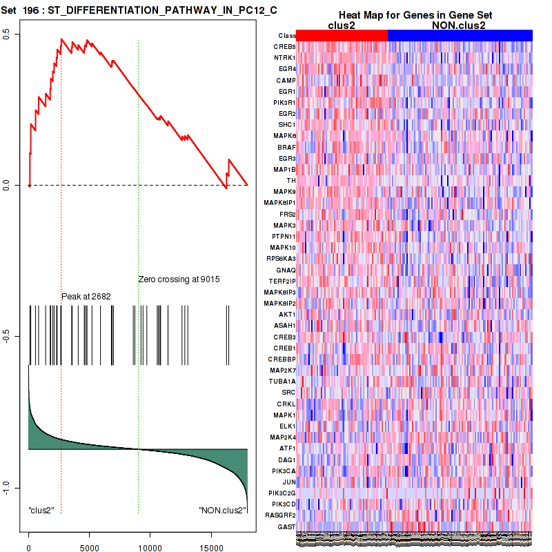 Table S1. Get Full Table This table shows a Running Enrichment Score (RES) of each gene in this pathway, that is, the enrichment score at this point in the ranked list of genes. All genes are ranked by Signal-to-Noise (S2N), a measure of similarity as default and are used to obtain ES matrix of all genes. In this way, GSEA tool uses expression pattern of not only overlapped genes but also not-overlapped genes to produce ES matrix.