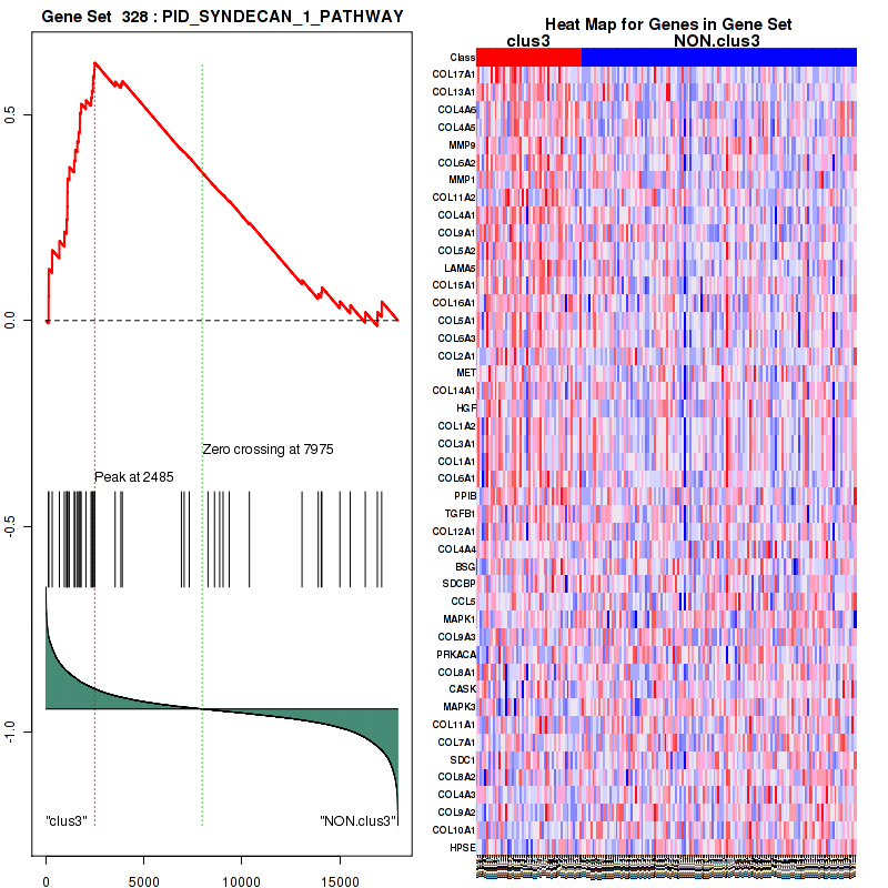 Table 3. Get Full Table This table shows top 10 pathways which are significantly enriched in cluster clus1. It displays only significant gene sets satisfying nom.p.val.threshold (-1), fwer.p.val.threshold (-1) , fdr.q.val.threshold (0.25) and the default table is sorted by Normalized Enrichment Score (NES). Further details on NES statistics, please visit The Broad GSEA website.