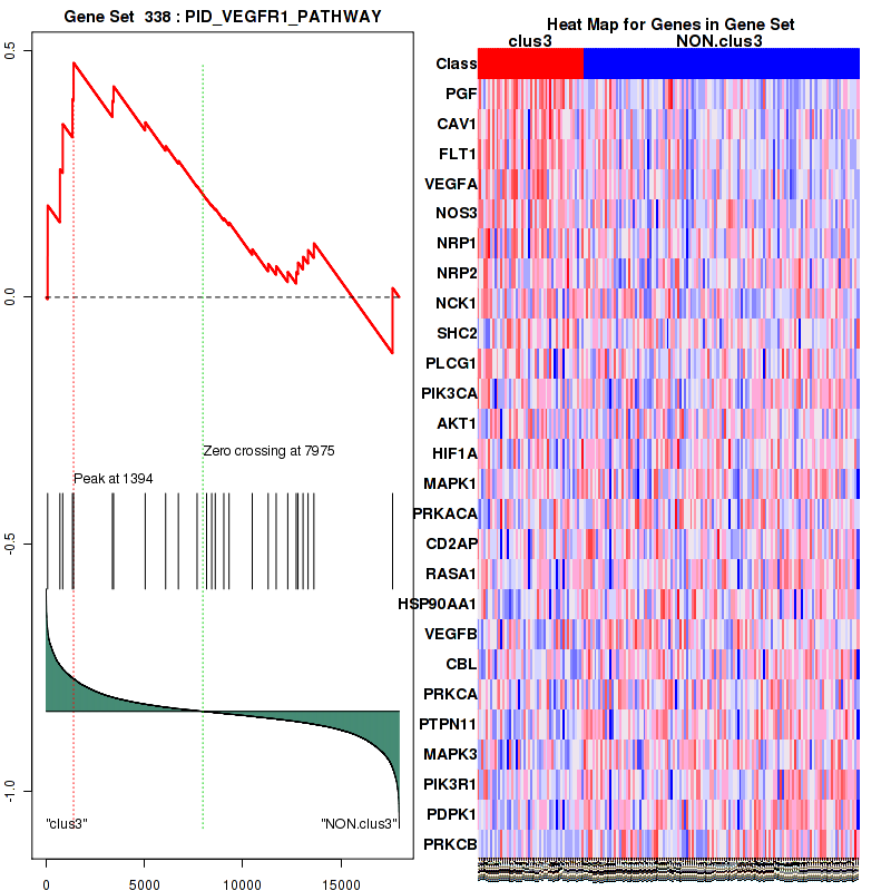 Top enriched gene sets are KEGG NOTCH SIGNALING PATHWAY, KEGG BLADDER CANCER, BIOCARTA NO1 PATHWAY, BIOCARTA VEGF PATHWAY, PID HIF2PATHWAY, PID S1P S1P3 PATHWAY, PID FRA PATHWAY, PID ILK PATHWAY, PID SYNDECAN 1 PATHWAY, PID VEGFR1 PATHWAY