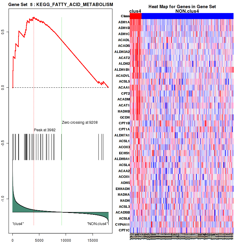 Top enriched gene sets are KEGG GLYCOLYSIS GLUCONEOGENESIS, KEGG CITRATE CYCLE TCA CYCLE, KEGG PENTOSE PHOSPHATE PATHWAY, KEGG FRUCTOSE AND MANNOSE METABOLISM, KEGG FATTY ACID METABOLISM, KEGG STEROID HORMONE BIOSYNTHESIS, KEGG ALANINE ASPARTATE AND GLUTAMATE METABOLISM, KEGG GLYCINE SERINE AND THREONINE METABOLISM, KEGG CYSTEINE AND METHIONINE METABOLISM, KEGG VALINE LEUCINE AND ISOLEUCINE DEGRADATION