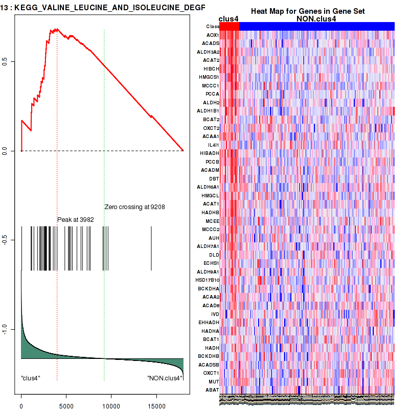 Figure S79. Get High-res Image This plot shows mRNAseq_cNMF expression data heatmap (on the left) a RunningEnrichmentScore(RES) plot (on the top right) and a Signal2Noise(S2N) plot (on the bottom right) of genes in the pathway: KEGG VALINE LEUCINE AND ISOLEUCINE DEGRADATION.