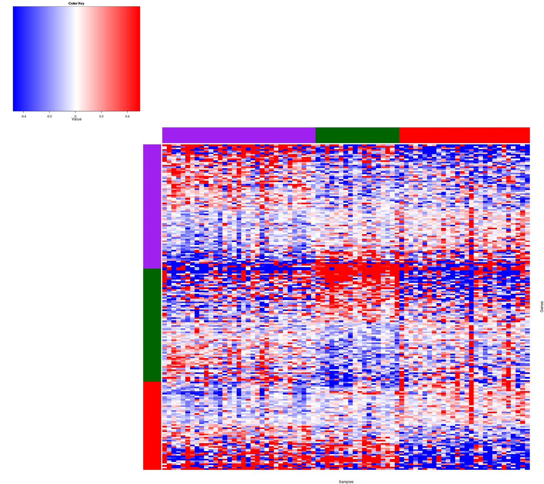 Figure 1. Get High-res Image Samples were separated into 3 clusters. Shown are 79 samples and 207 marker proteins. The color bar of the row indicates the marker proteins for the corresponding cluster.