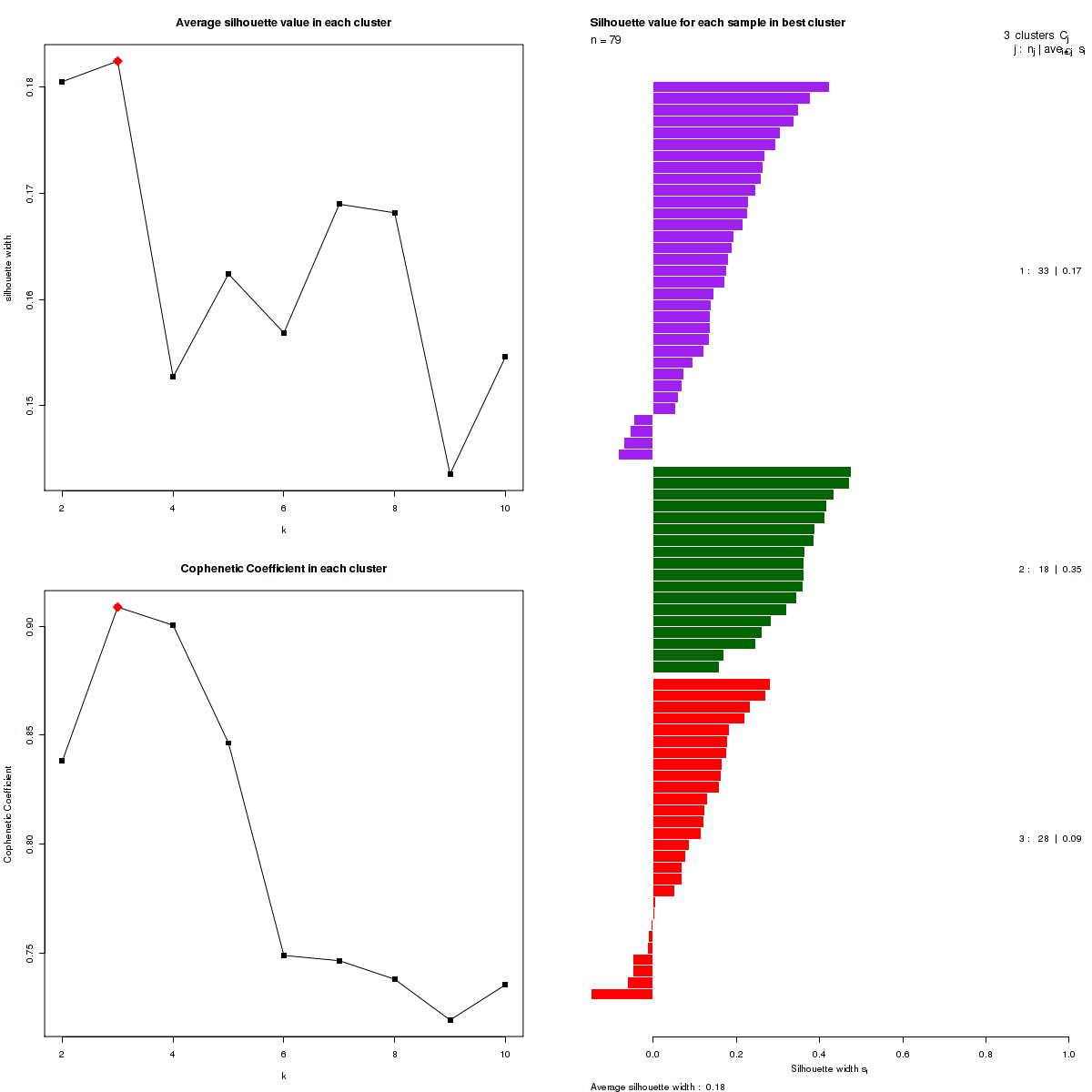 Figure 3. Get High-res Image The silhouette width was calculated for each sample and each value of k. The left upper panel shows the average silhouette width across all samples for each tested k (left upper panel). The left lower panel shows the Cophenetic Correlation Coefficients for each tested k. The right panel shows assignments of clusters to samples and the k silhouette width of each sample for the most robust clustering.