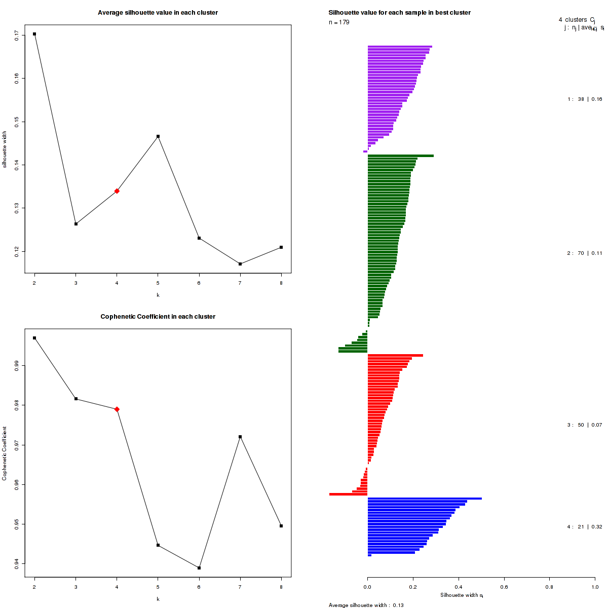 Figure 3. Get High-res Image The silhouette width was calculated for each sample and each value of k. The left upper panel shows the average silhouette width across all samples for each tested k (left upper panel). The left lower panel shows the Cophenetic Correlation Coefficients for each tested k. The right panel shows assignments of clusters to samples and the silhouette width of each sample for the most robust clustering.