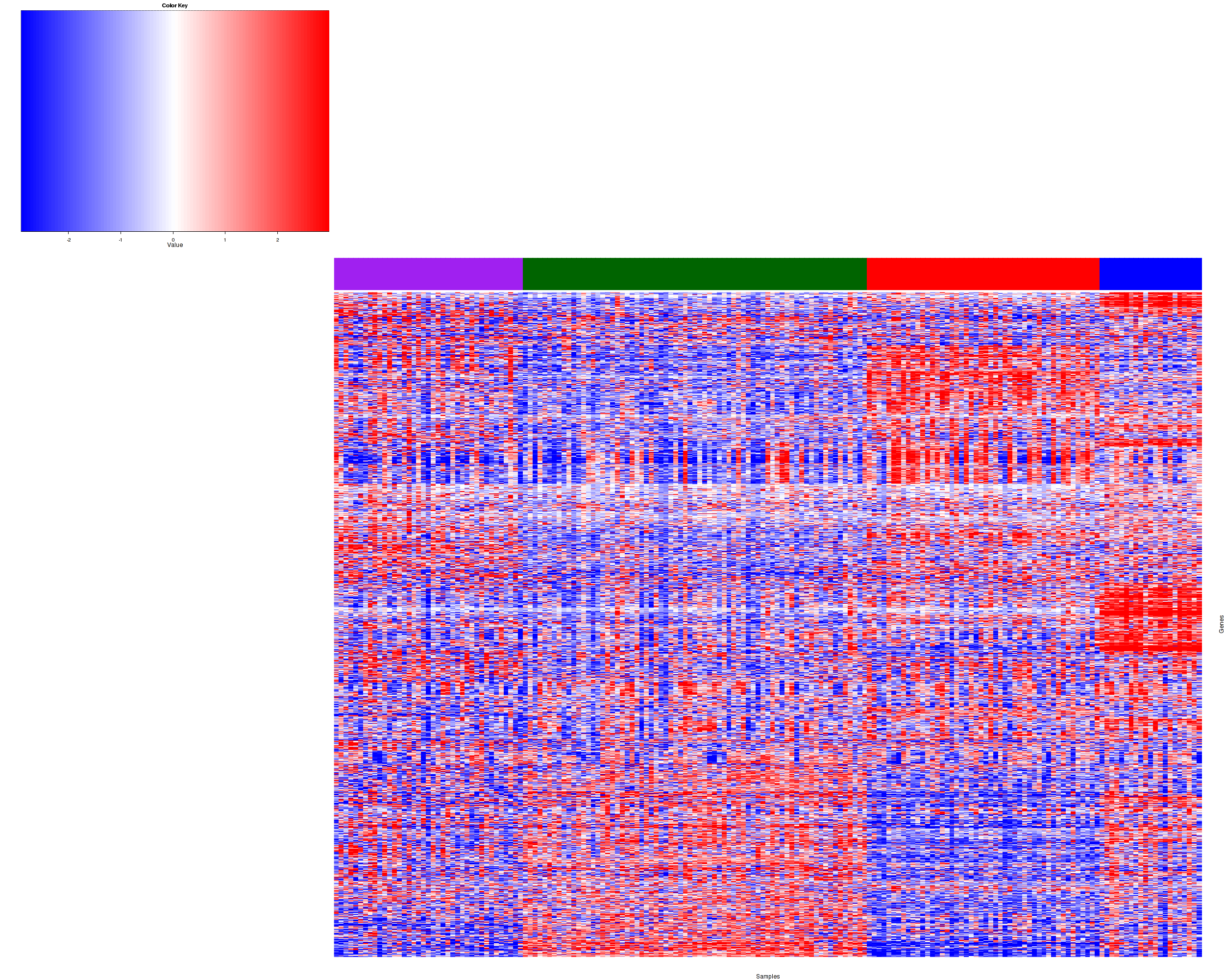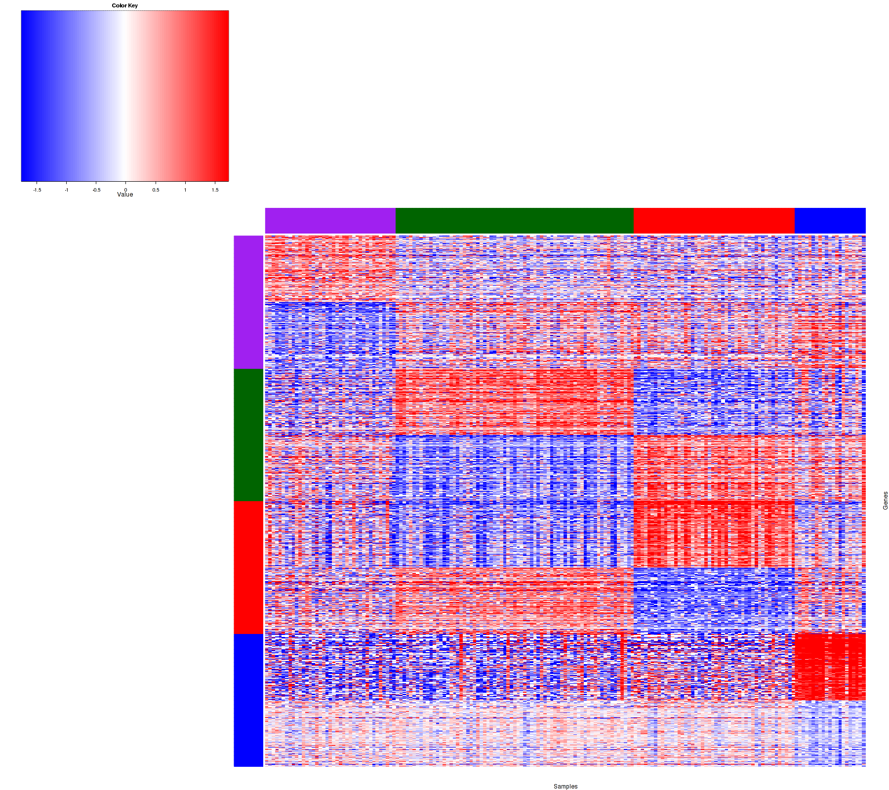 Figure 1.  Get High-res Image Samples were separated into 4 clusters. Shown are 179 samples and 1200 marker genes. The color bar of the row indicates the marker genes for the corresponding cluster.
