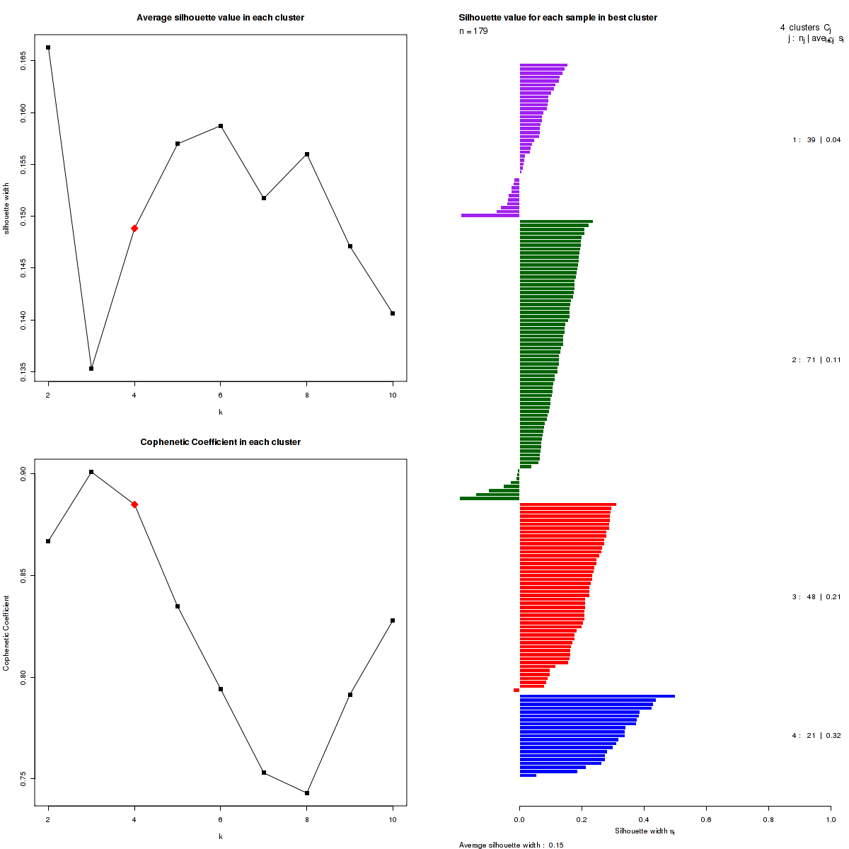 Silhouette widths, Cophenetic Correlation Coefficients and Consensus matrix