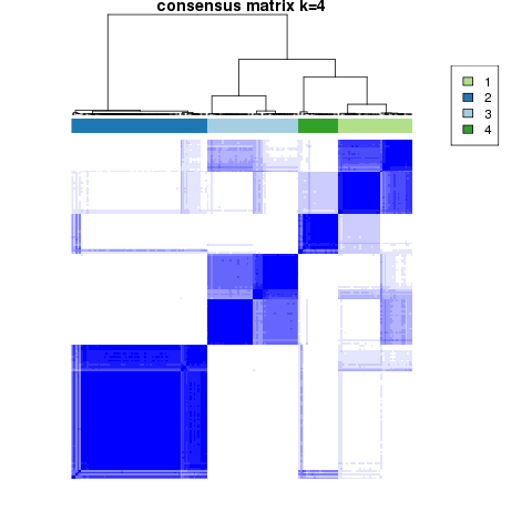 Figure 4.  Get High-res Image The consensus matrix after clustering shows 4 clusters with limited overlap between clusters.