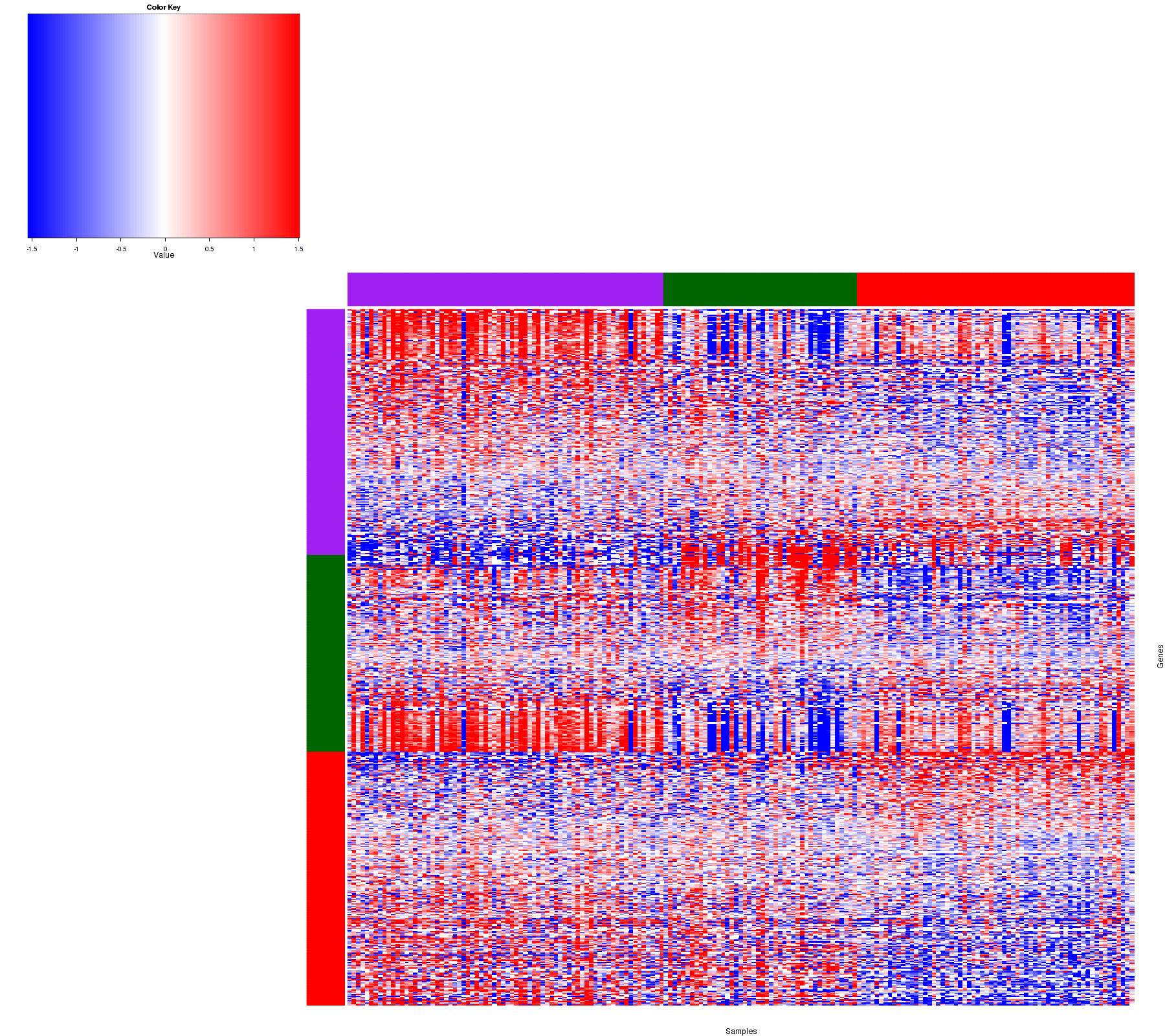 Figure 1. Get High-res Image Samples were separated into 3 clusters. Shown are 179 samples and 655 marker miRs. The color bar of the row indicates the marker miRs for the corresponding cluster.