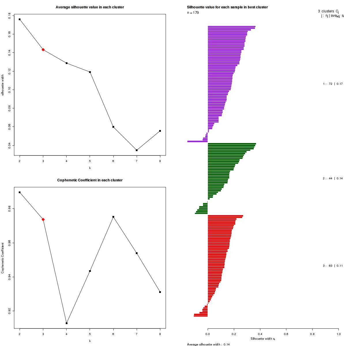 Figure 3. Get High-res Image The silhouette width was calculated for each sample and each value of k. The left upper panel shows the average silhouette width across all samples for each tested k (left upper panel). The left lower panel shows the Cophenetic Correlation Coefficients for each tested k. The right panel shows assignments of clusters to samples and the silhouette width of each sample for the most robust clustering.