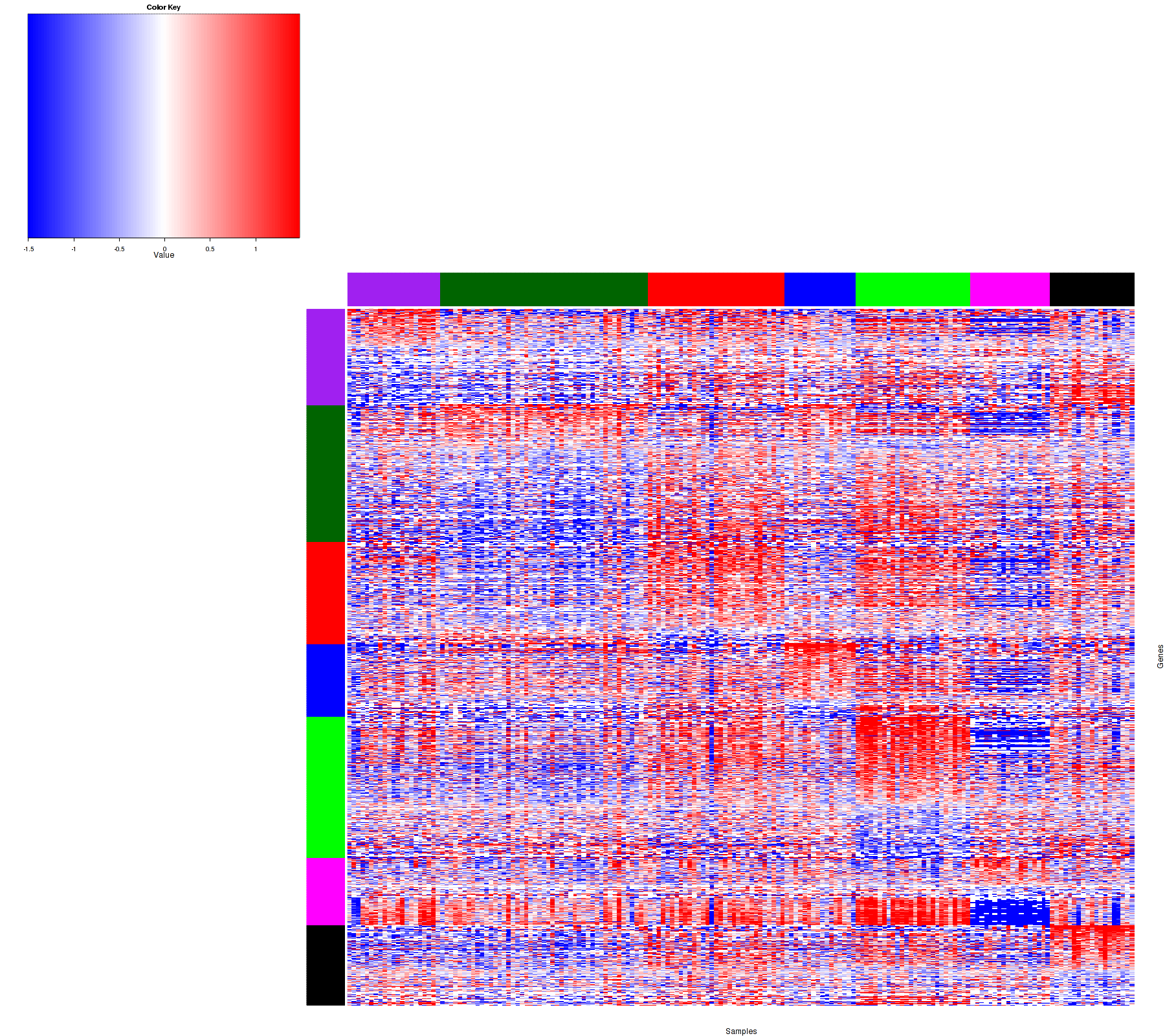 Figure 1. Get High-res Image Samples were separated into 7 clusters. Shown are 178 samples and 1462 marker miRs. The color bar of the row indicates the marker miRs for the corresponding cluster.