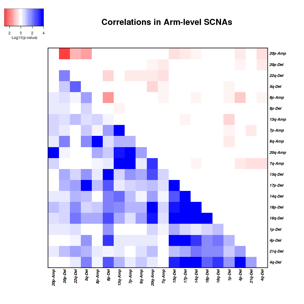 Figure 1. Get High-res Image Co-occurring and mutually-exclusive pairs for copy number variations of arm level events. Blue means two events are co-occurring and red means two events are mutually-exclusive.