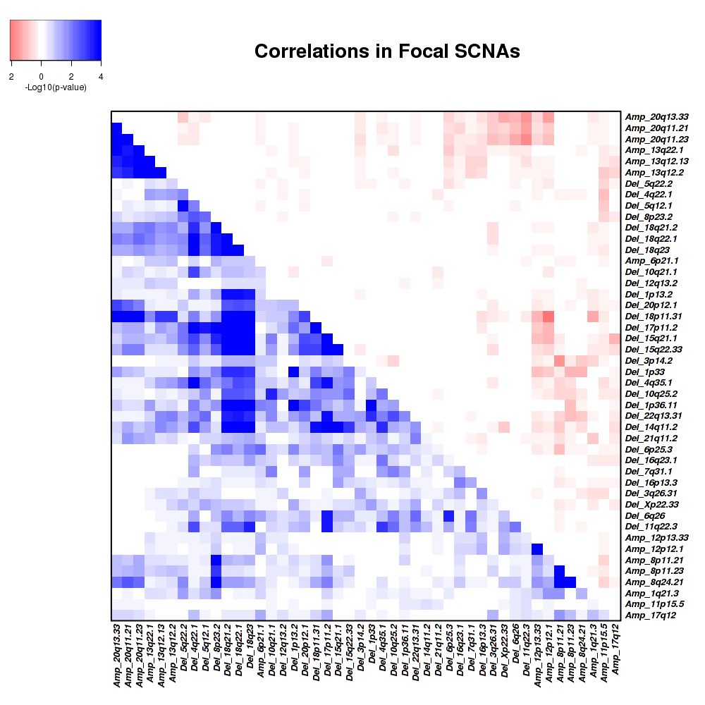 Figure 2. Get High-res Image Co-occurring and mutually-exclusive pairs for copy number variations of focal events. Blue means two events are co-occurring and red means two events are mutually-exclusive.