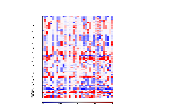 A table of chromosome arm amplification levels for each sample. Each row is a chromosome arm, and each column a sample. The data are in units of absolute copy number -2.