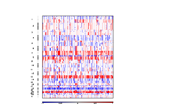 A table of chromosome arm amplification levels for each sample. Each row is a chromosome arm, and each column a sample. The data are in units of absolute copy number -2.