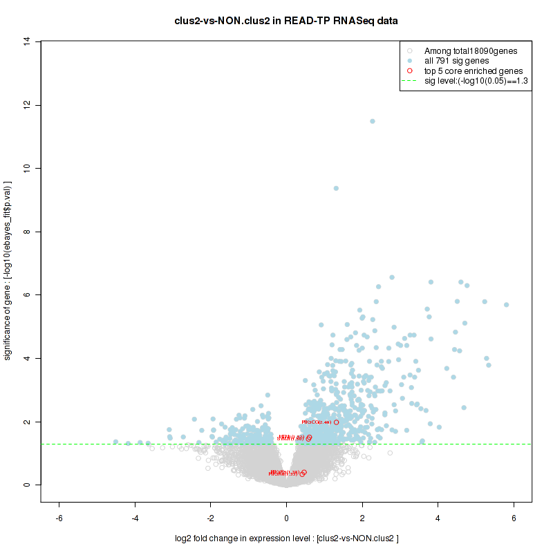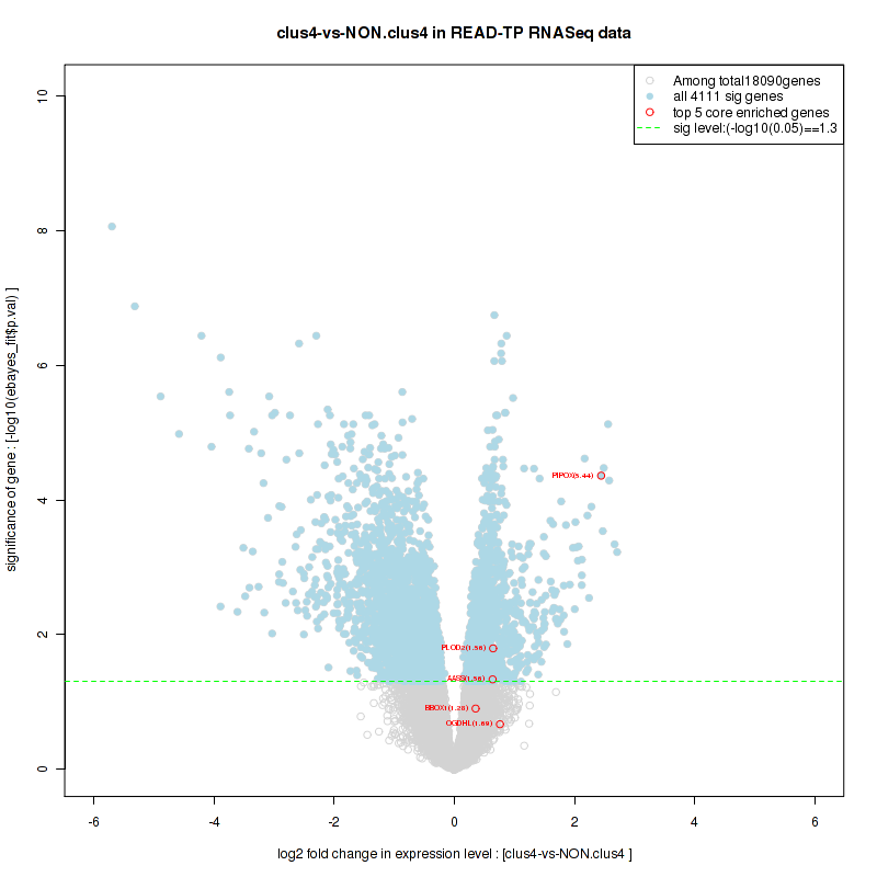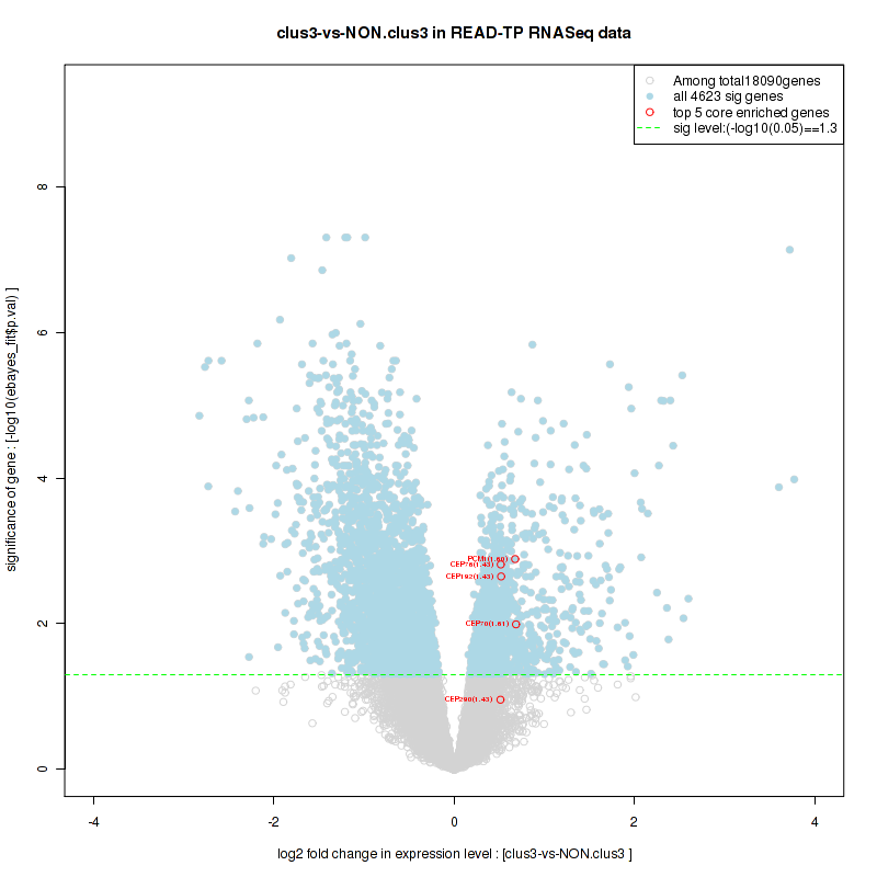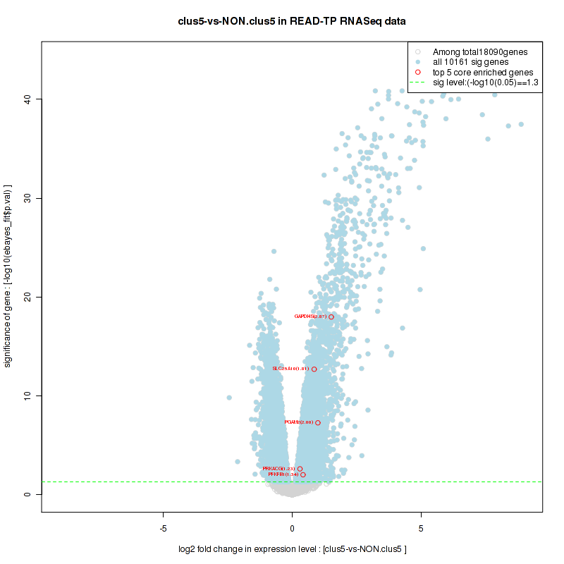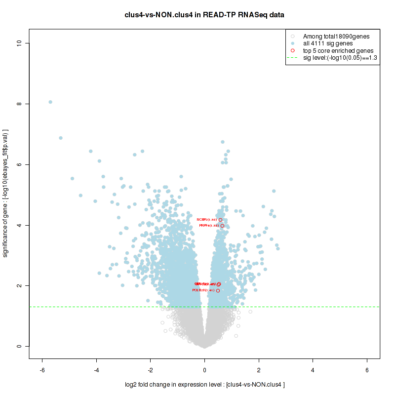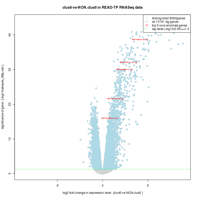 Figure S100. Get High-res Image For the top 5 core enriched genes in the pathway: REACTOME TRANSCRIPTION, this volcano plot shows how much they are up/down-regulated and significant. The significance was calculated by empirical bayesian fit