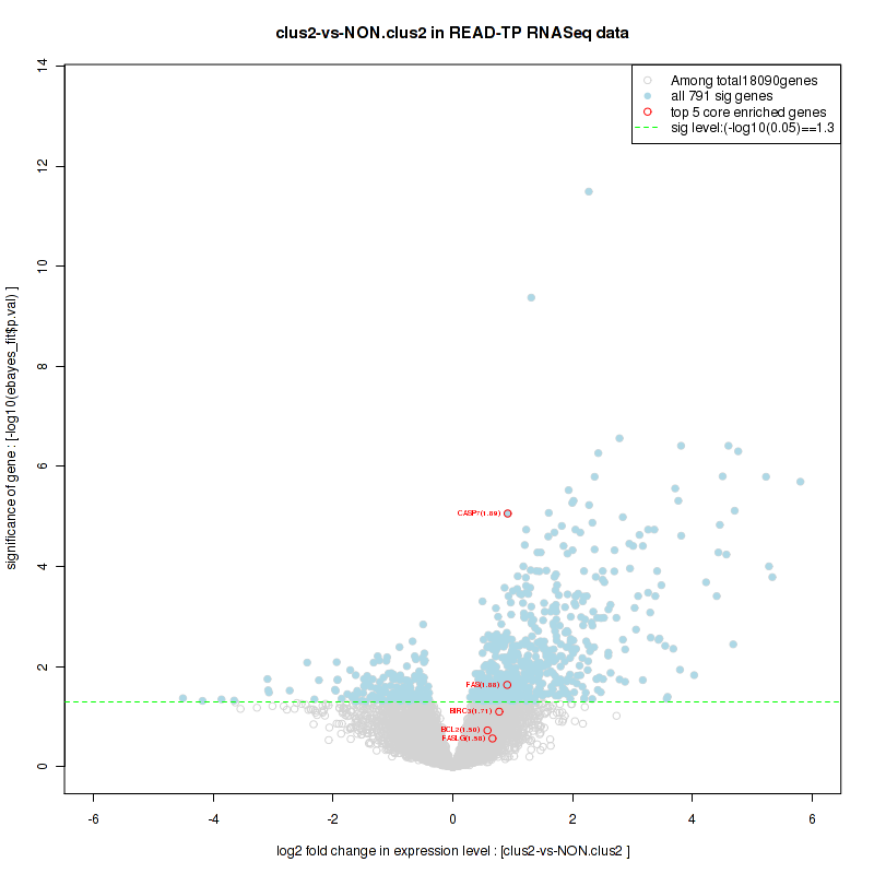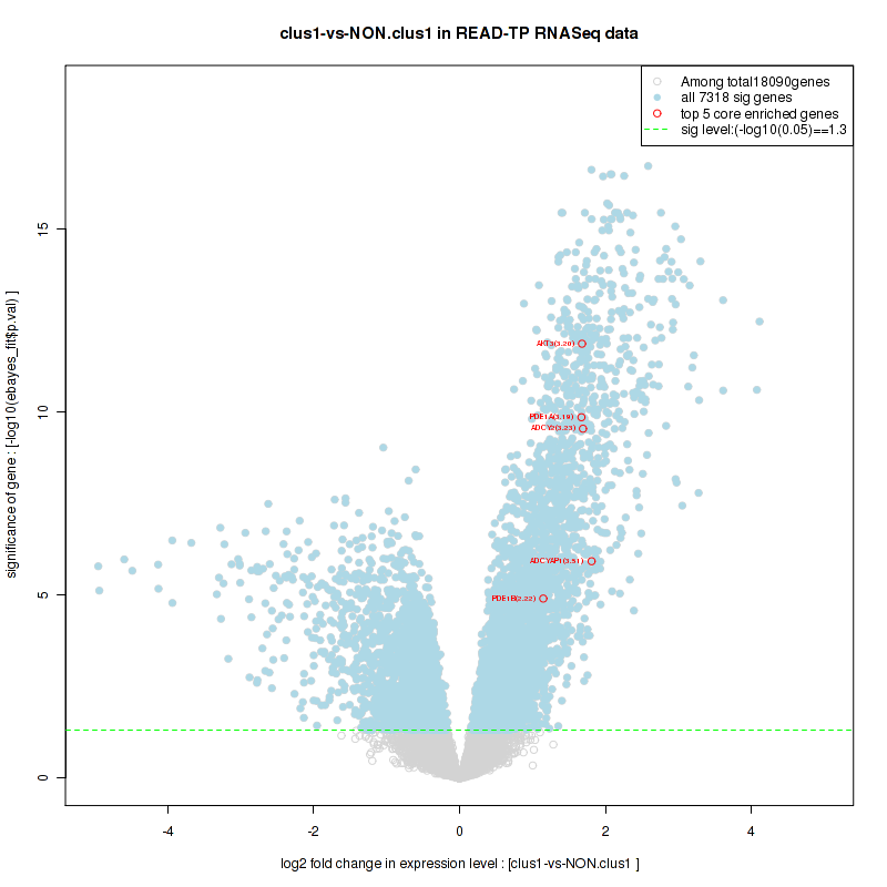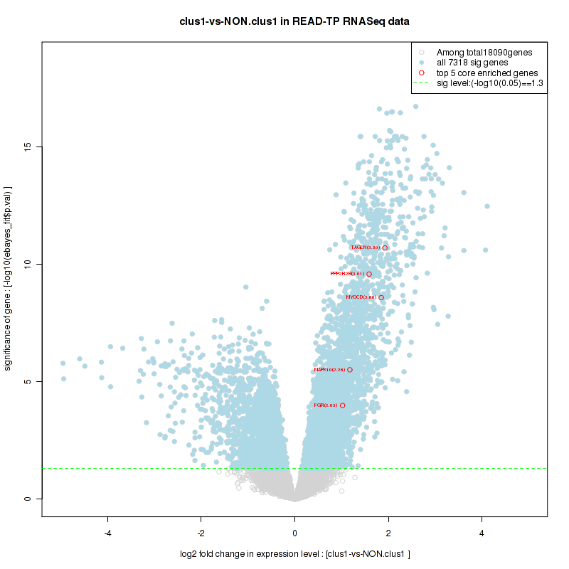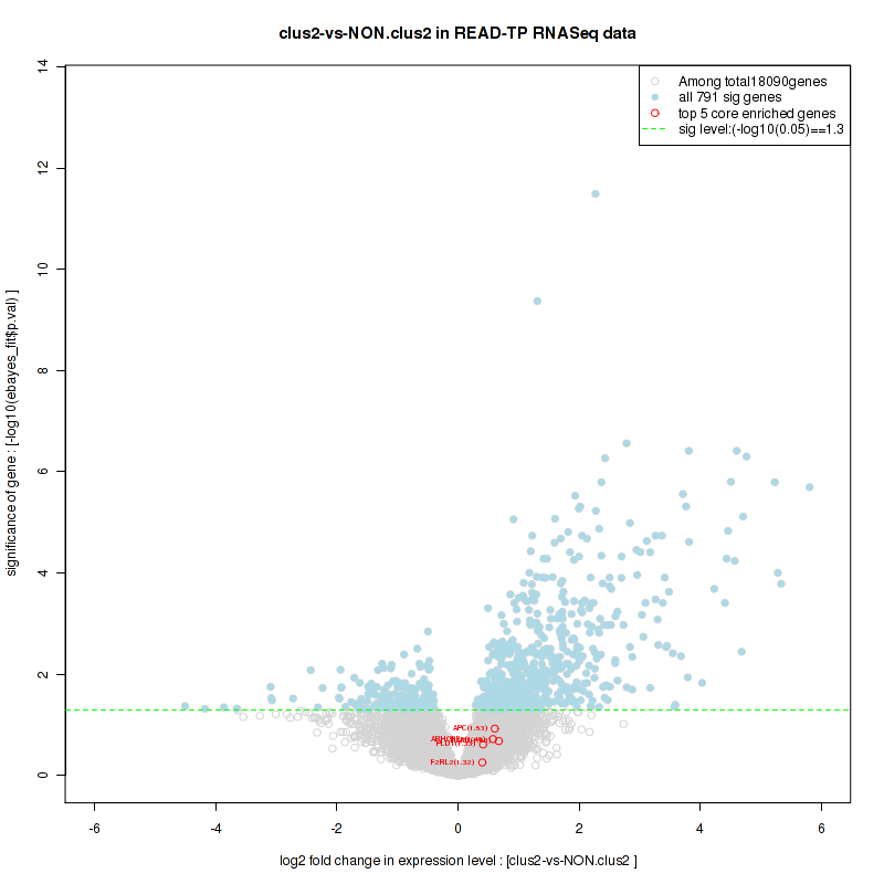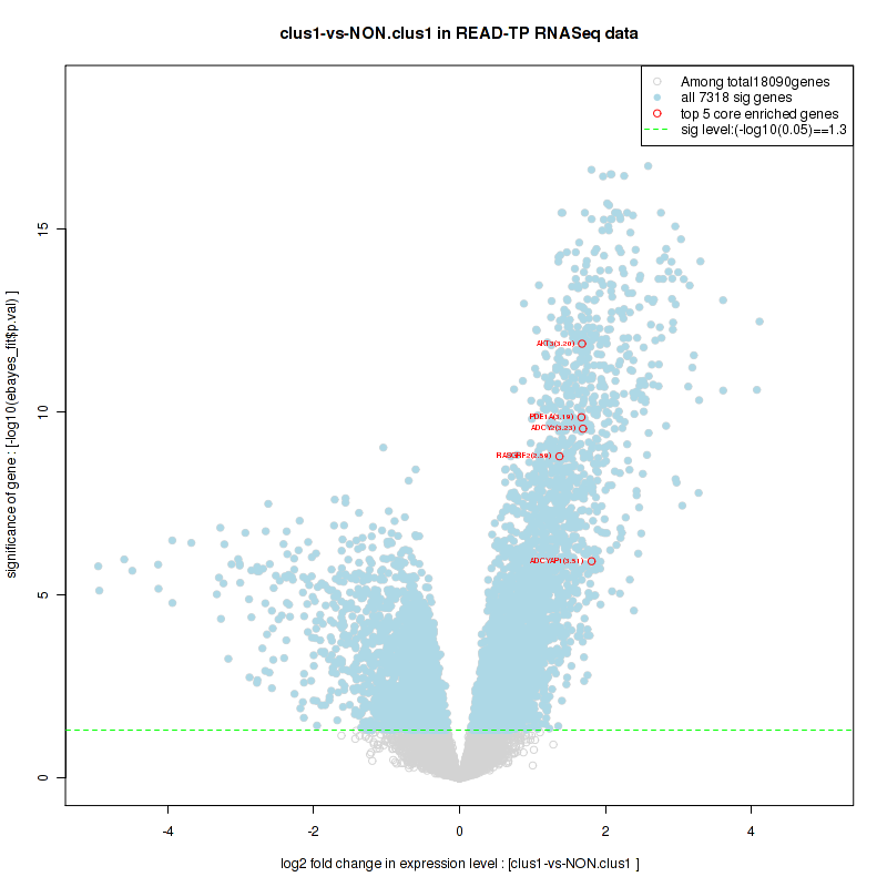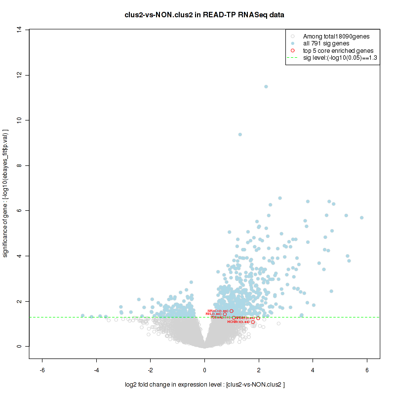 Figure S100. Get High-res Image For the top 5 core enriched genes in the pathway: REACTOME TRANSCRIPTION, this volcano plot shows how much they are up/down-regulated and significant. The significance was calculated by empirical bayesian fit