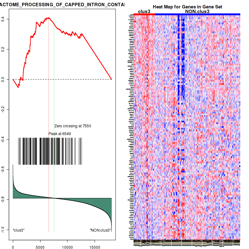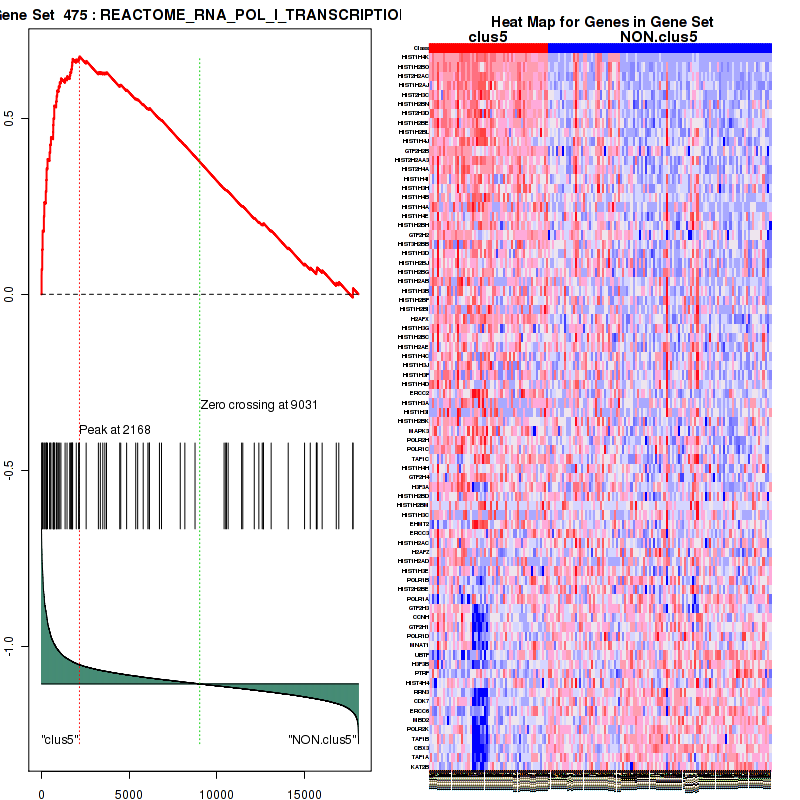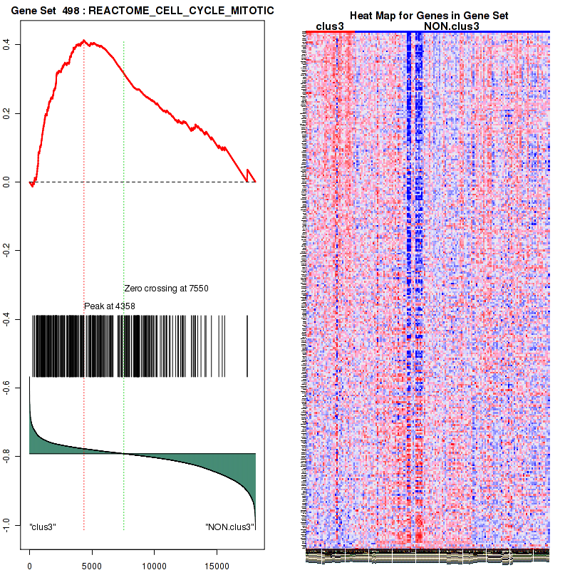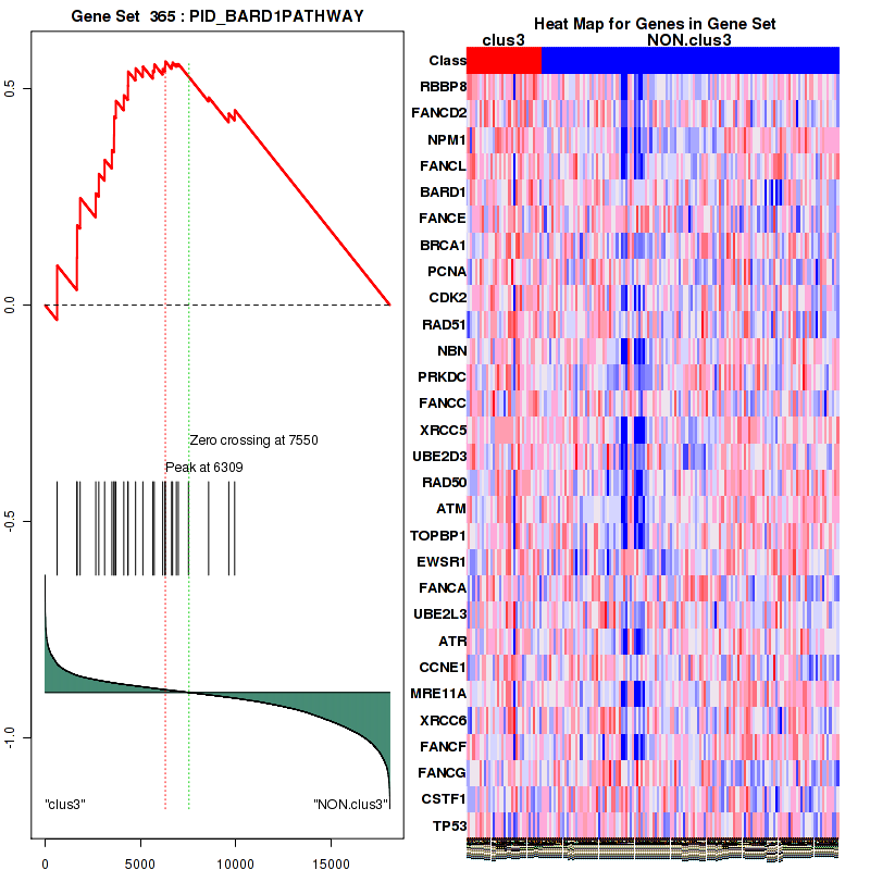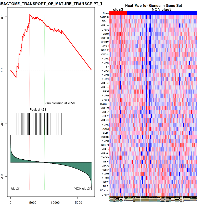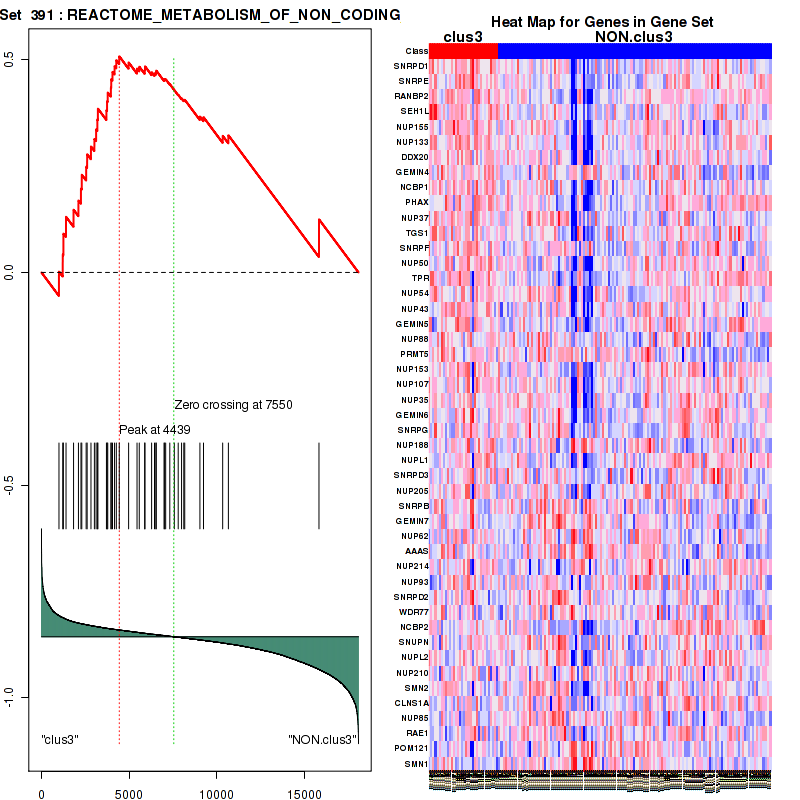 Table 3. Get Full Table This table shows top 10 pathways which are significantly enriched in cluster clus1. It displays only significant gene sets satisfying nom.p.val.threshold (-1), fwer.p.val.threshold (-1) , fdr.q.val.threshold (0.25) and the default table is sorted by Normalized Enrichment Score (NES). Further details on NES statistics, please visit The Broad GSEA website.