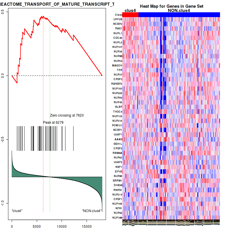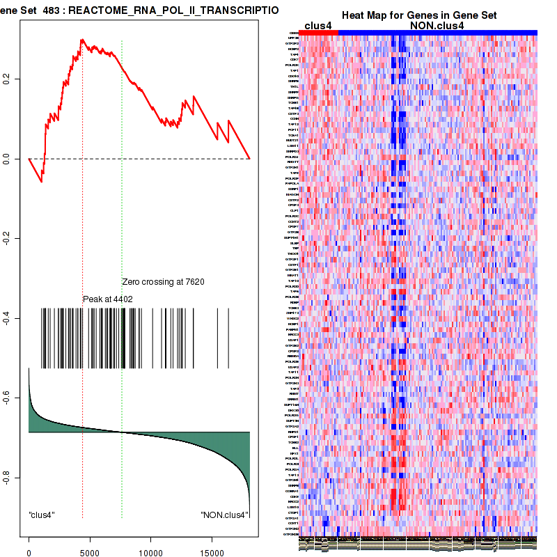 Figure S99. Get High-res Image This plot shows mRNAseq_cNMF expression data heatmap (on the left) a RunningEnrichmentScore(RES) plot (on the top right) and a Signal2Noise(S2N) plot (on the bottom right) of genes in the pathway: REACTOME TRANSCRIPTION.