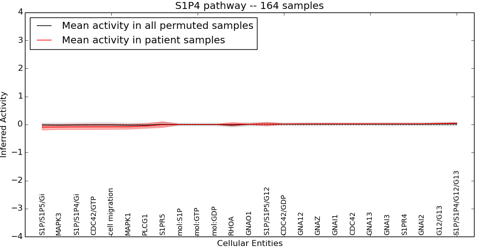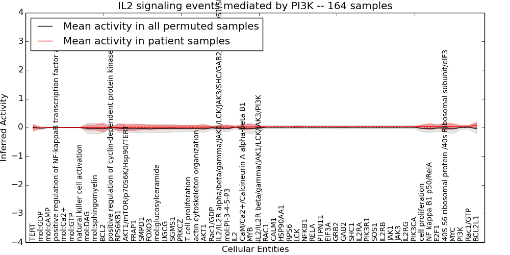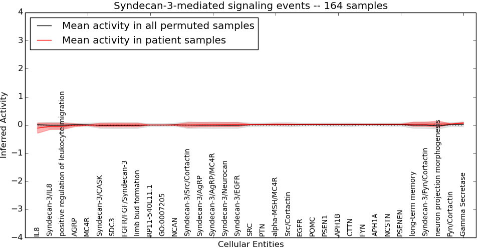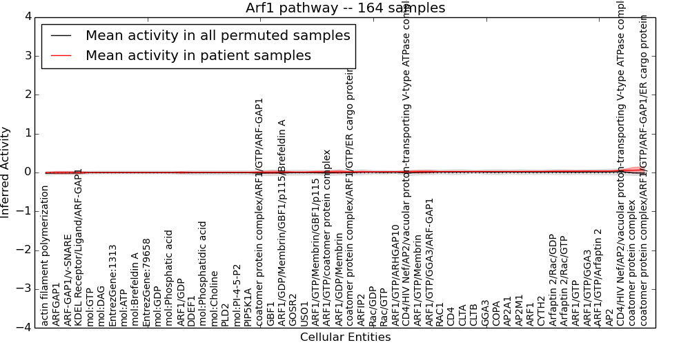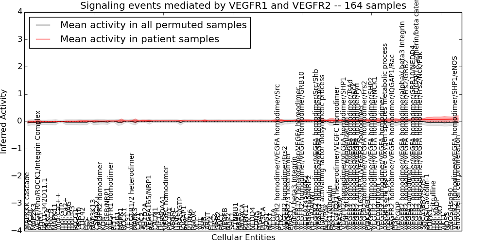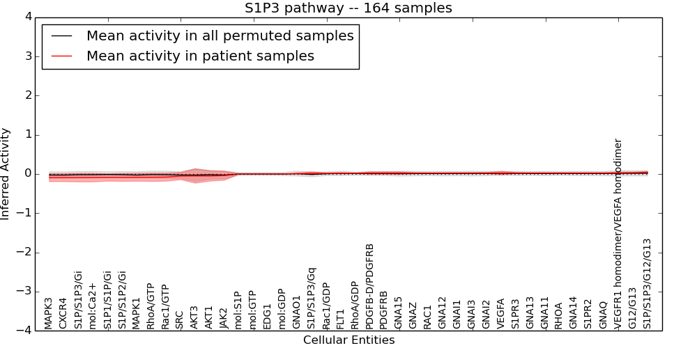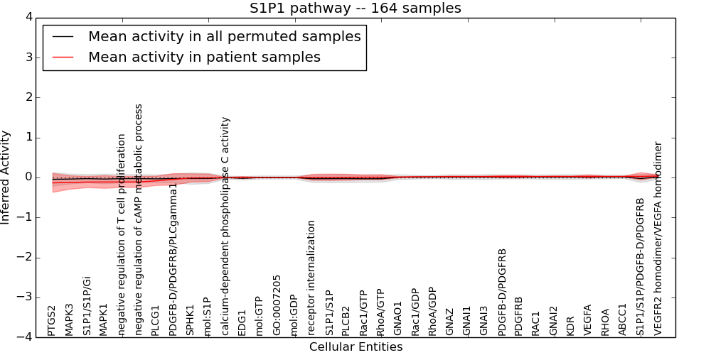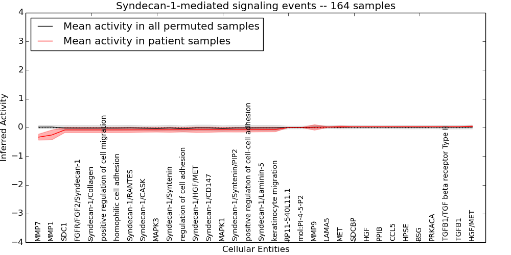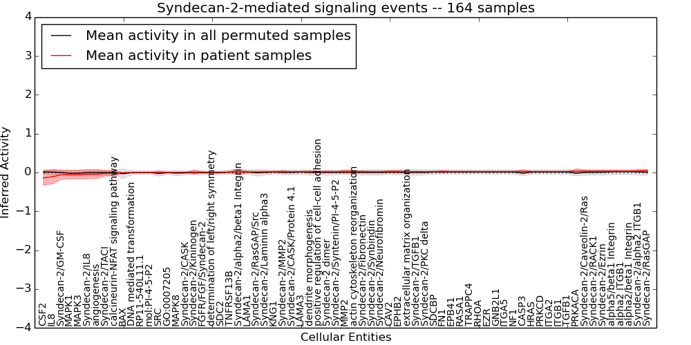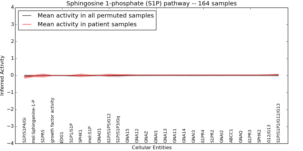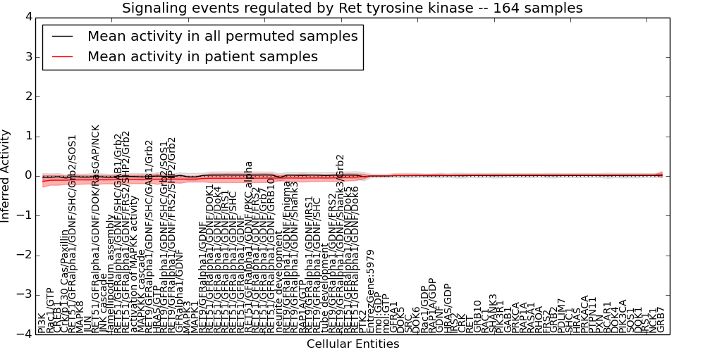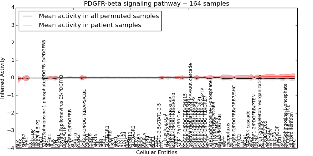 Figure S131. Get High-res Image This plot shows pathway concept perturbations across all samples against a permutation model. The concepts along the x-axis are sorted by lowest to highest mean activity for the real patient samples. Mean inferred activities are plotted along the y-axis as a colored band showing the average level and one standard deviation range. Real samples are shown in red and permuted samples in black.