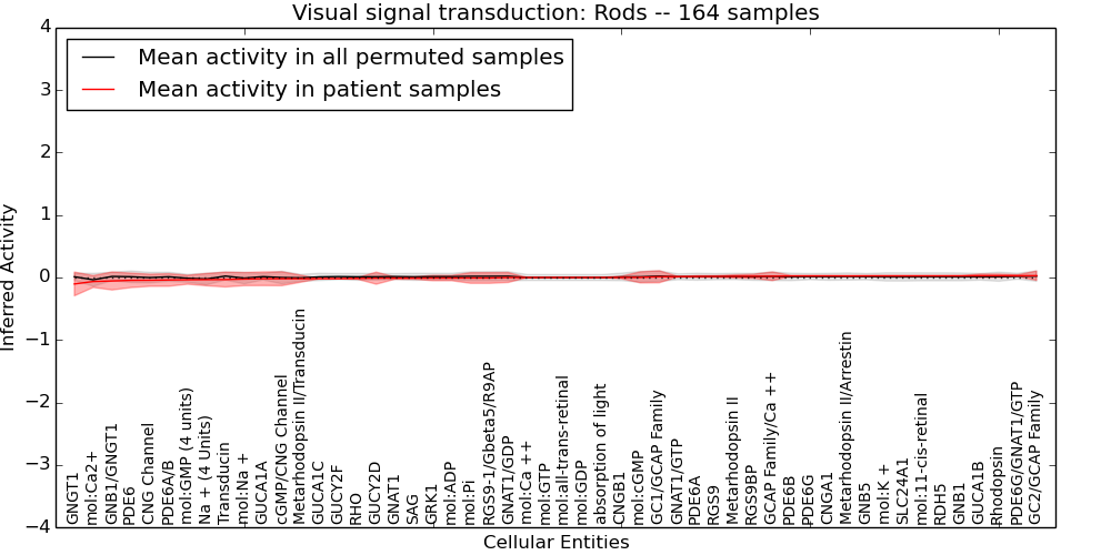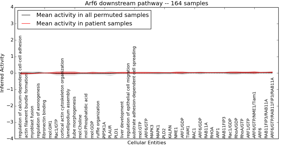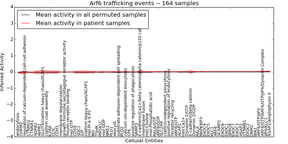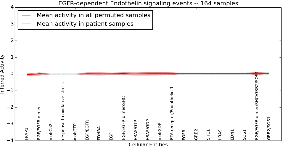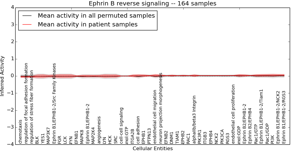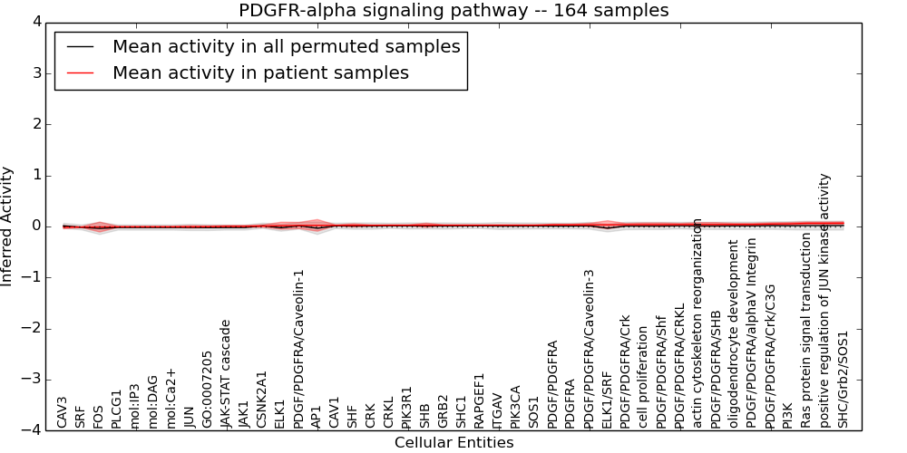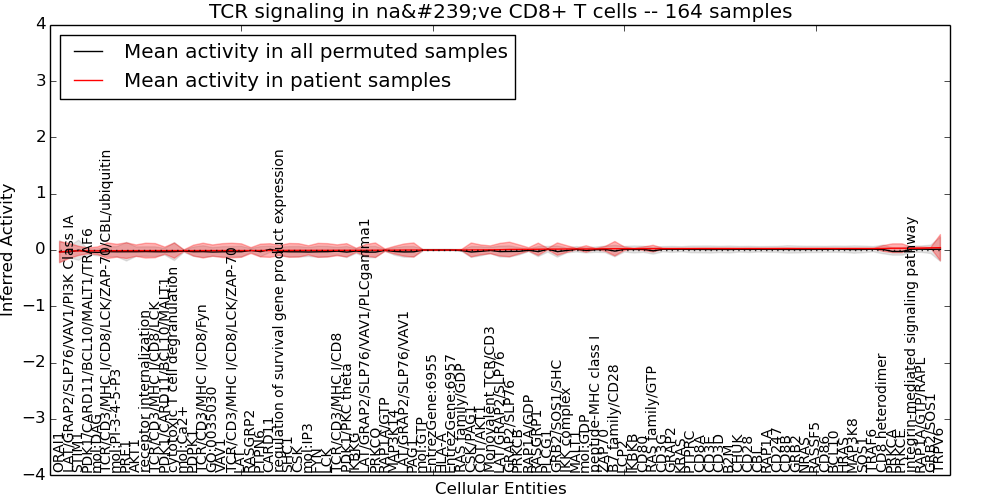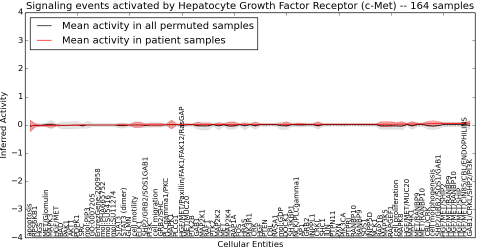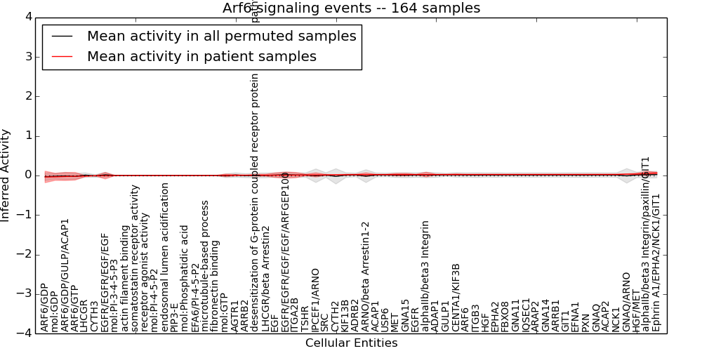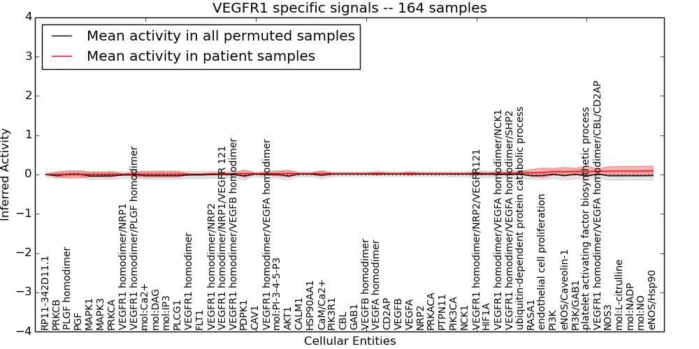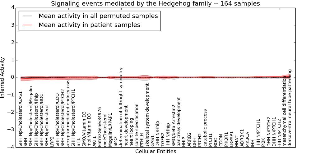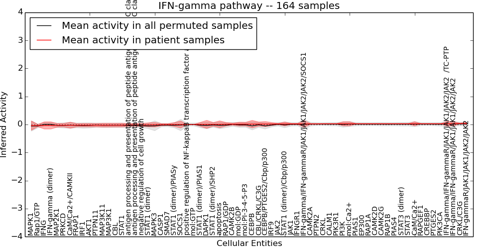Figure S131. Get High-res Image This plot shows pathway concept perturbations across all samples against a permutation model. The concepts along the x-axis are sorted by lowest to highest mean activity for the real patient samples. Mean inferred activities are plotted along the y-axis as a colored band showing the average level and one standard deviation range. Real samples are shown in red and permuted samples in black.