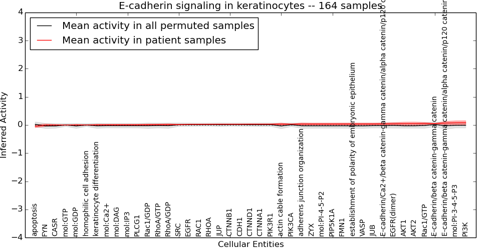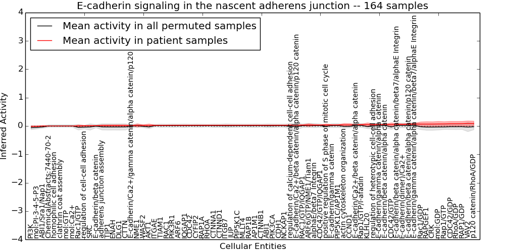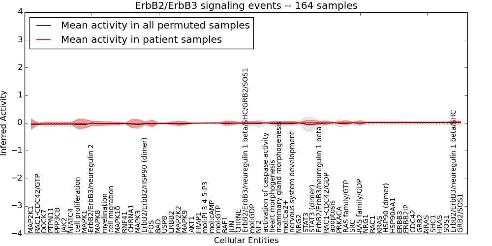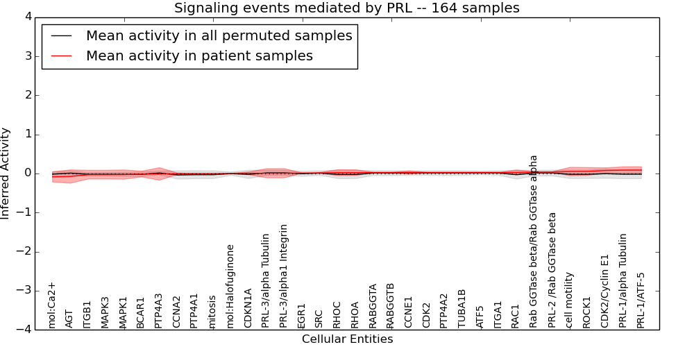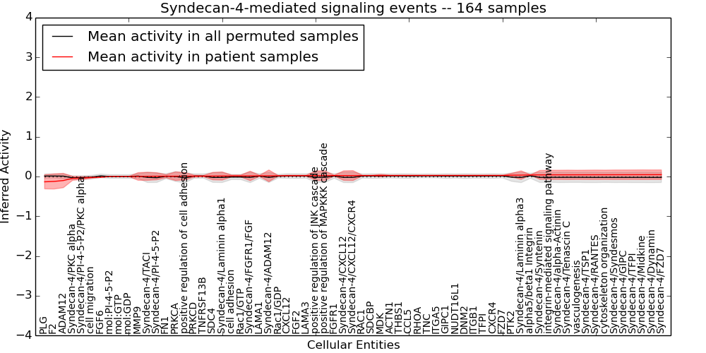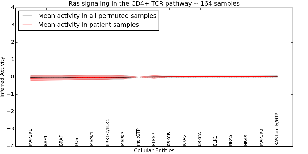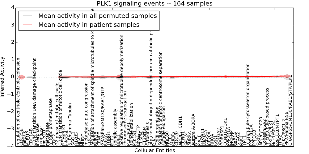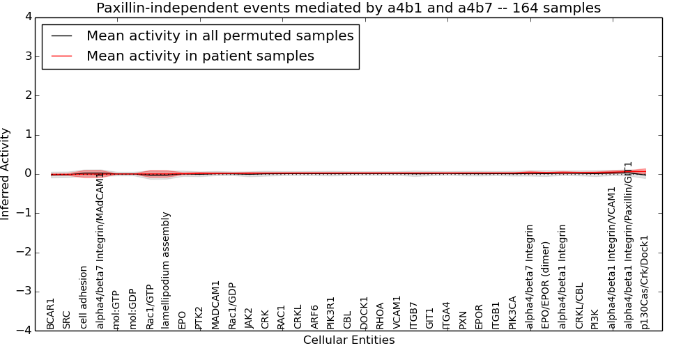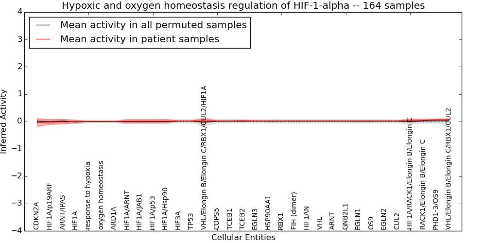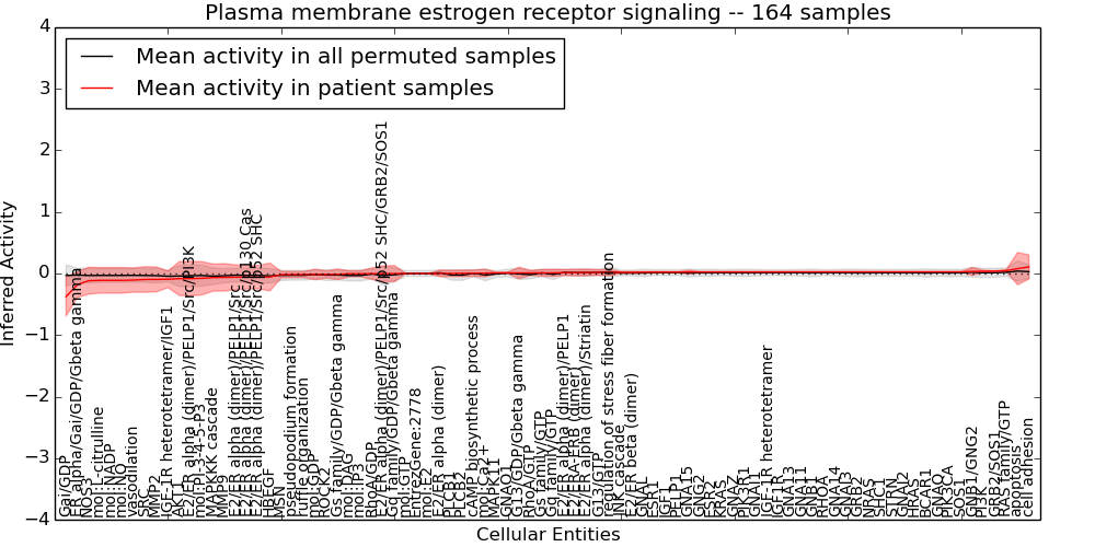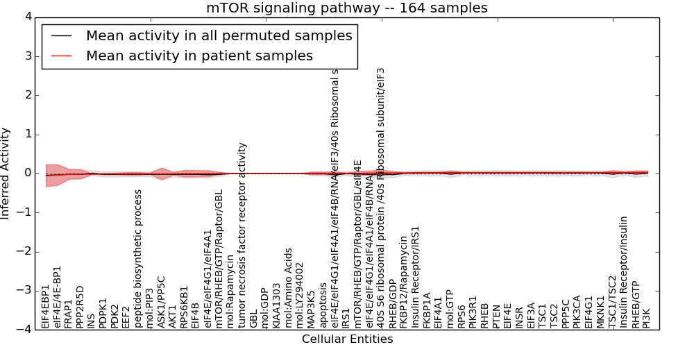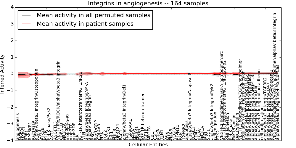 Figure S131. Get High-res Image This plot shows pathway concept perturbations across all samples against a permutation model. The concepts along the x-axis are sorted by lowest to highest mean activity for the real patient samples. Mean inferred activities are plotted along the y-axis as a colored band showing the average level and one standard deviation range. Real samples are shown in red and permuted samples in black.