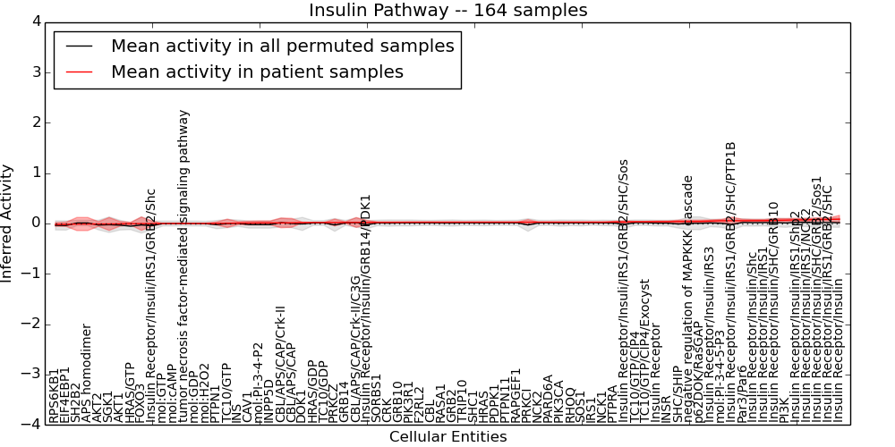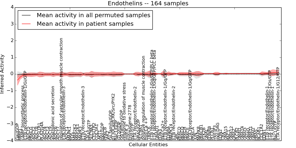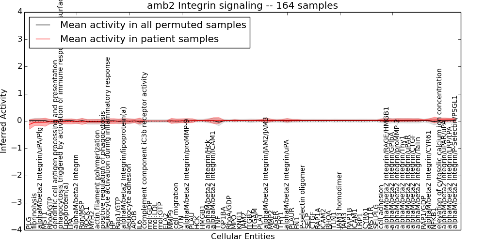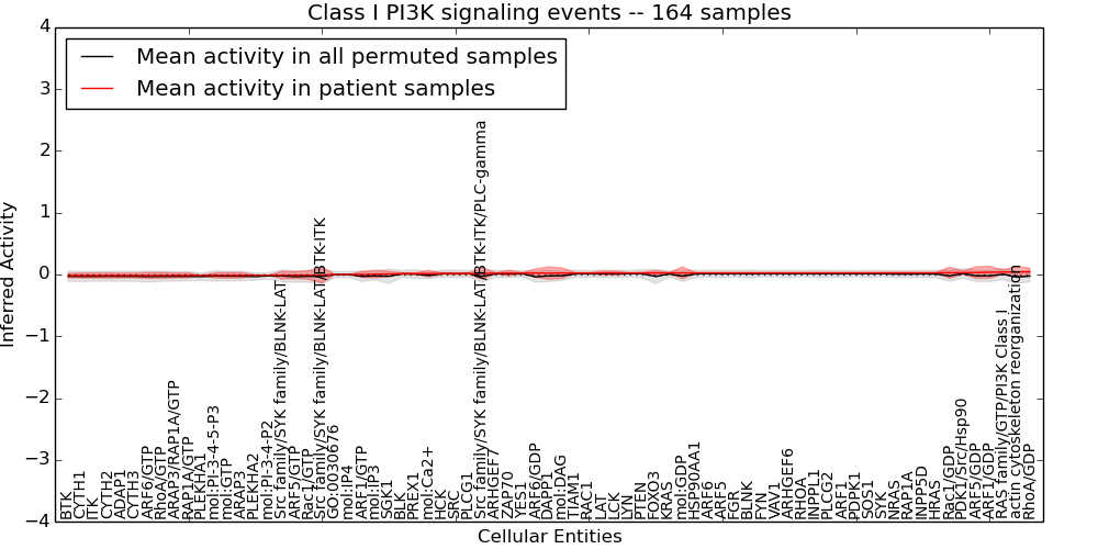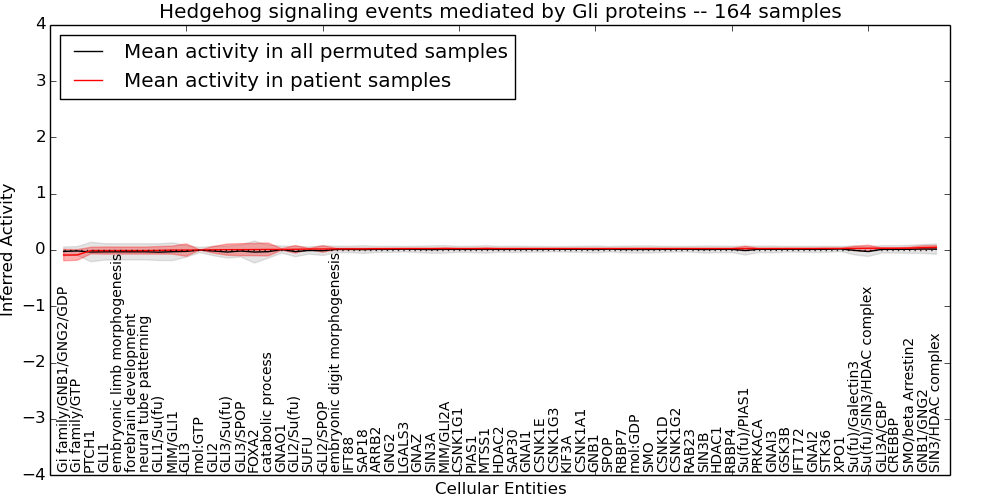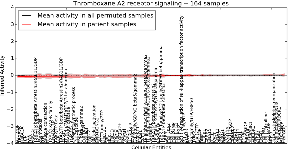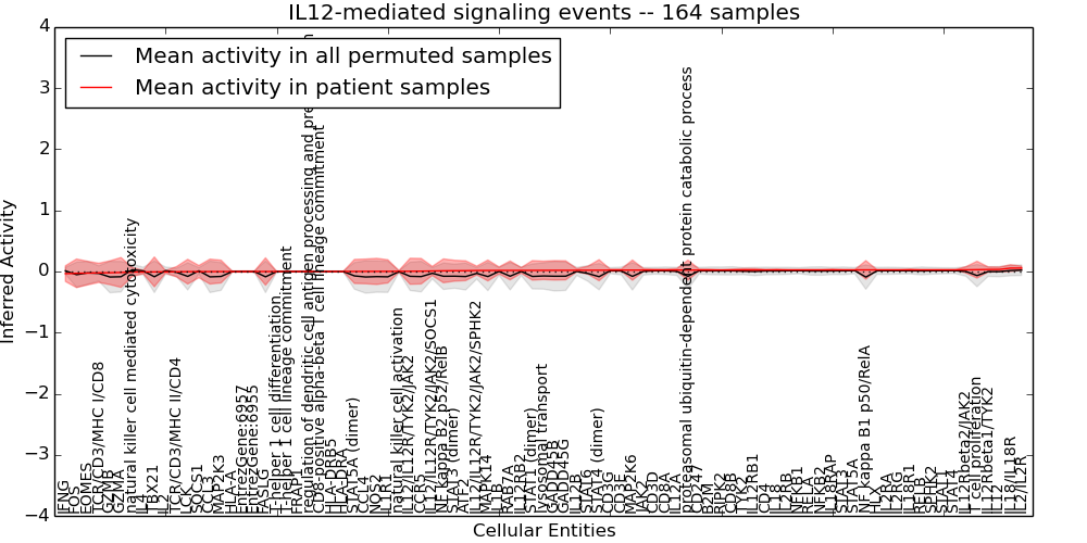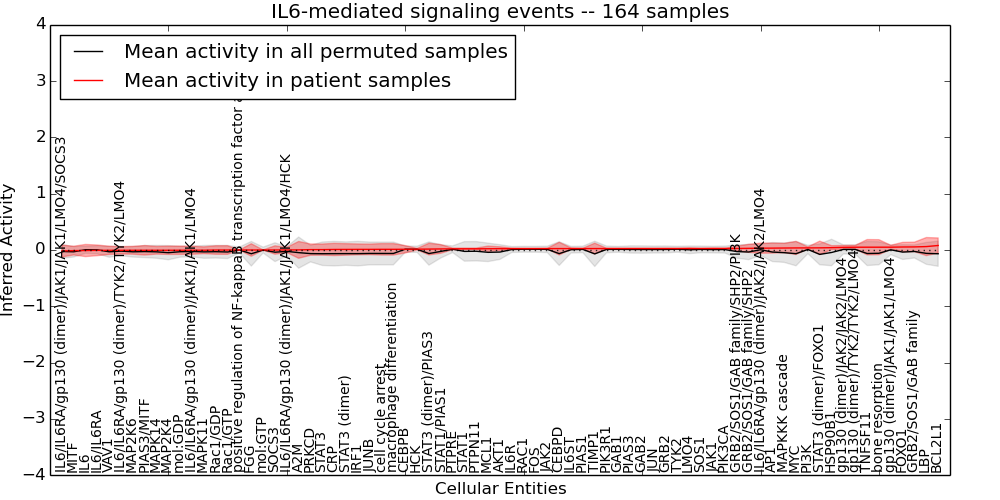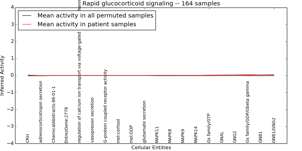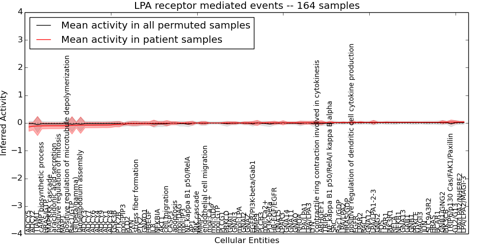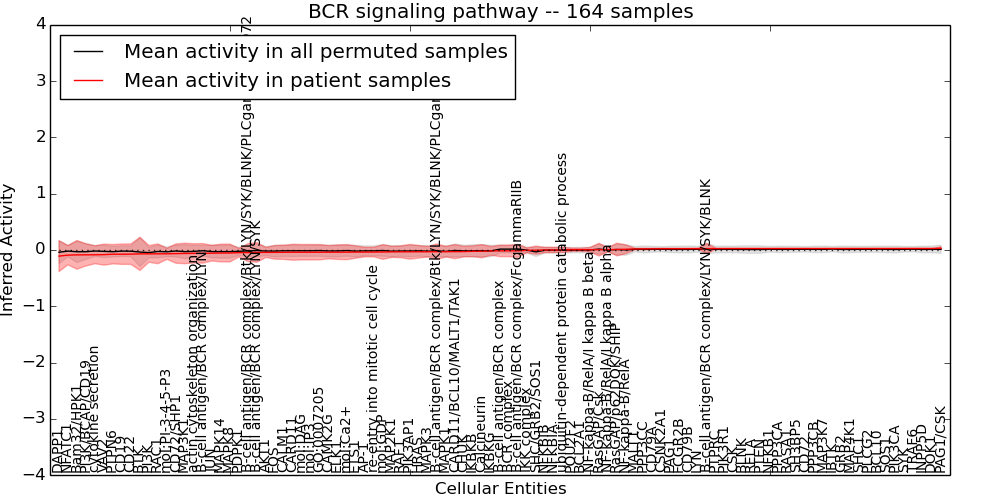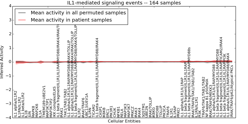 Figure S128. Get High-res Image This plot shows pathway concept perturbations across all samples against a permutation model. The concepts along the x-axis are sorted by lowest to highest mean activity for the real patient samples. Mean inferred activities are plotted along the y-axis as a colored band showing the average level and one standard deviation range. Real samples are shown in red and permuted samples in black.