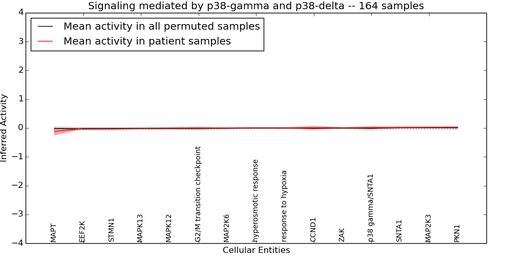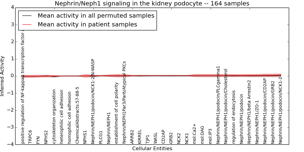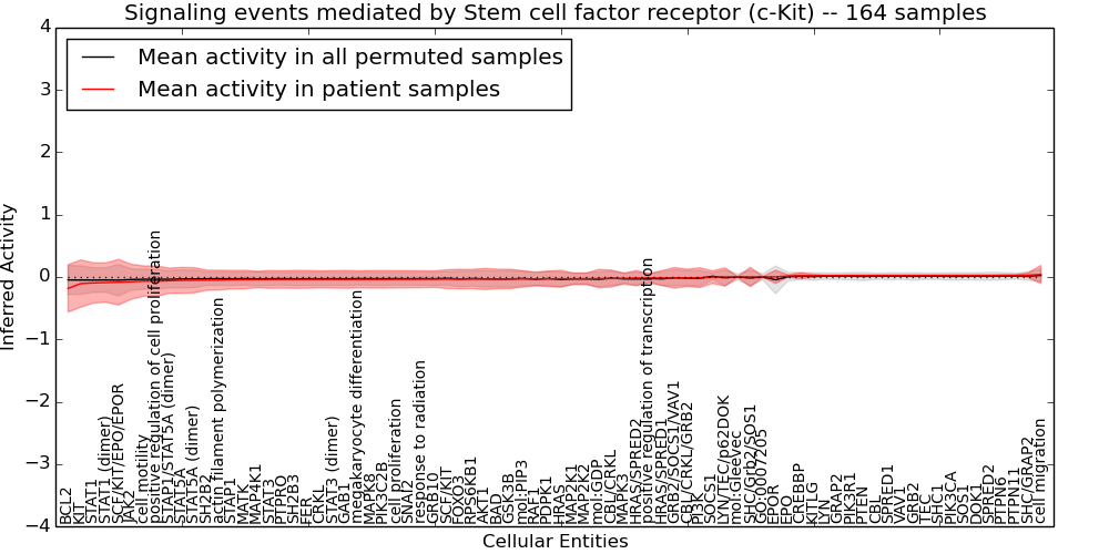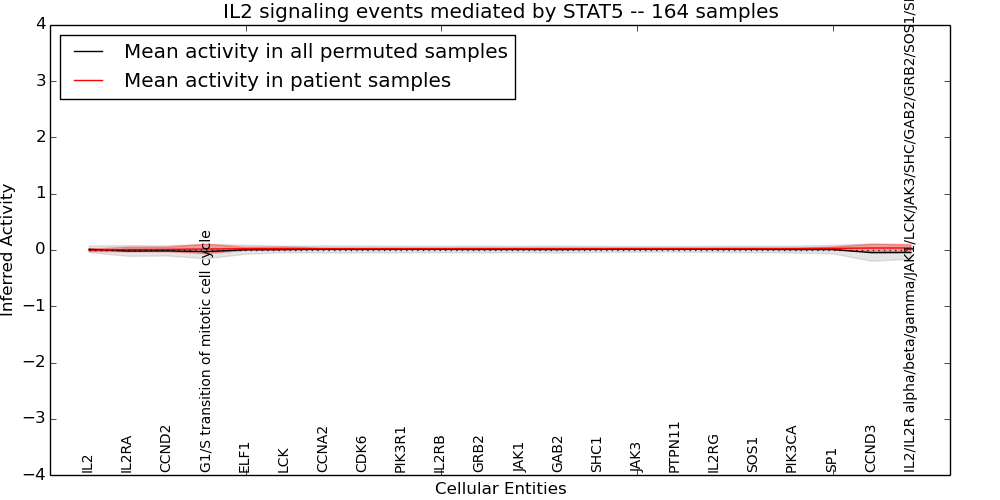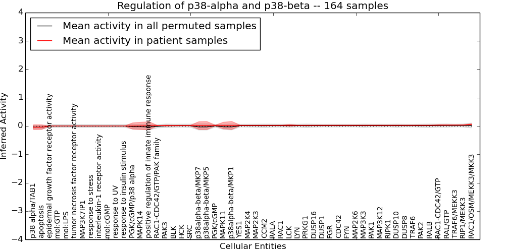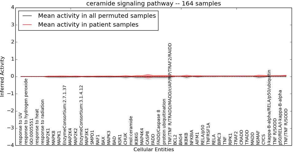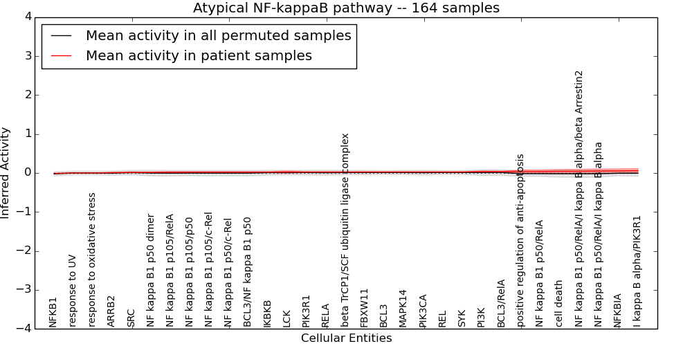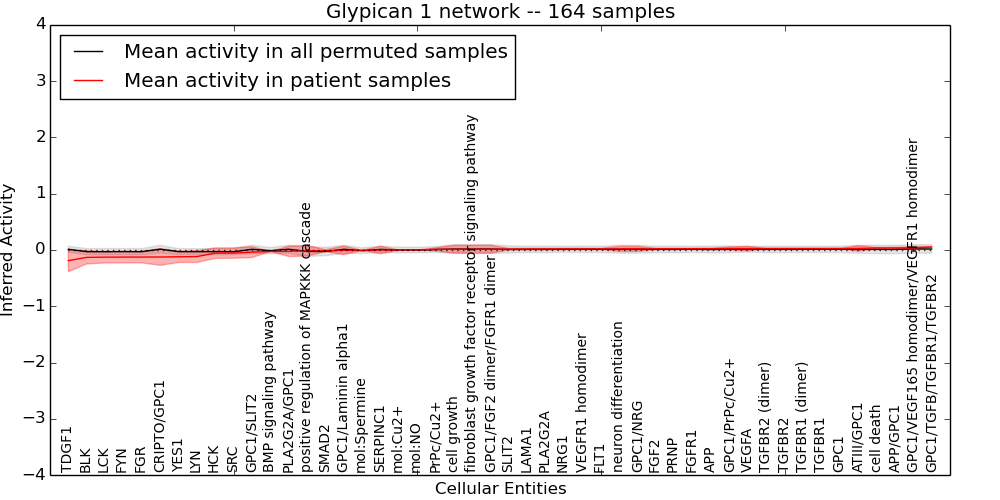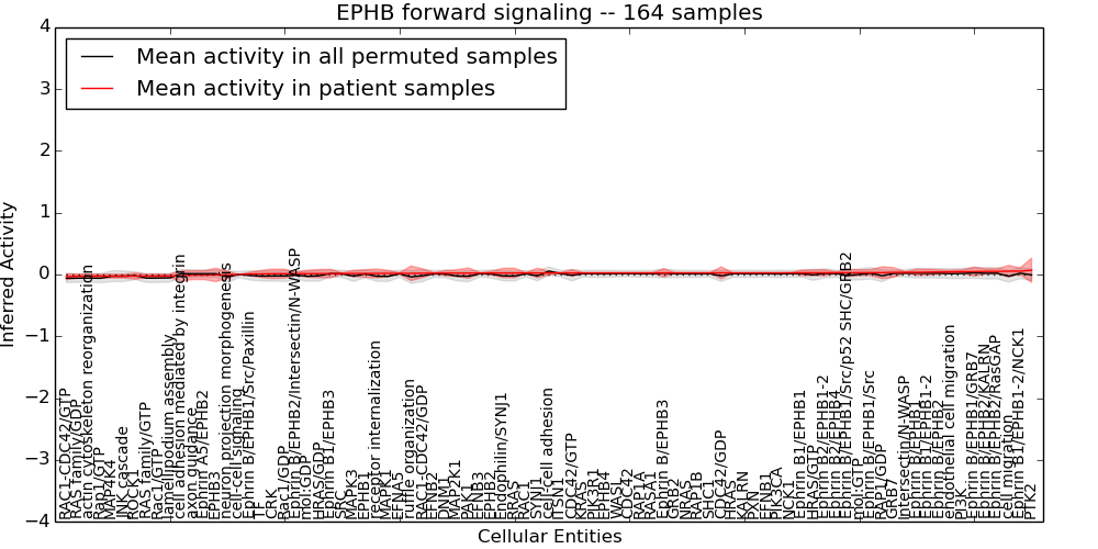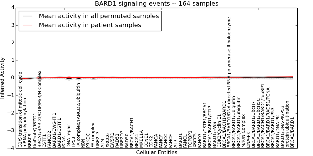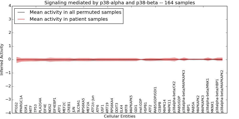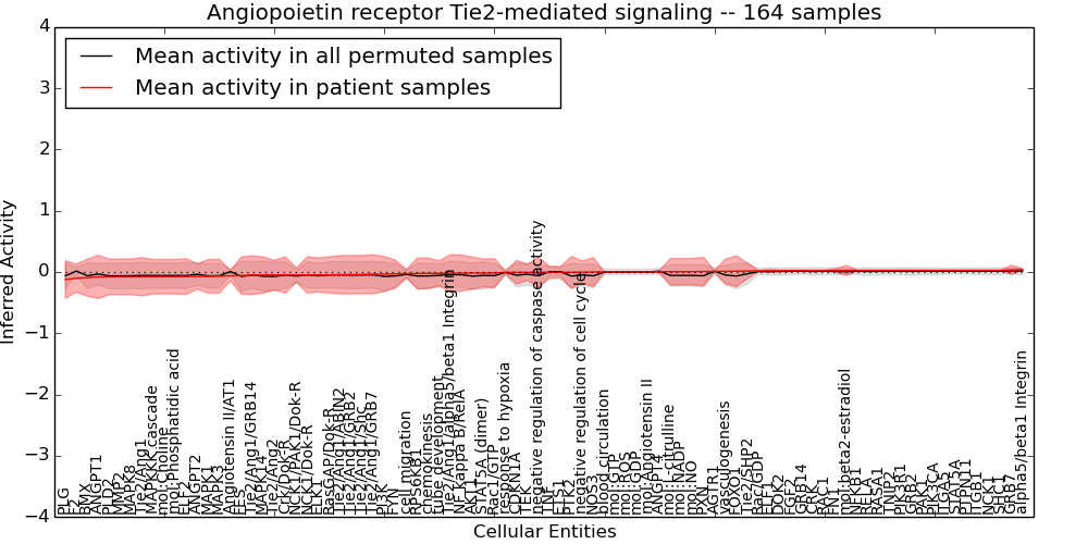 Figure S128. Get High-res Image This plot shows pathway concept perturbations across all samples against a permutation model. The concepts along the x-axis are sorted by lowest to highest mean activity for the real patient samples. Mean inferred activities are plotted along the y-axis as a colored band showing the average level and one standard deviation range. Real samples are shown in red and permuted samples in black.