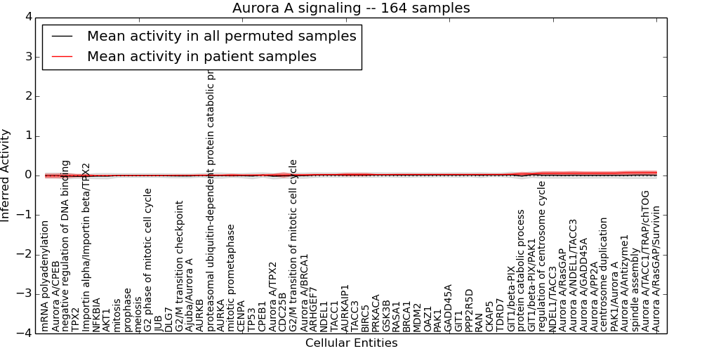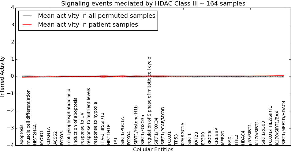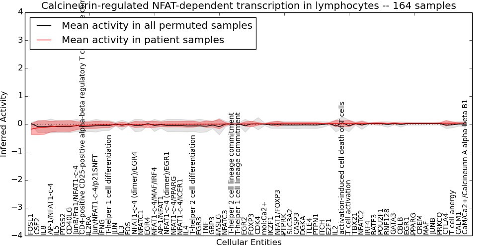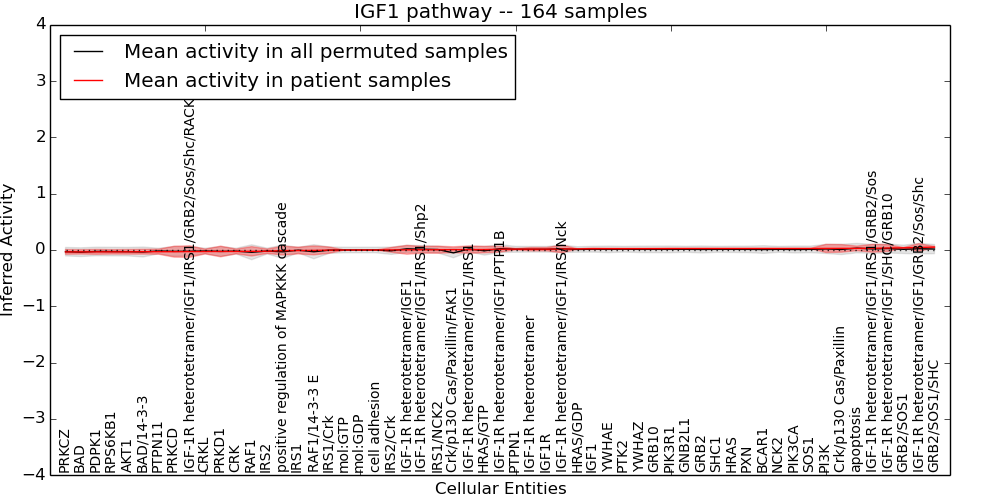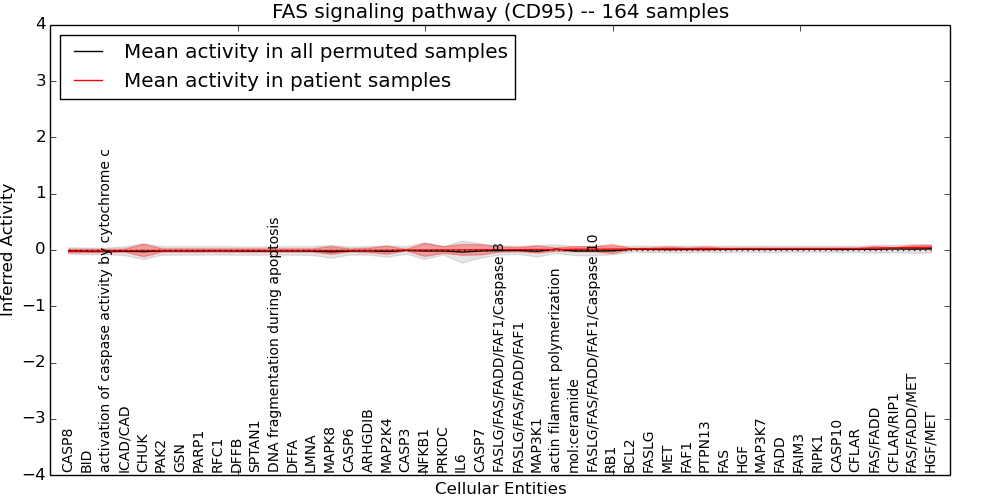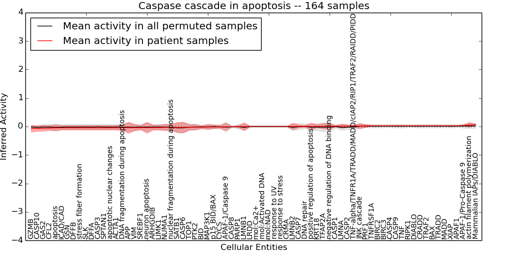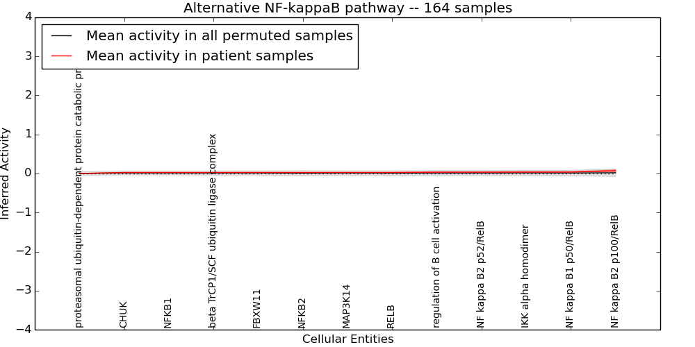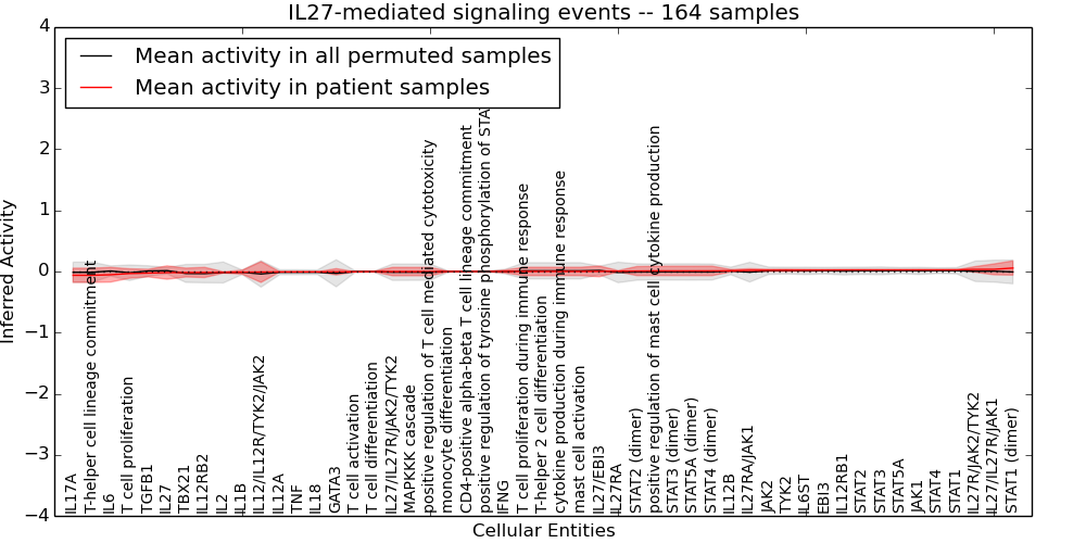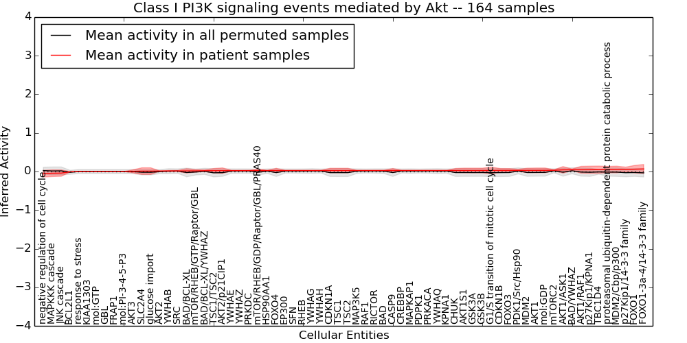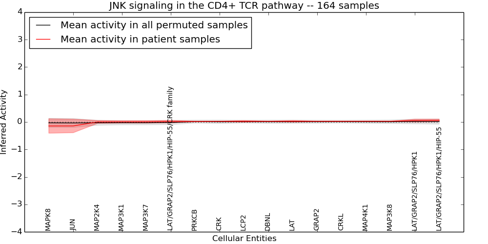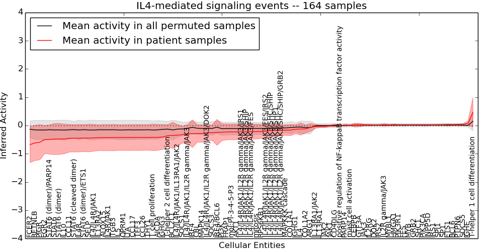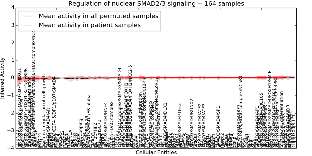Figure S128. Get High-res Image This plot shows pathway concept perturbations across all samples against a permutation model. The concepts along the x-axis are sorted by lowest to highest mean activity for the real patient samples. Mean inferred activities are plotted along the y-axis as a colored band showing the average level and one standard deviation range. Real samples are shown in red and permuted samples in black.