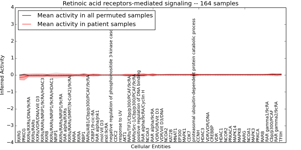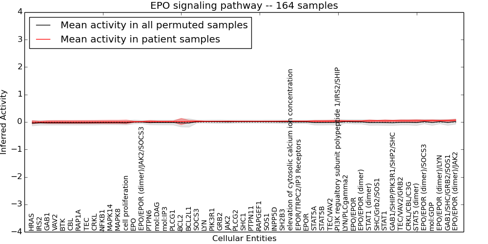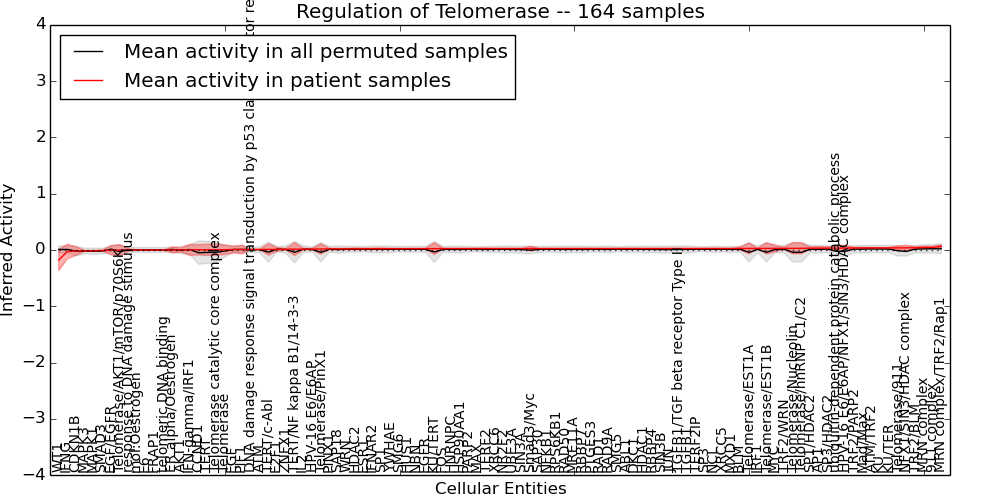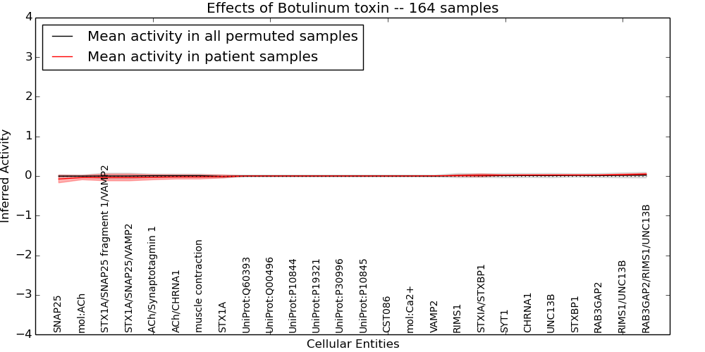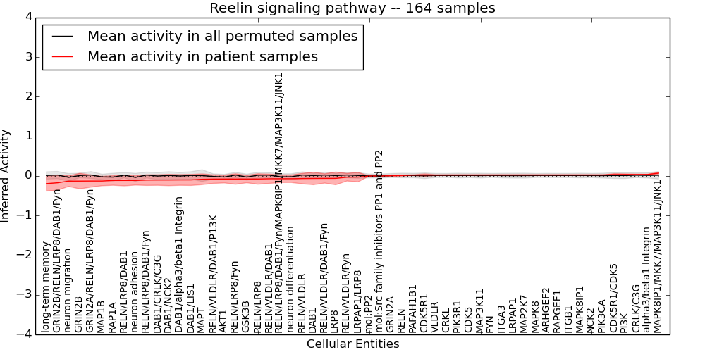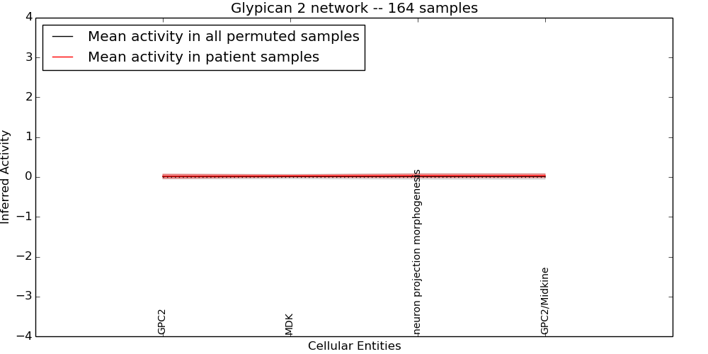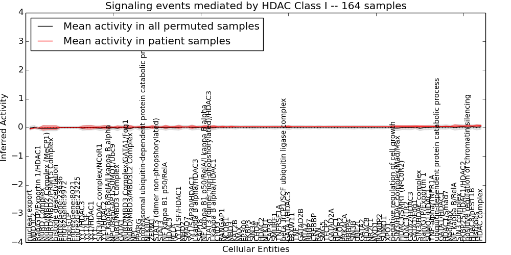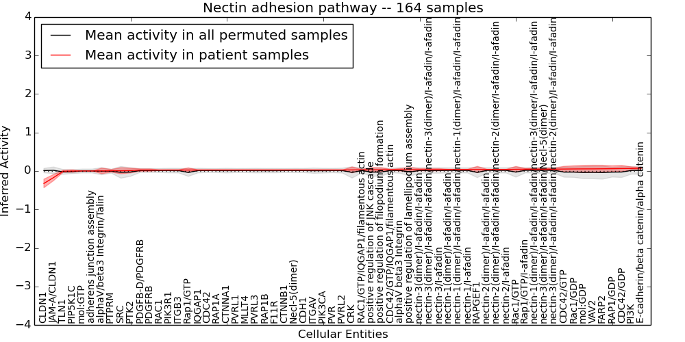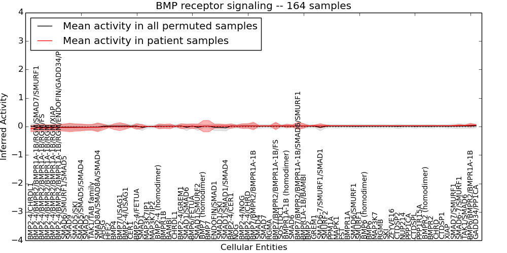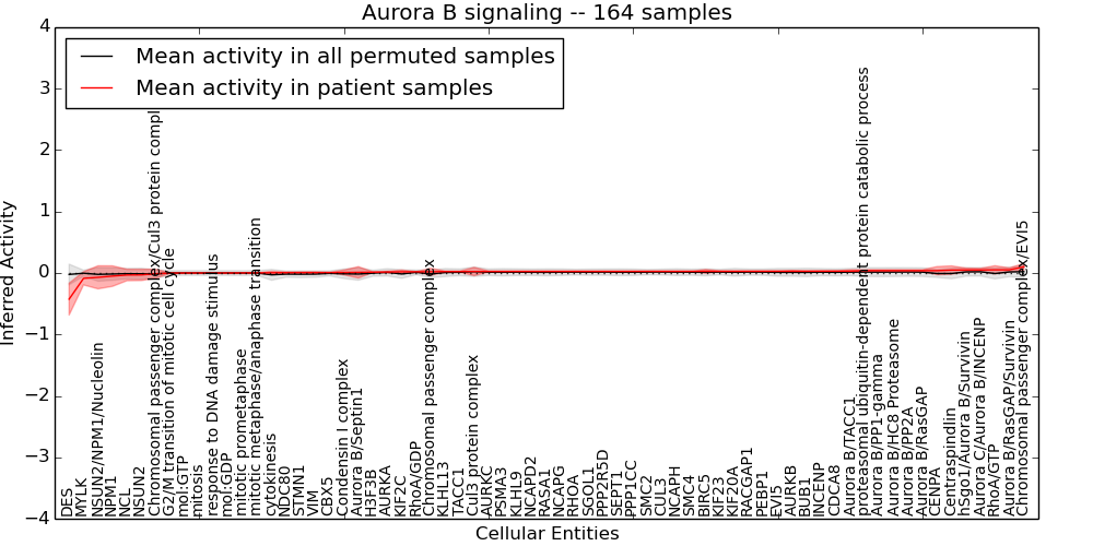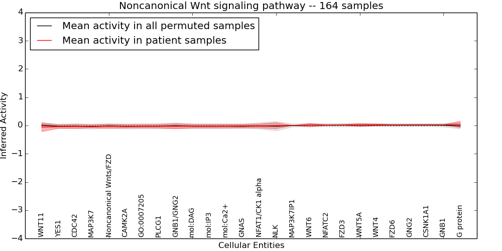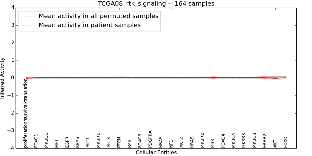 Figure S128. Get High-res Image This plot shows pathway concept perturbations across all samples against a permutation model. The concepts along the x-axis are sorted by lowest to highest mean activity for the real patient samples. Mean inferred activities are plotted along the y-axis as a colored band showing the average level and one standard deviation range. Real samples are shown in red and permuted samples in black.