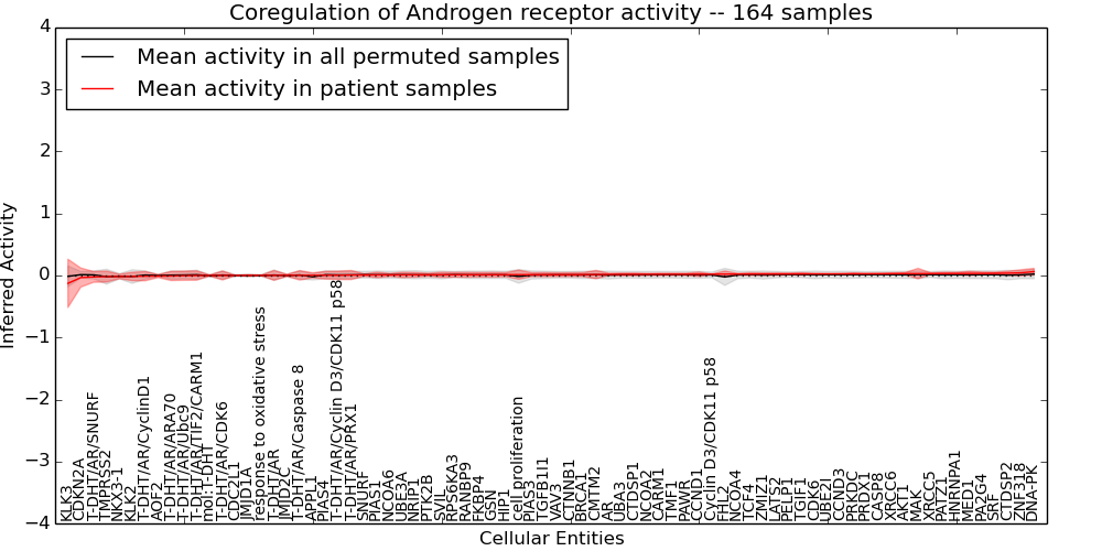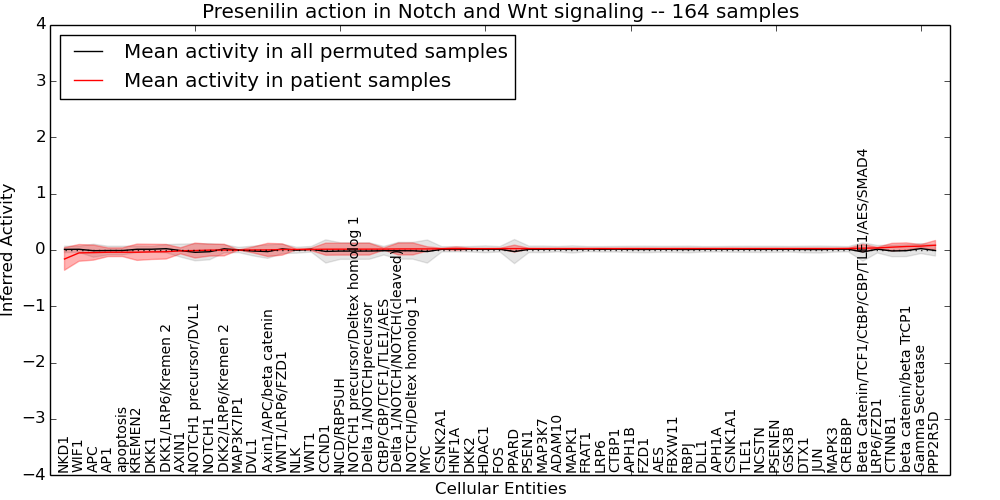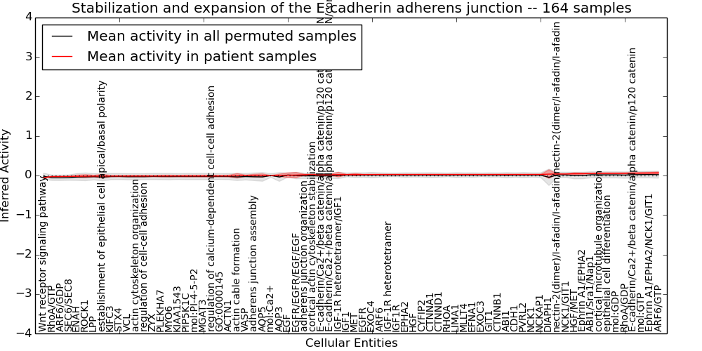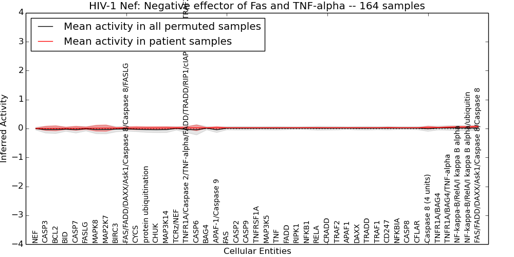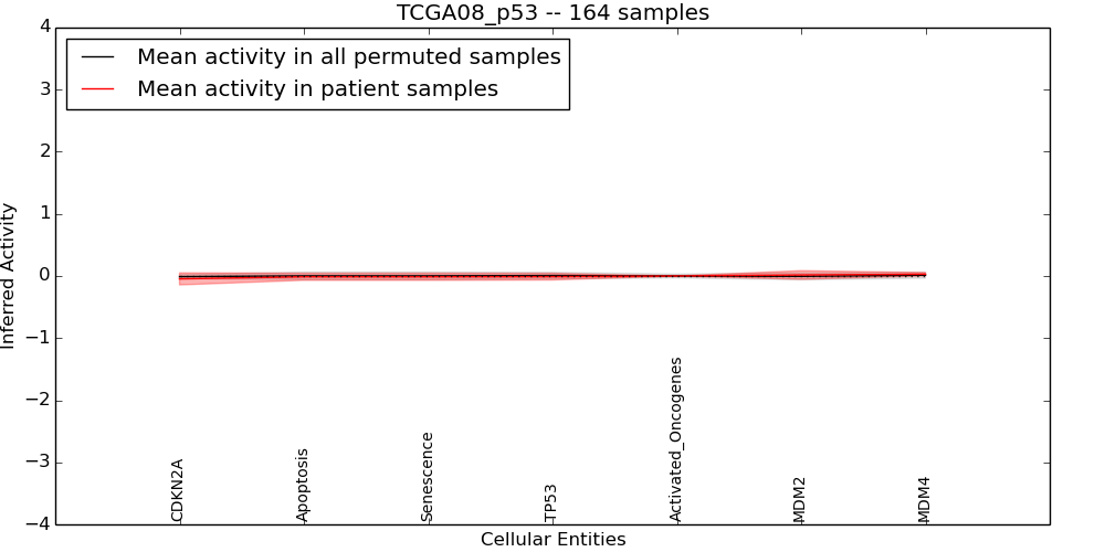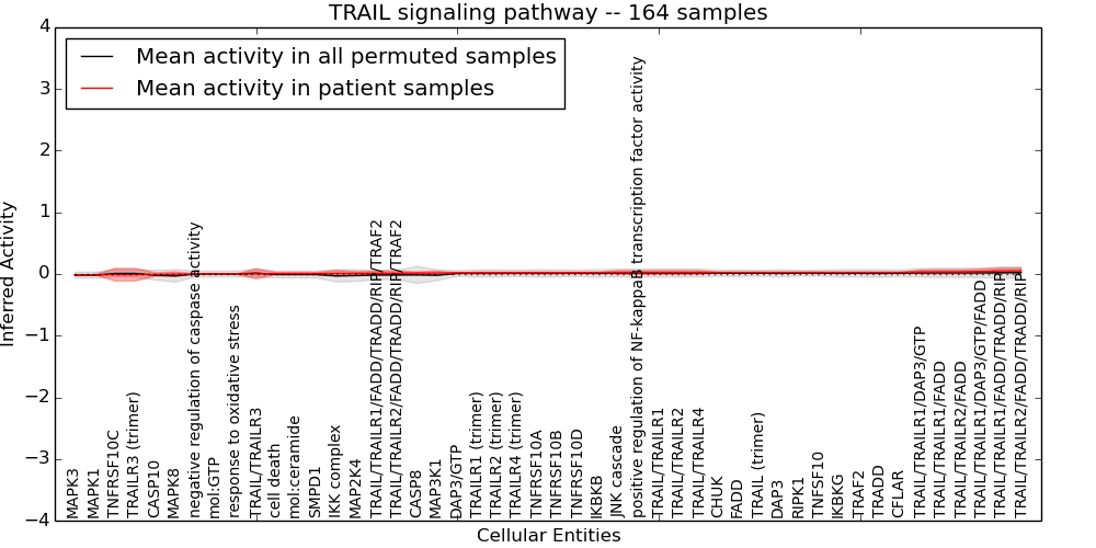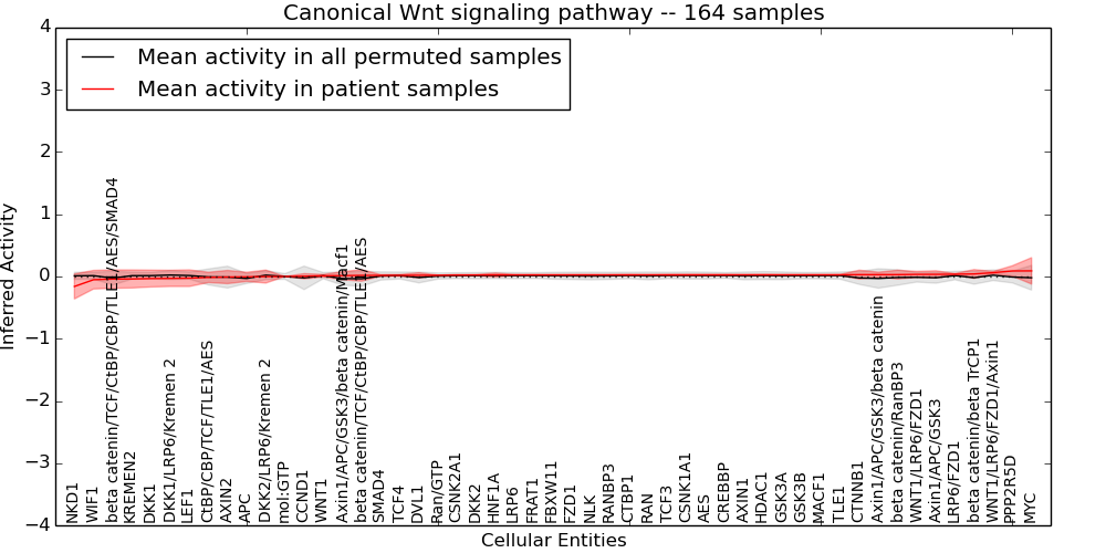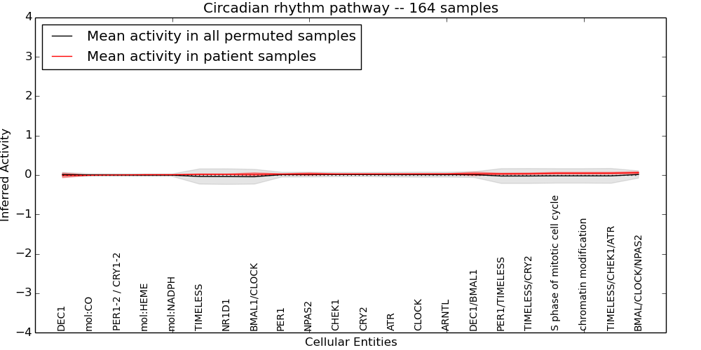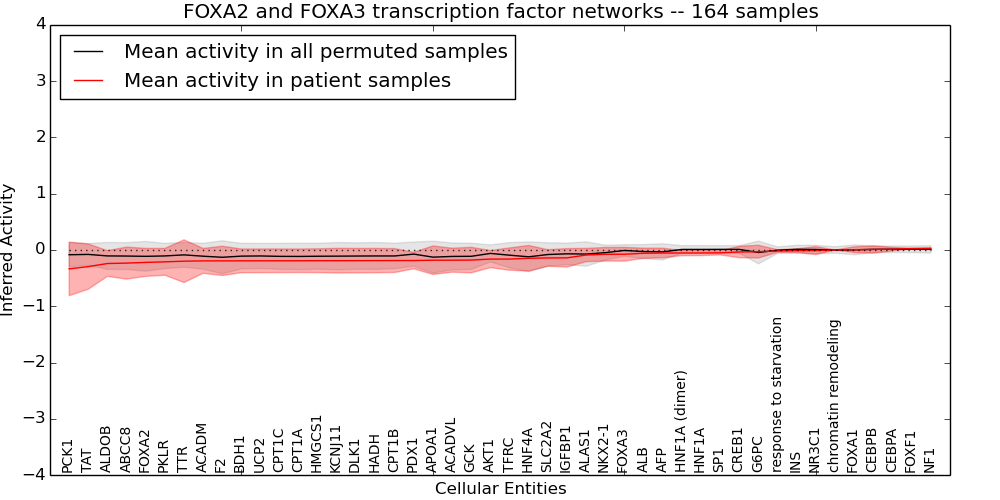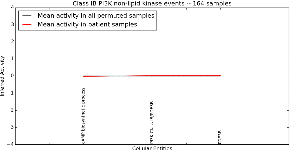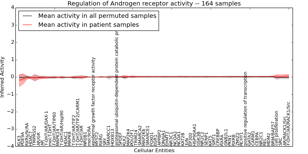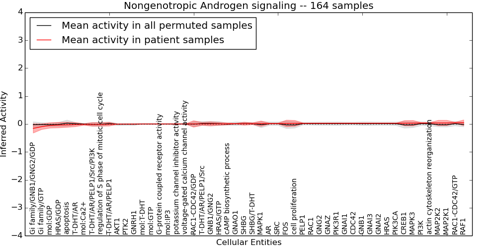 Figure S128. Get High-res Image This plot shows pathway concept perturbations across all samples against a permutation model. The concepts along the x-axis are sorted by lowest to highest mean activity for the real patient samples. Mean inferred activities are plotted along the y-axis as a colored band showing the average level and one standard deviation range. Real samples are shown in red and permuted samples in black.