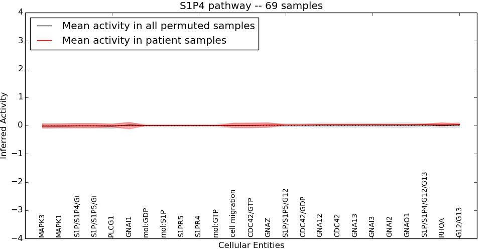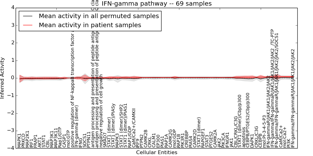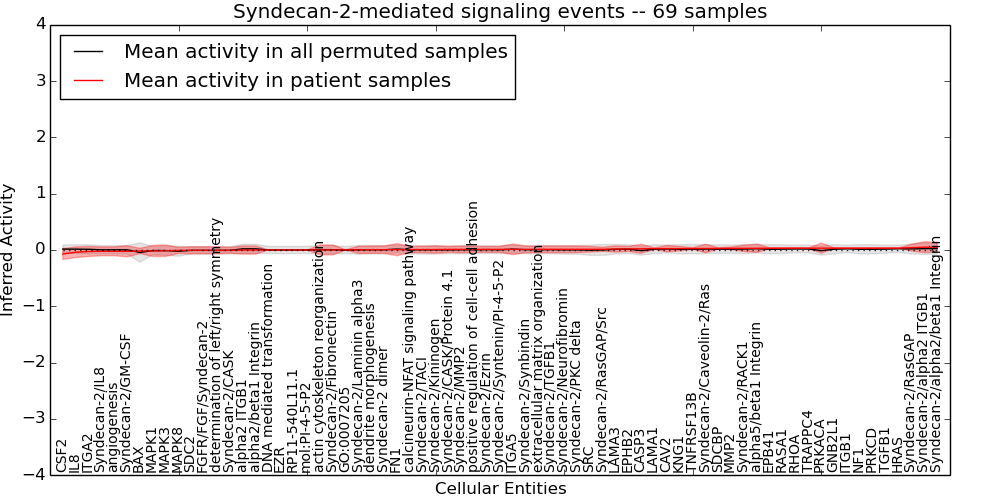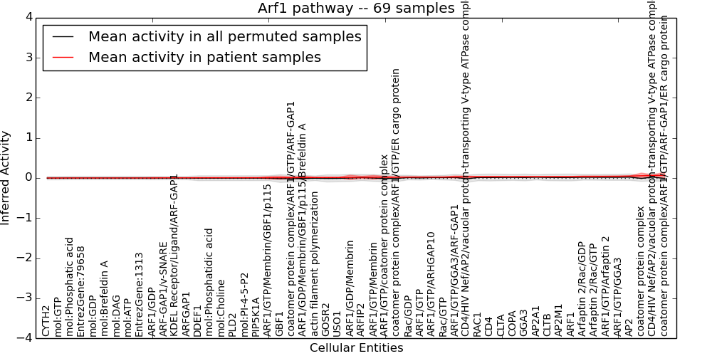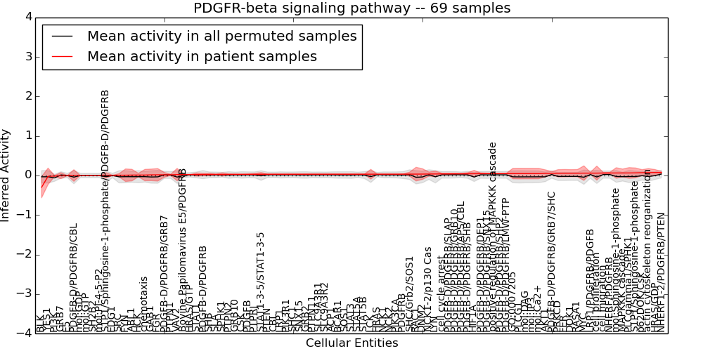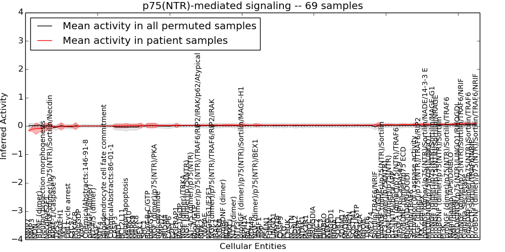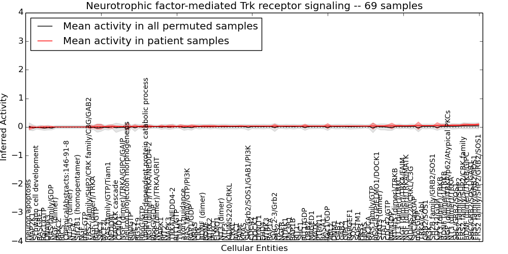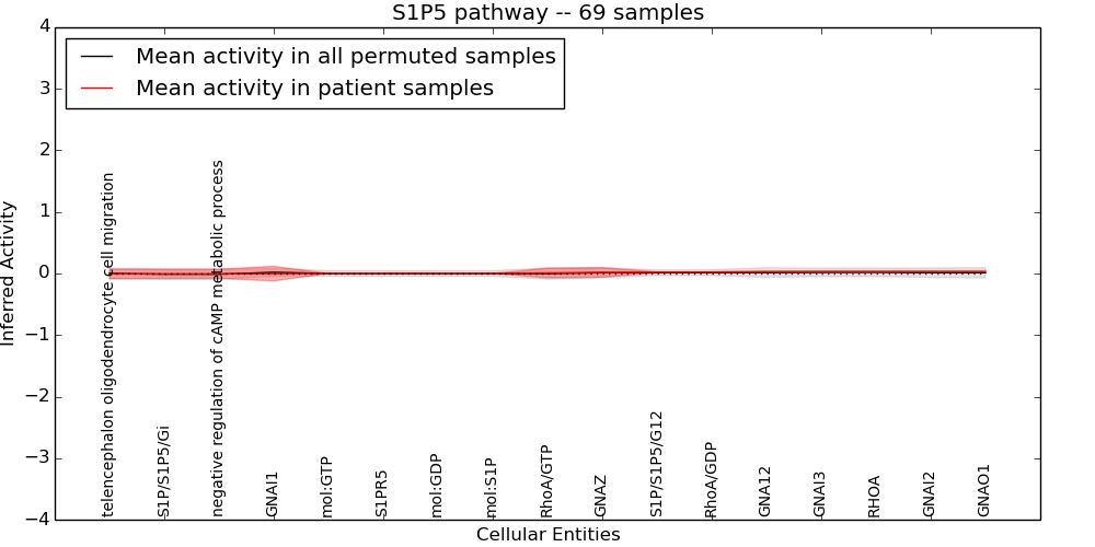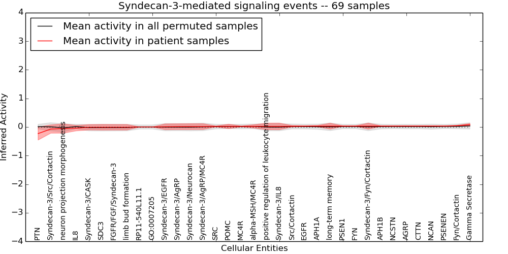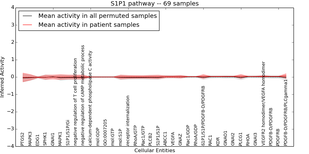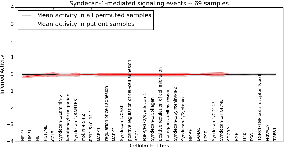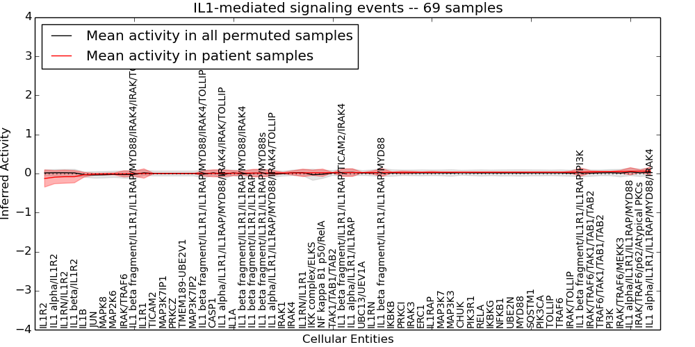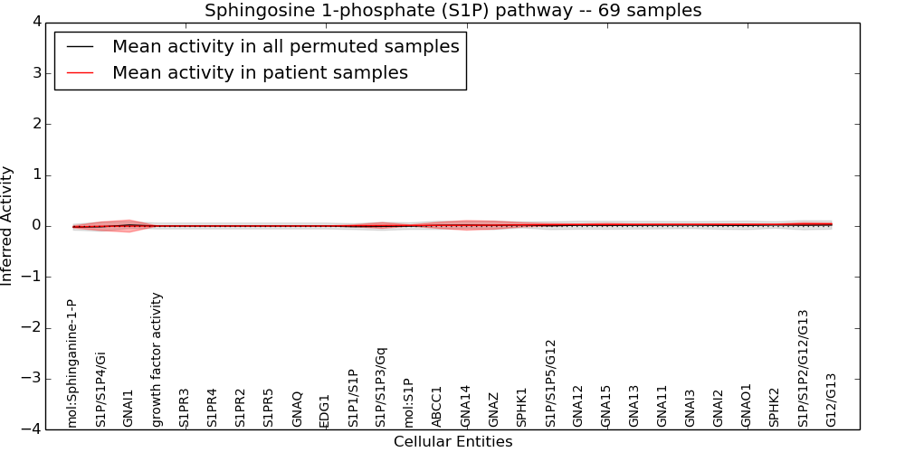 Figure S131. Get High-res Image This plot shows pathway concept perturbations across all samples against a permutation model. The concepts along the x-axis are sorted by lowest to highest mean activity for the real patient samples. Mean inferred activities are plotted along the y-axis as a colored band showing the average level and one standard deviation range. Real samples are shown in red and permuted samples in black.