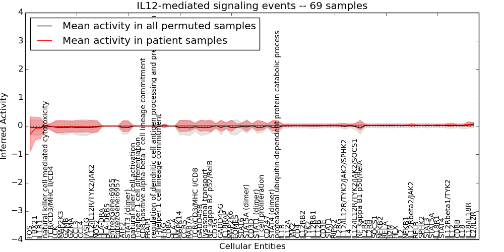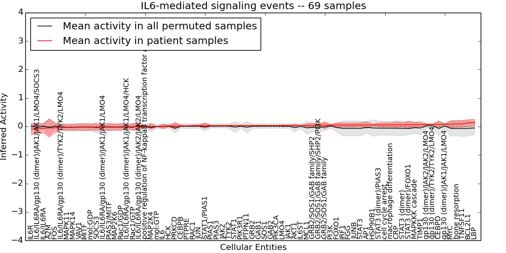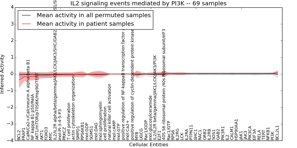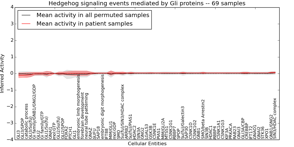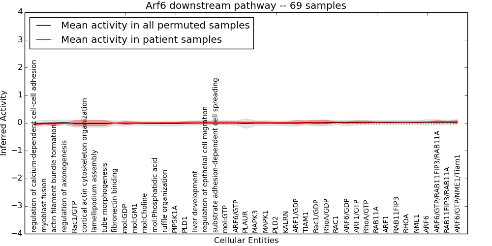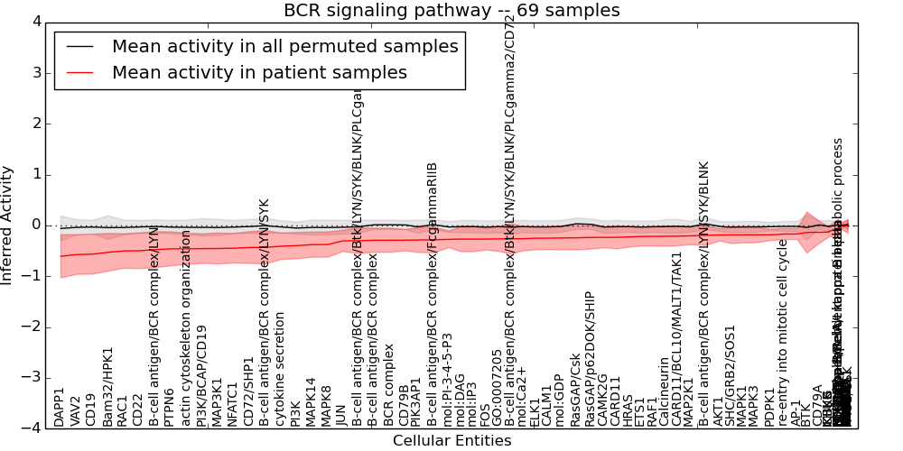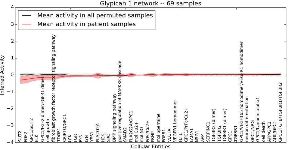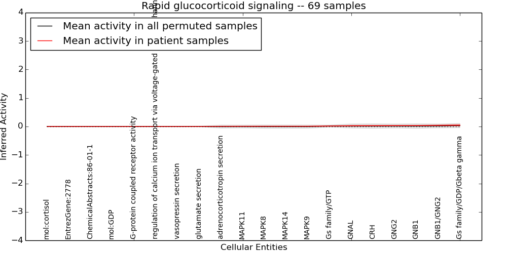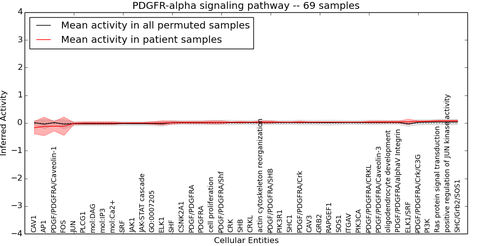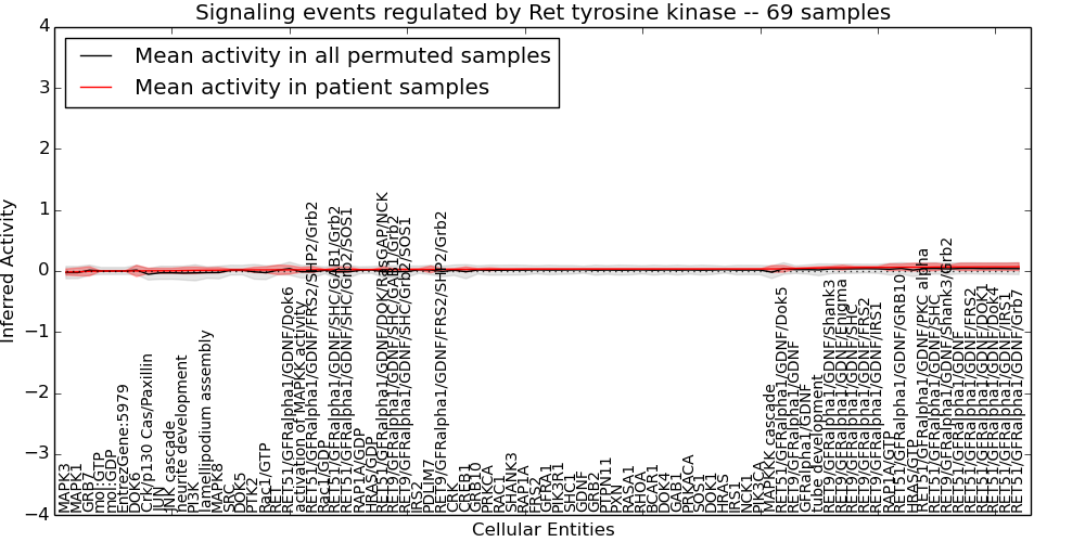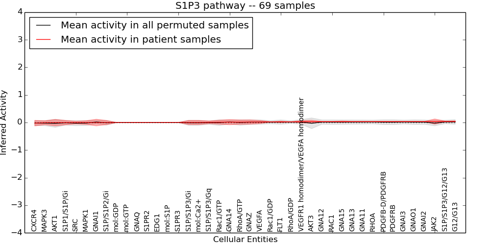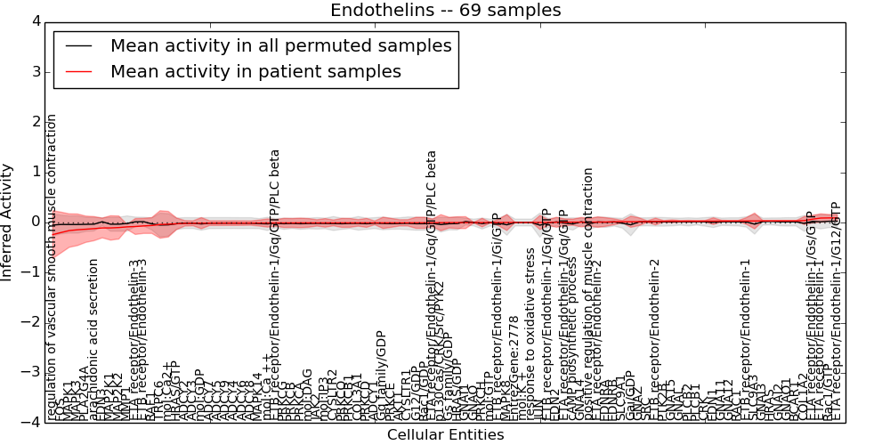Figure S131. Get High-res Image This plot shows pathway concept perturbations across all samples against a permutation model. The concepts along the x-axis are sorted by lowest to highest mean activity for the real patient samples. Mean inferred activities are plotted along the y-axis as a colored band showing the average level and one standard deviation range. Real samples are shown in red and permuted samples in black.