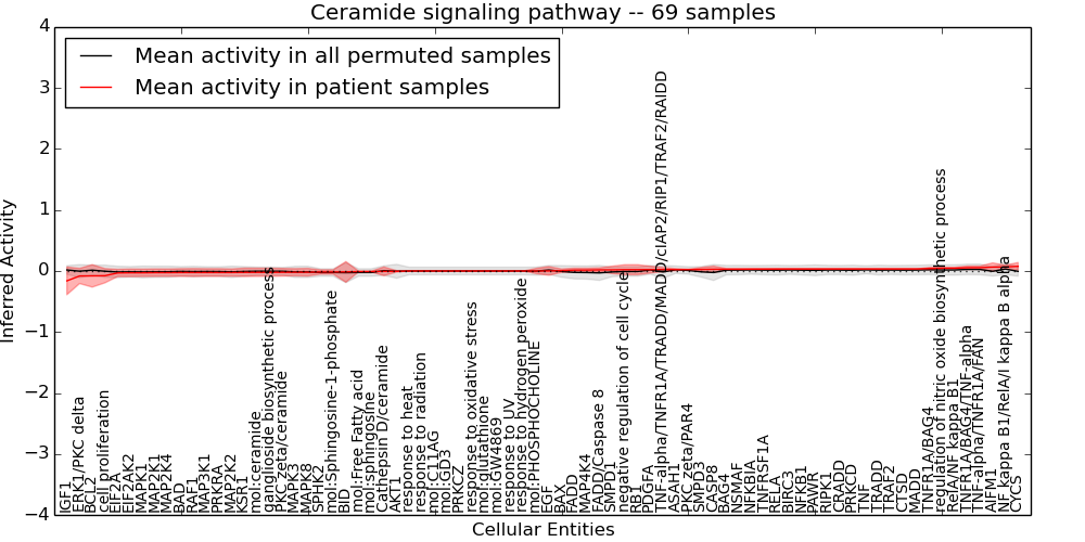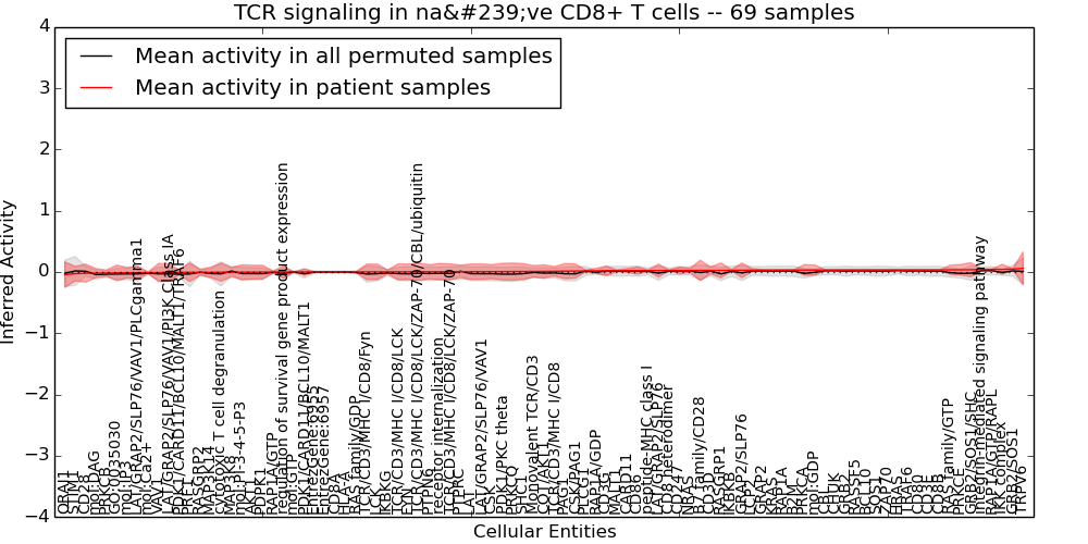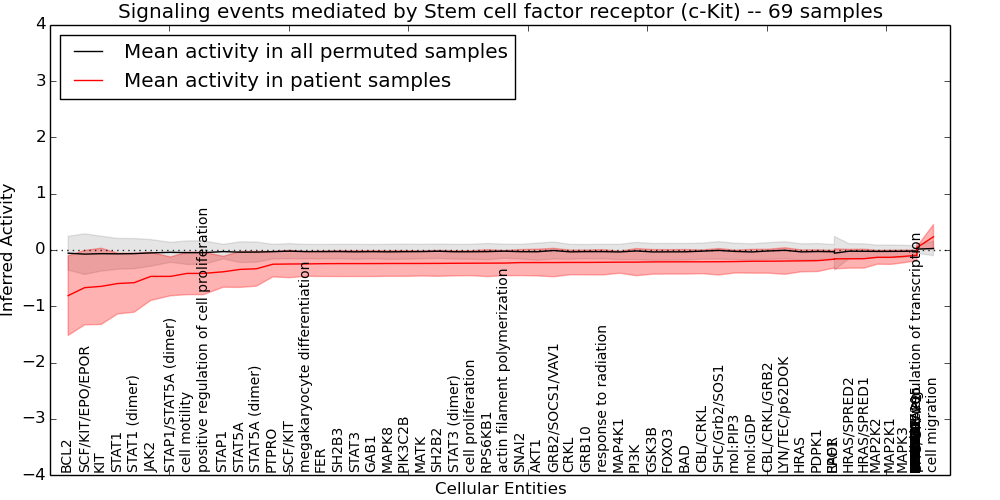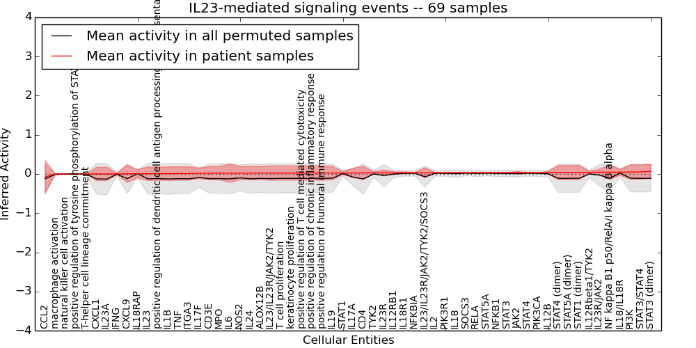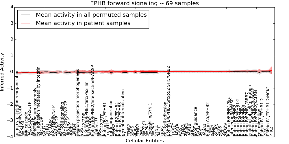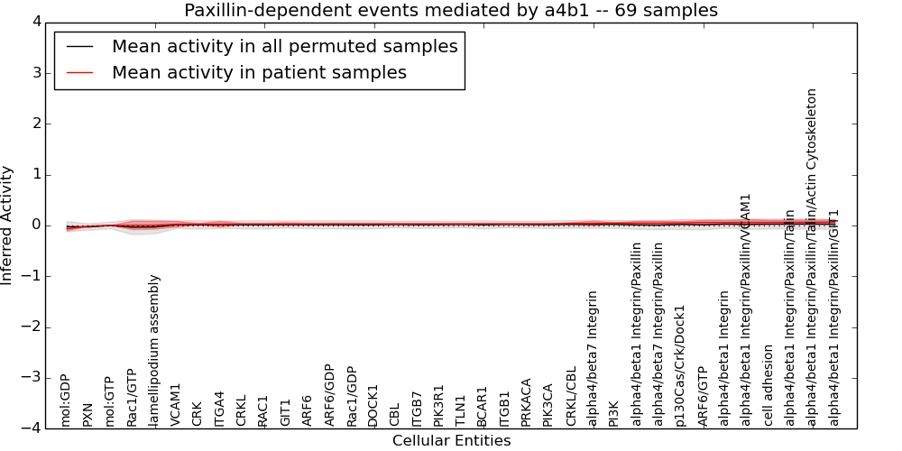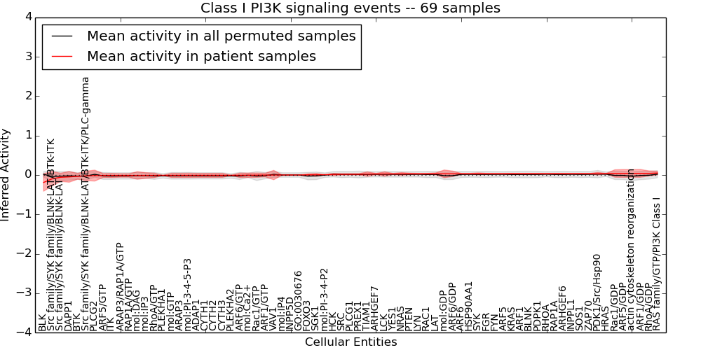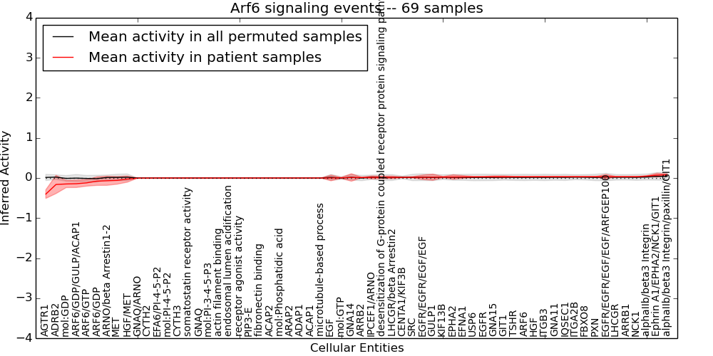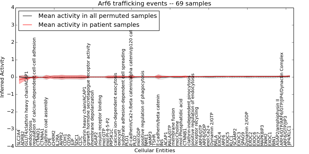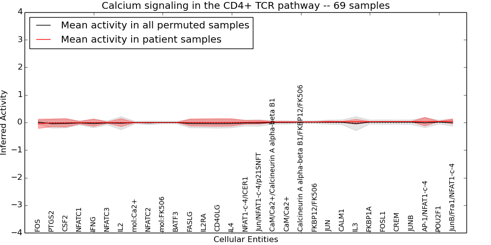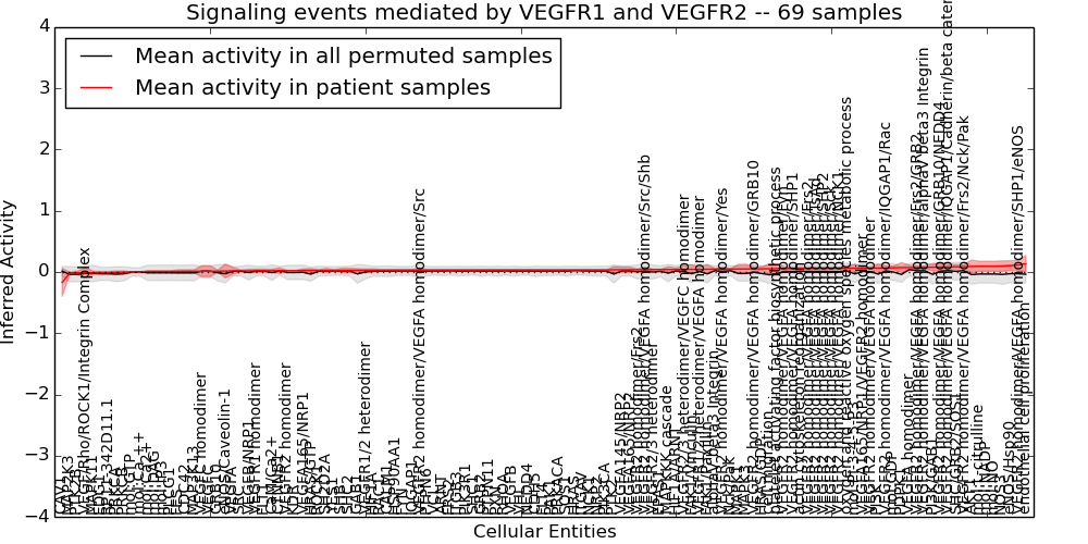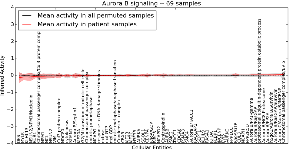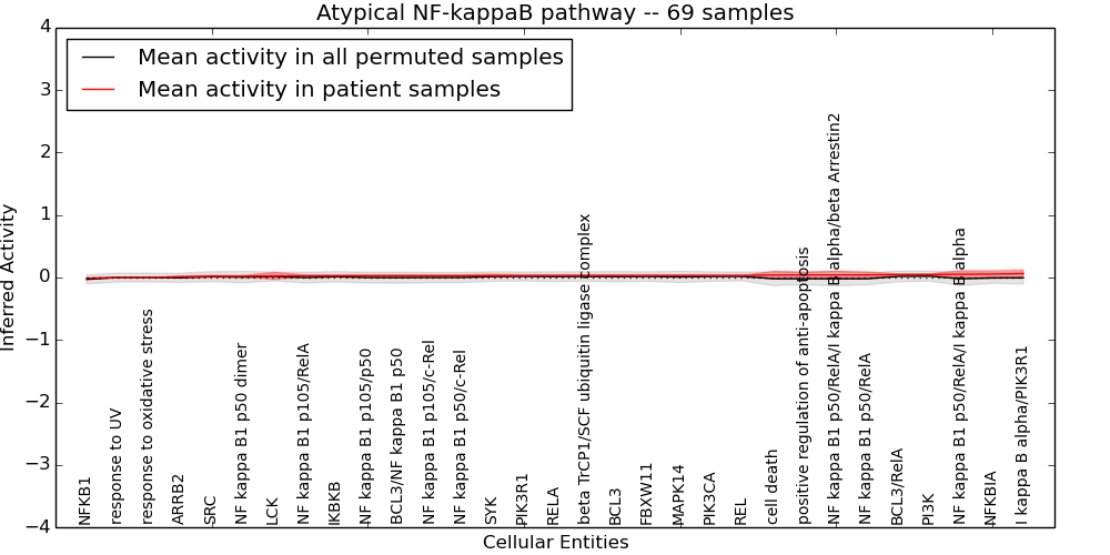Figure S131. Get High-res Image This plot shows pathway concept perturbations across all samples against a permutation model. The concepts along the x-axis are sorted by lowest to highest mean activity for the real patient samples. Mean inferred activities are plotted along the y-axis as a colored band showing the average level and one standard deviation range. Real samples are shown in red and permuted samples in black.