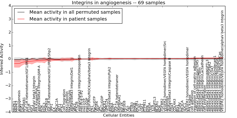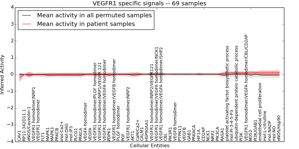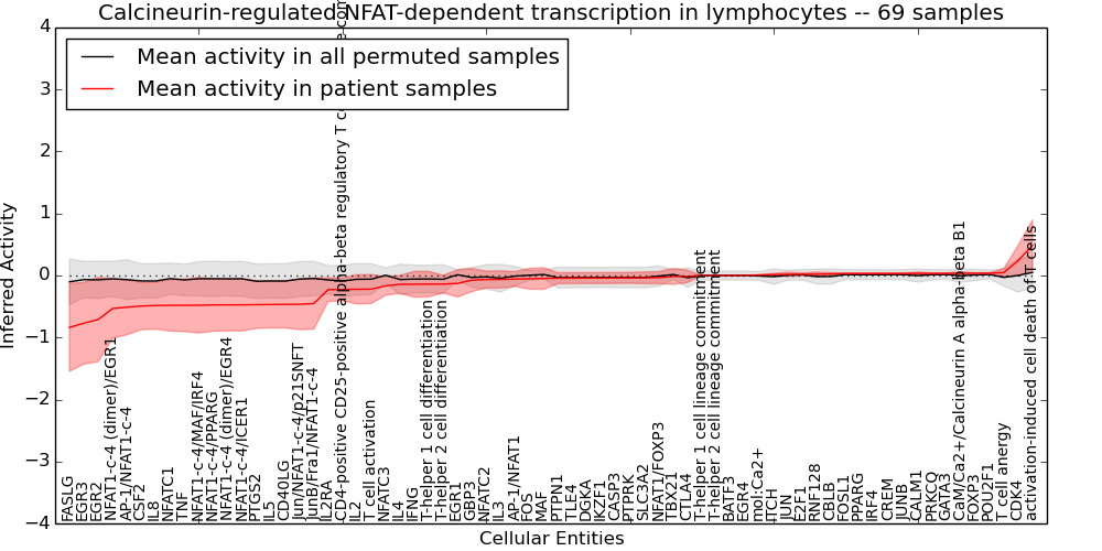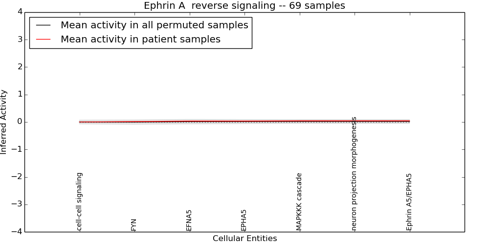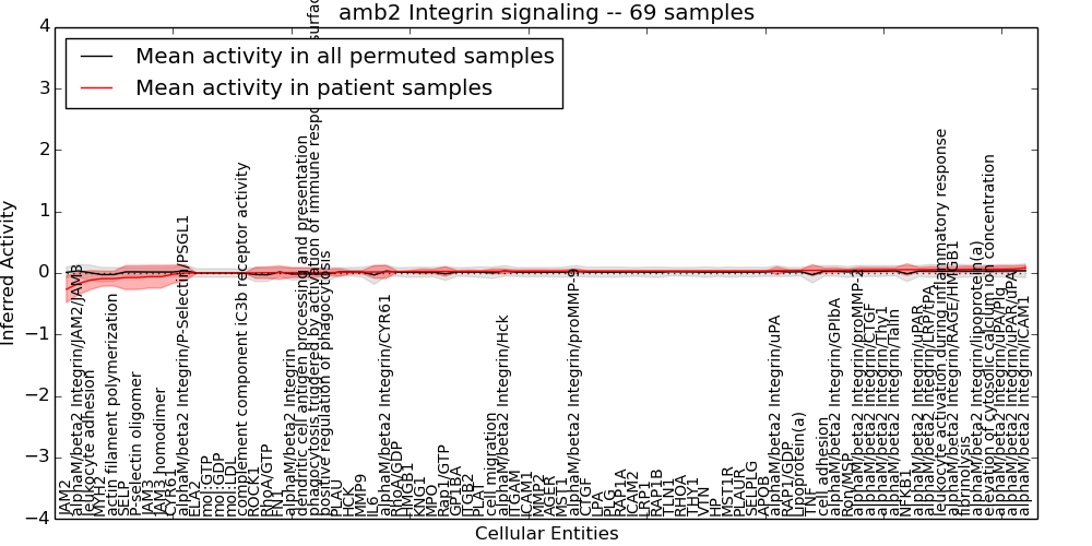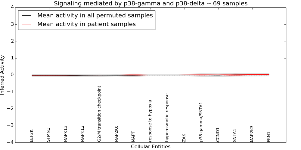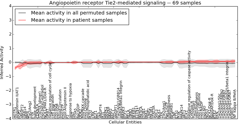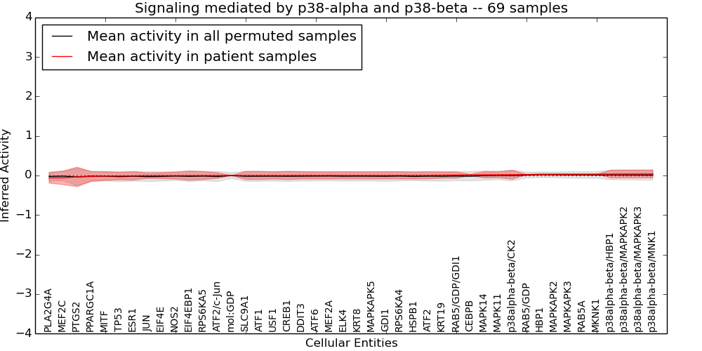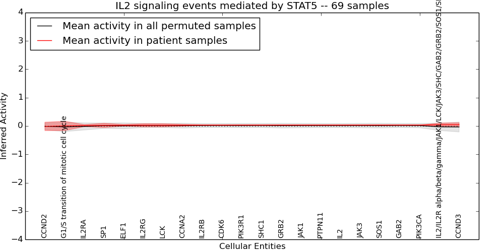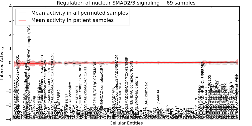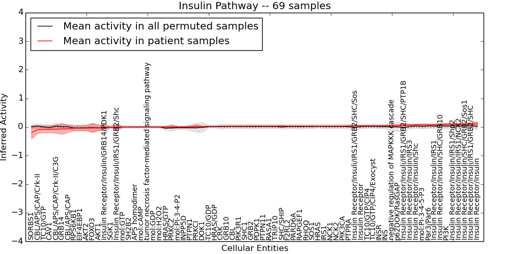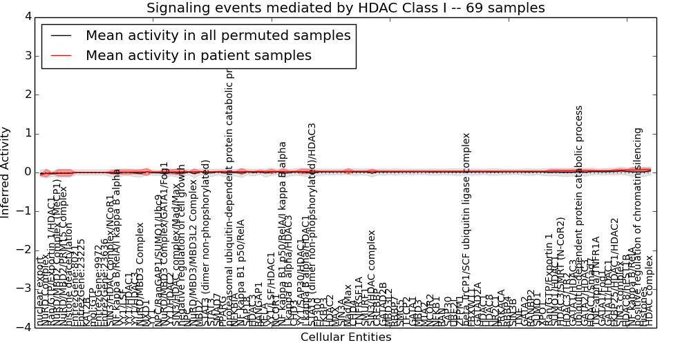 Figure S131. Get High-res Image This plot shows pathway concept perturbations across all samples against a permutation model. The concepts along the x-axis are sorted by lowest to highest mean activity for the real patient samples. Mean inferred activities are plotted along the y-axis as a colored band showing the average level and one standard deviation range. Real samples are shown in red and permuted samples in black.