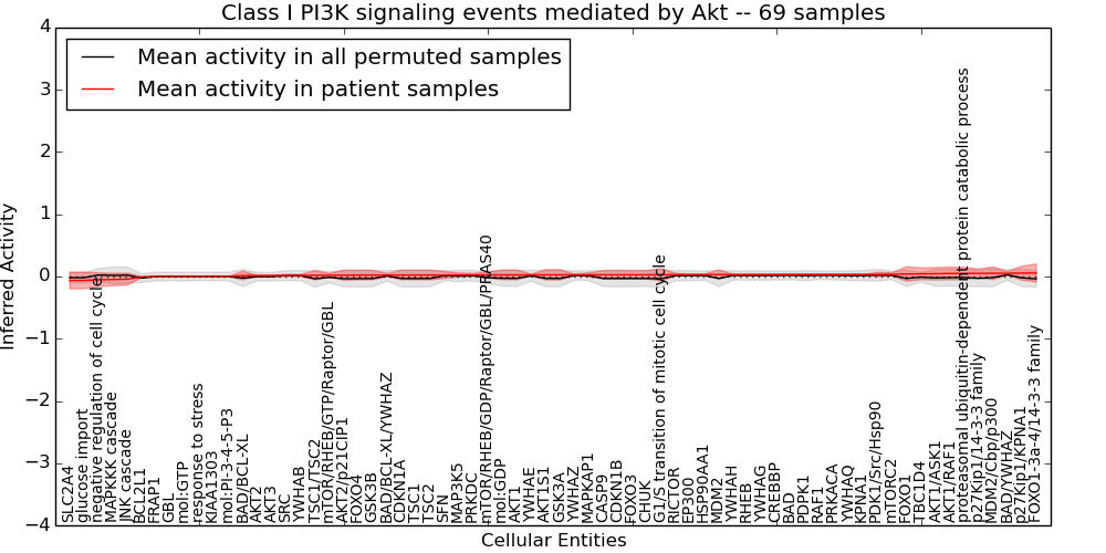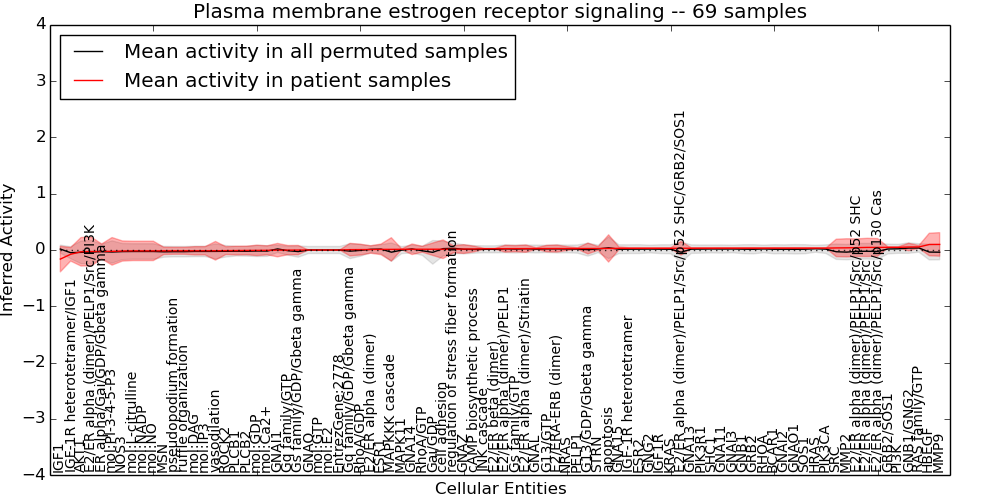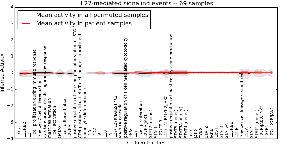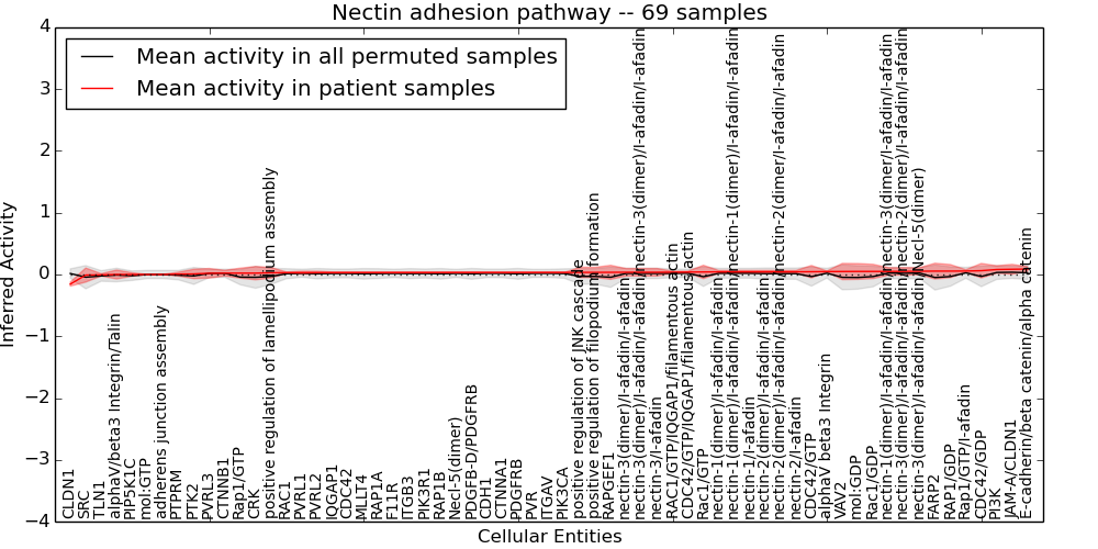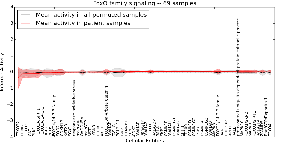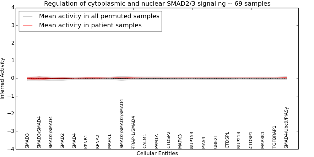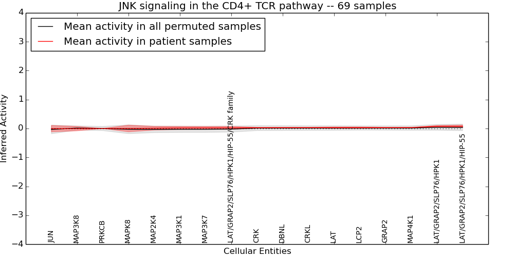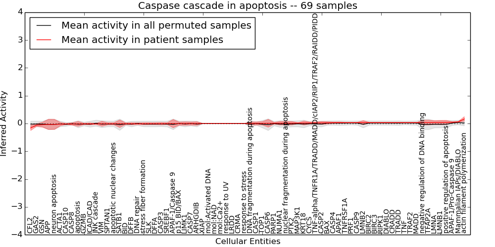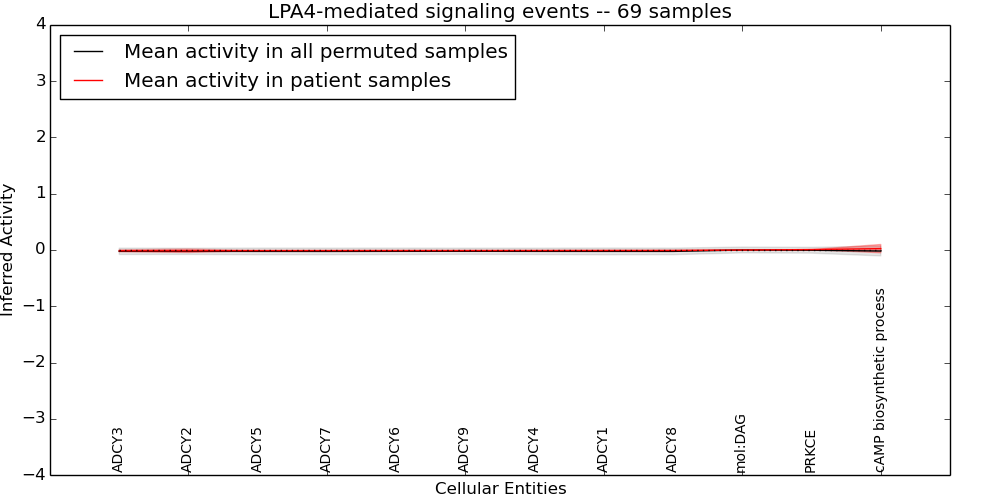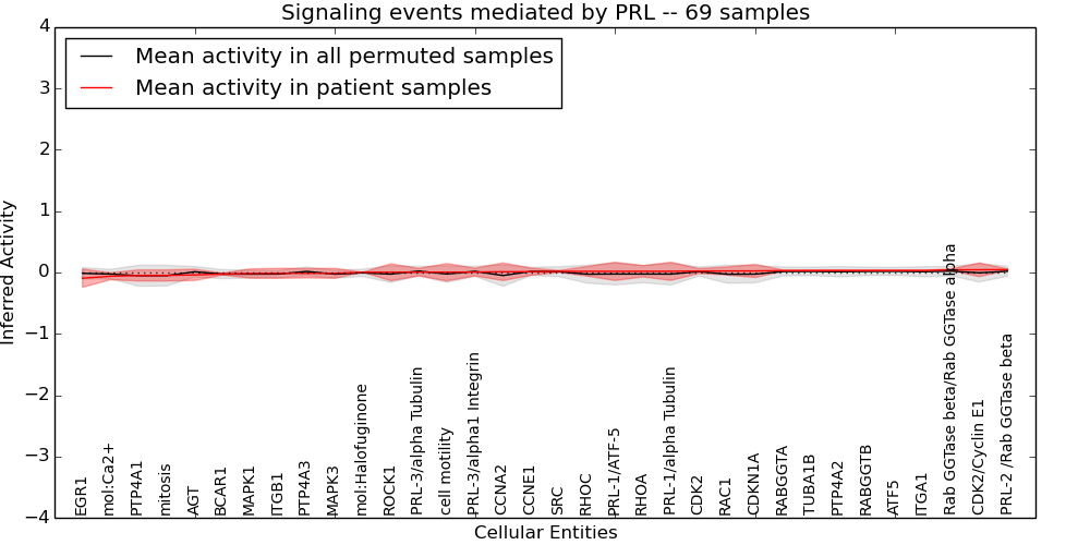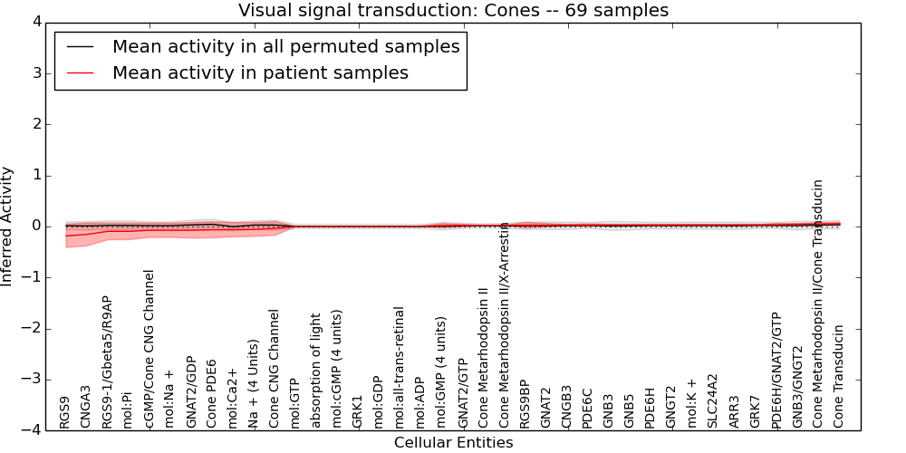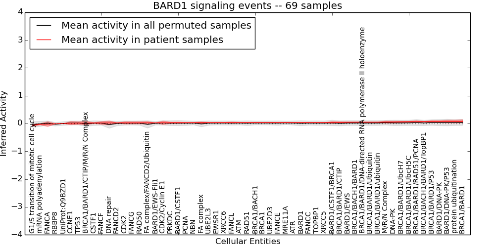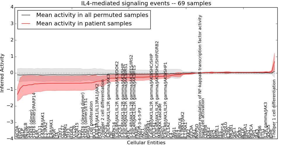 Figure S131. Get High-res Image This plot shows pathway concept perturbations across all samples against a permutation model. The concepts along the x-axis are sorted by lowest to highest mean activity for the real patient samples. Mean inferred activities are plotted along the y-axis as a colored band showing the average level and one standard deviation range. Real samples are shown in red and permuted samples in black.