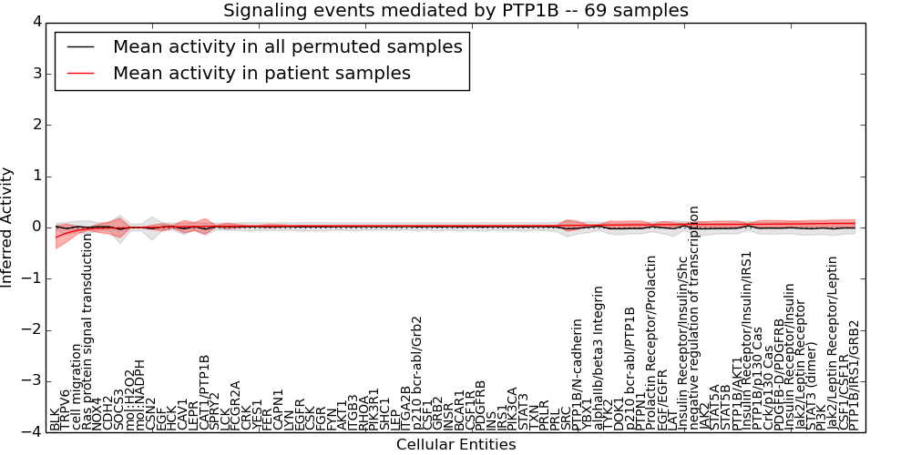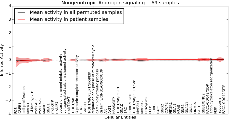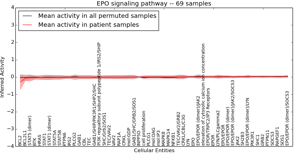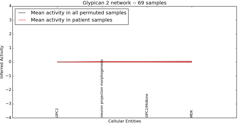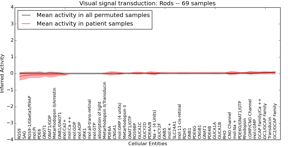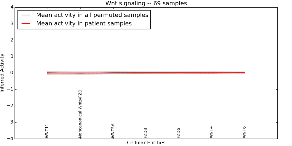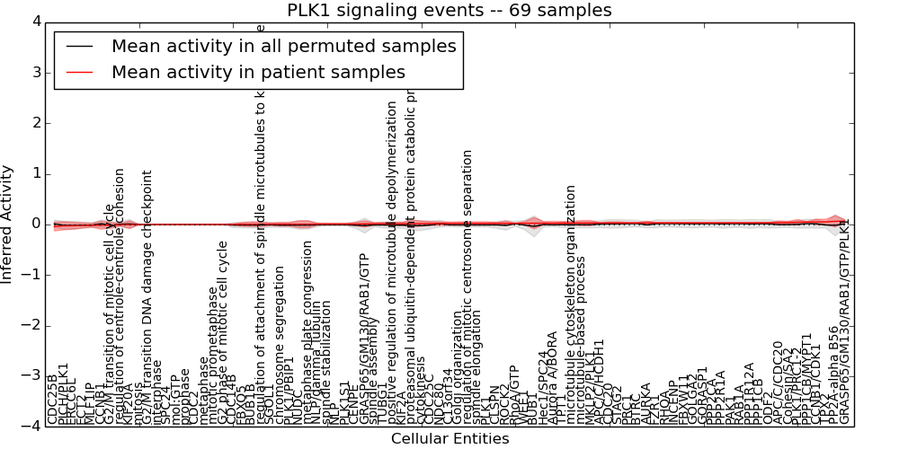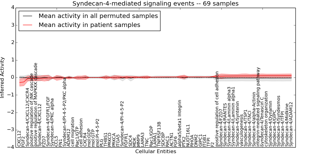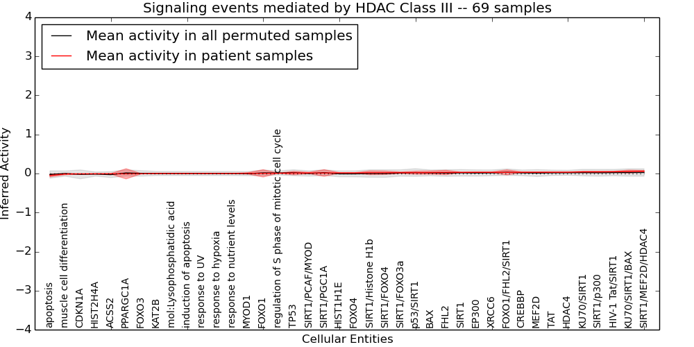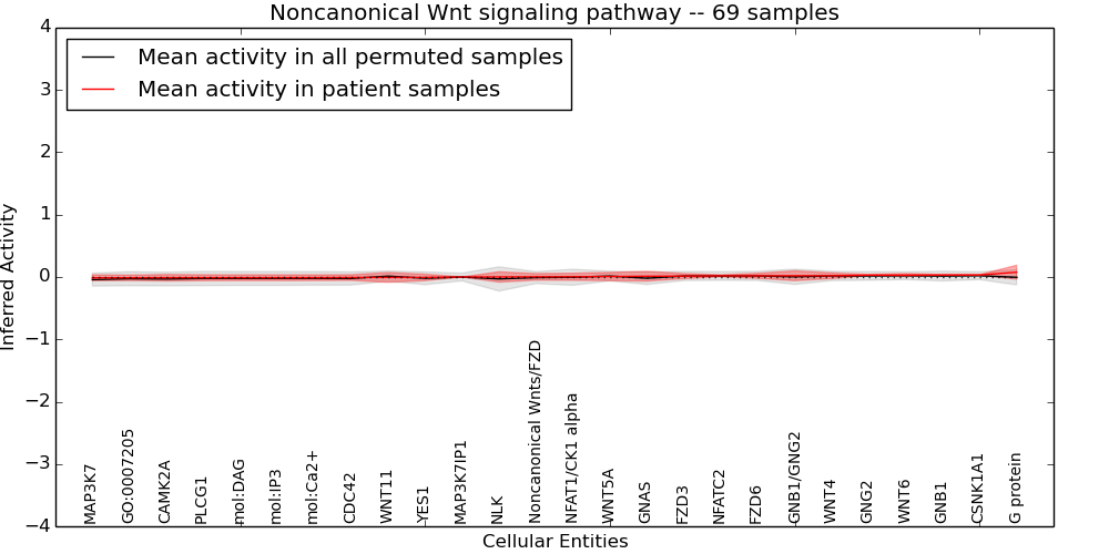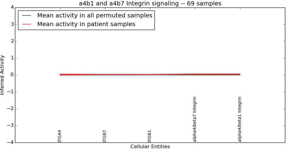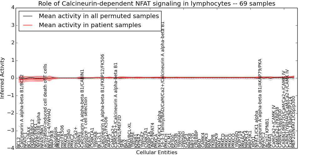 Figure S131. Get High-res Image This plot shows pathway concept perturbations across all samples against a permutation model. The concepts along the x-axis are sorted by lowest to highest mean activity for the real patient samples. Mean inferred activities are plotted along the y-axis as a colored band showing the average level and one standard deviation range. Real samples are shown in red and permuted samples in black.