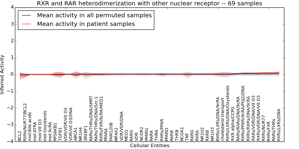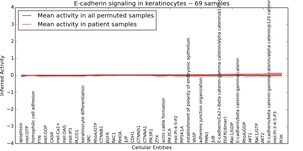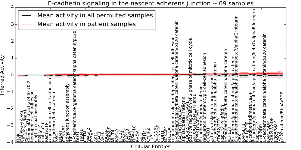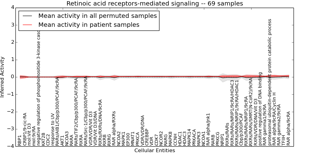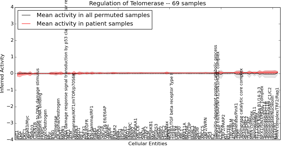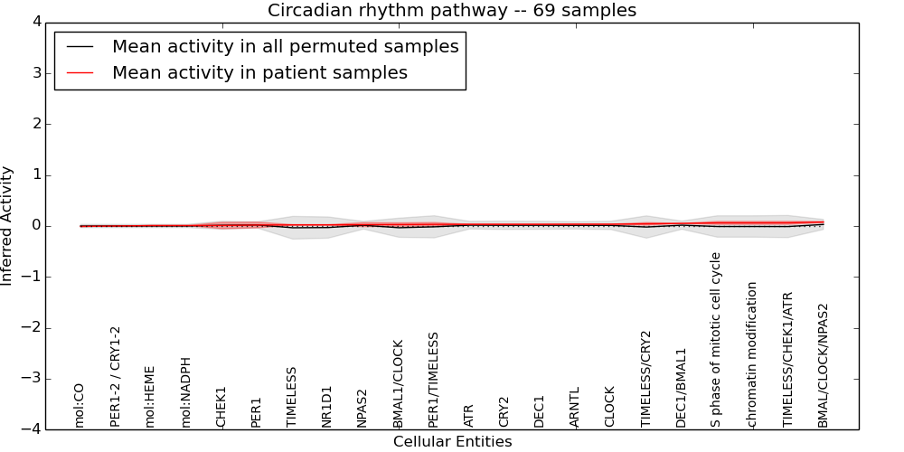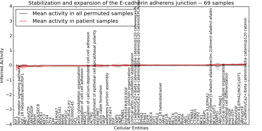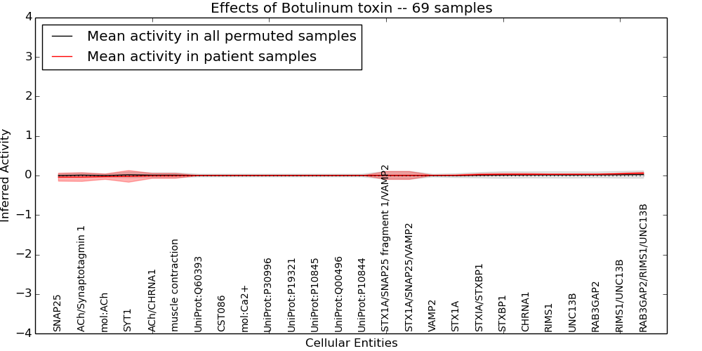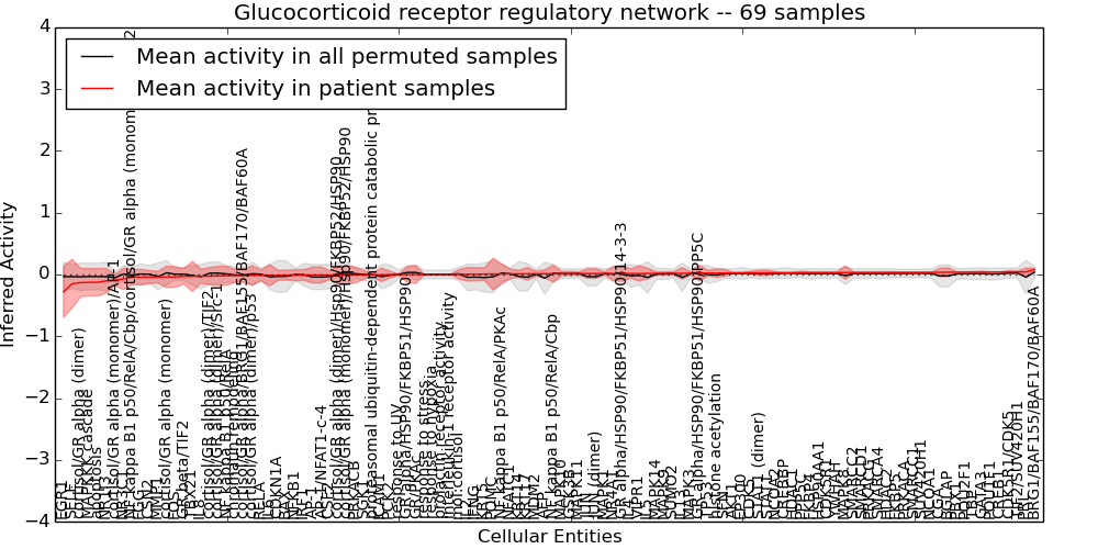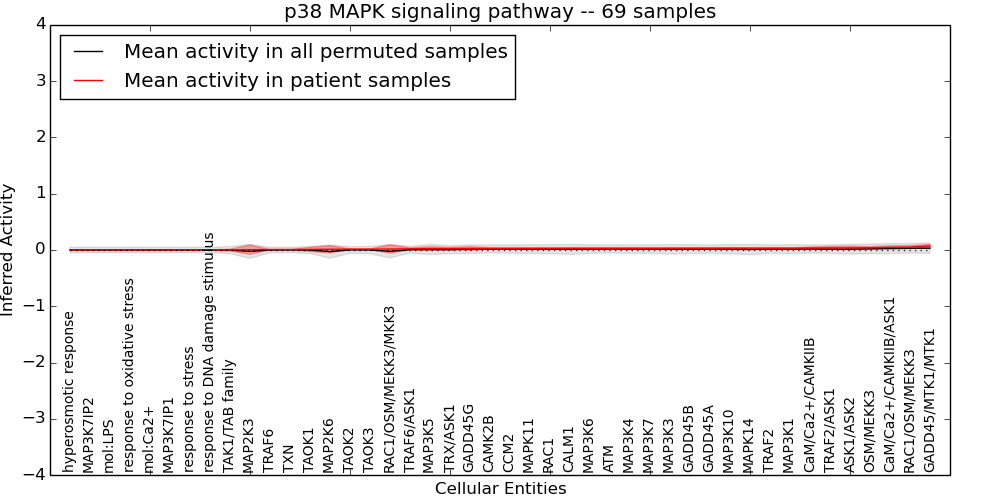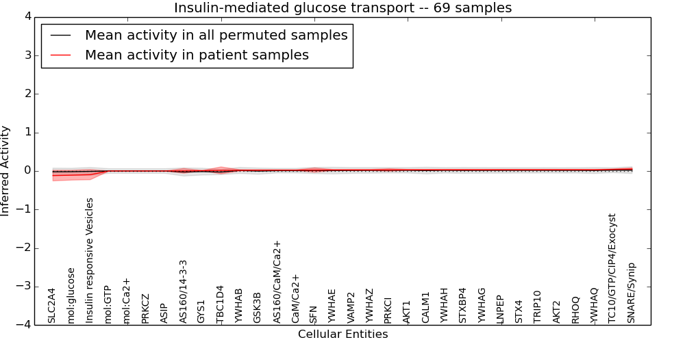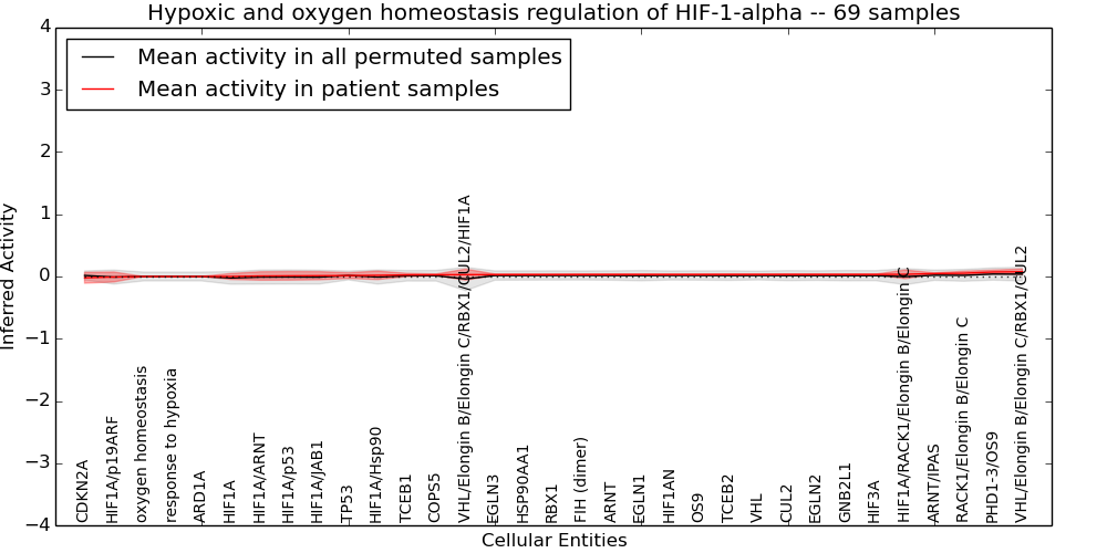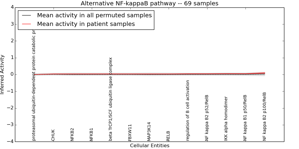 Figure S131. Get High-res Image This plot shows pathway concept perturbations across all samples against a permutation model. The concepts along the x-axis are sorted by lowest to highest mean activity for the real patient samples. Mean inferred activities are plotted along the y-axis as a colored band showing the average level and one standard deviation range. Real samples are shown in red and permuted samples in black.