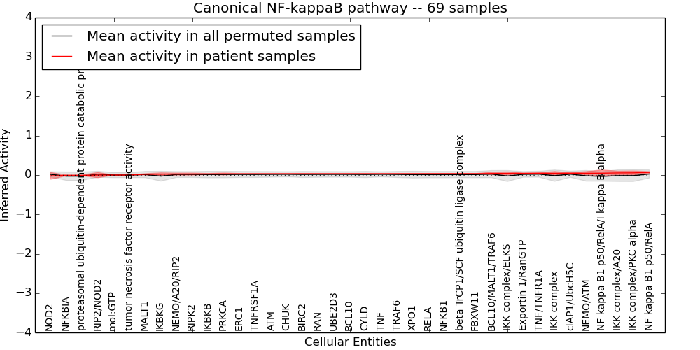 Figure S130. Get High-res Image This plot shows pathway concept perturbations across all samples against a permutation model. The concepts along the x-axis are sorted by lowest to highest mean activity for the real patient samples. Mean inferred activities are plotted along the y-axis as a colored band showing the average level and one standard deviation range. Real samples are shown in red and permuted samples in black.