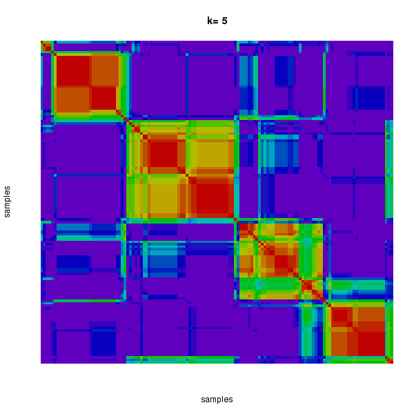 Figure 4. Get High-res Image The consensus matrix after clustering shows 5 clusters with limited overlap between clusters.