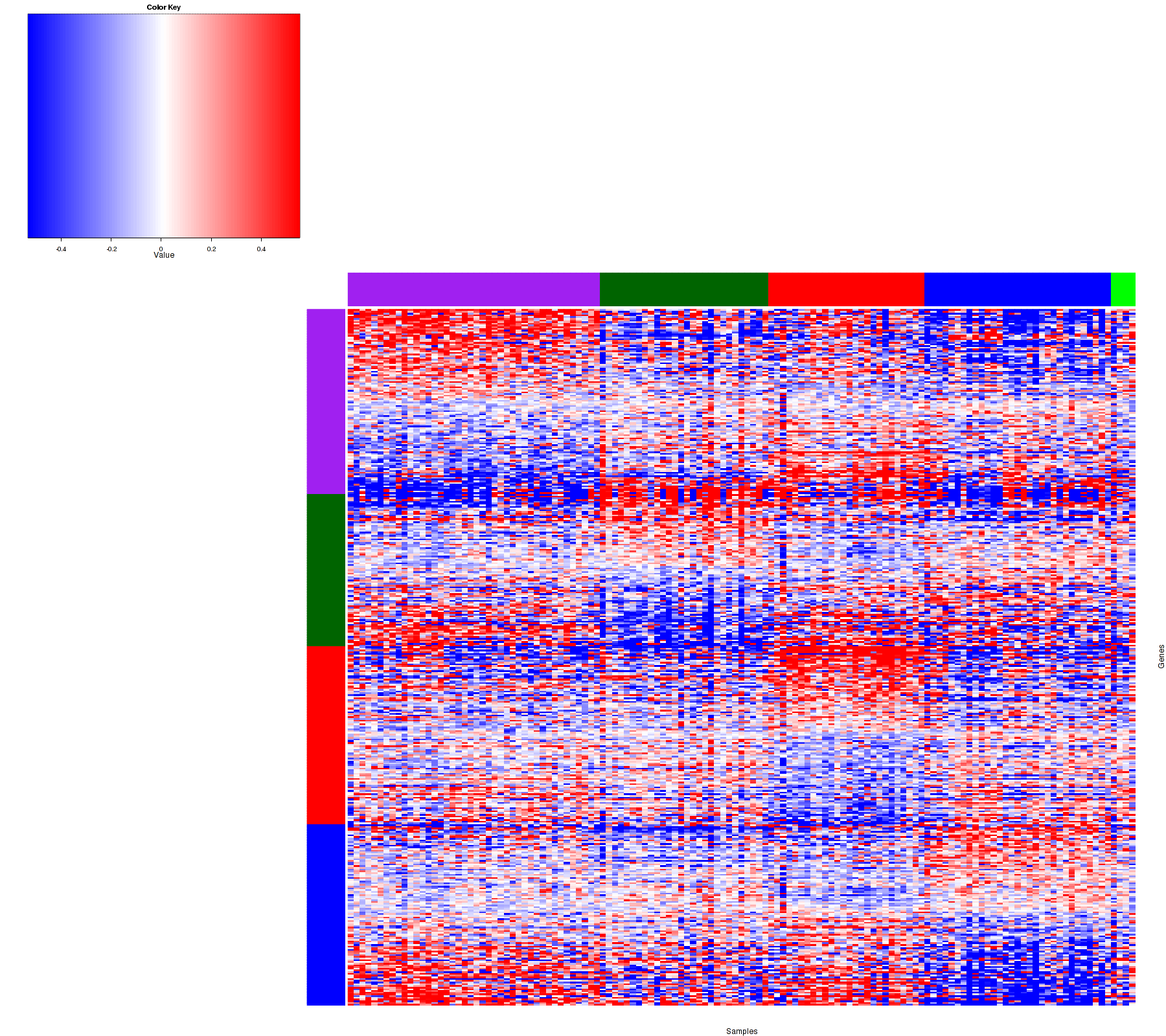 Figure 1. Get High-res Image Samples were separated into 5 clusters. Shown are 131 samples and 407 marker proteins. The color bar of the row indicates the marker proteins for the corresponding cluster.